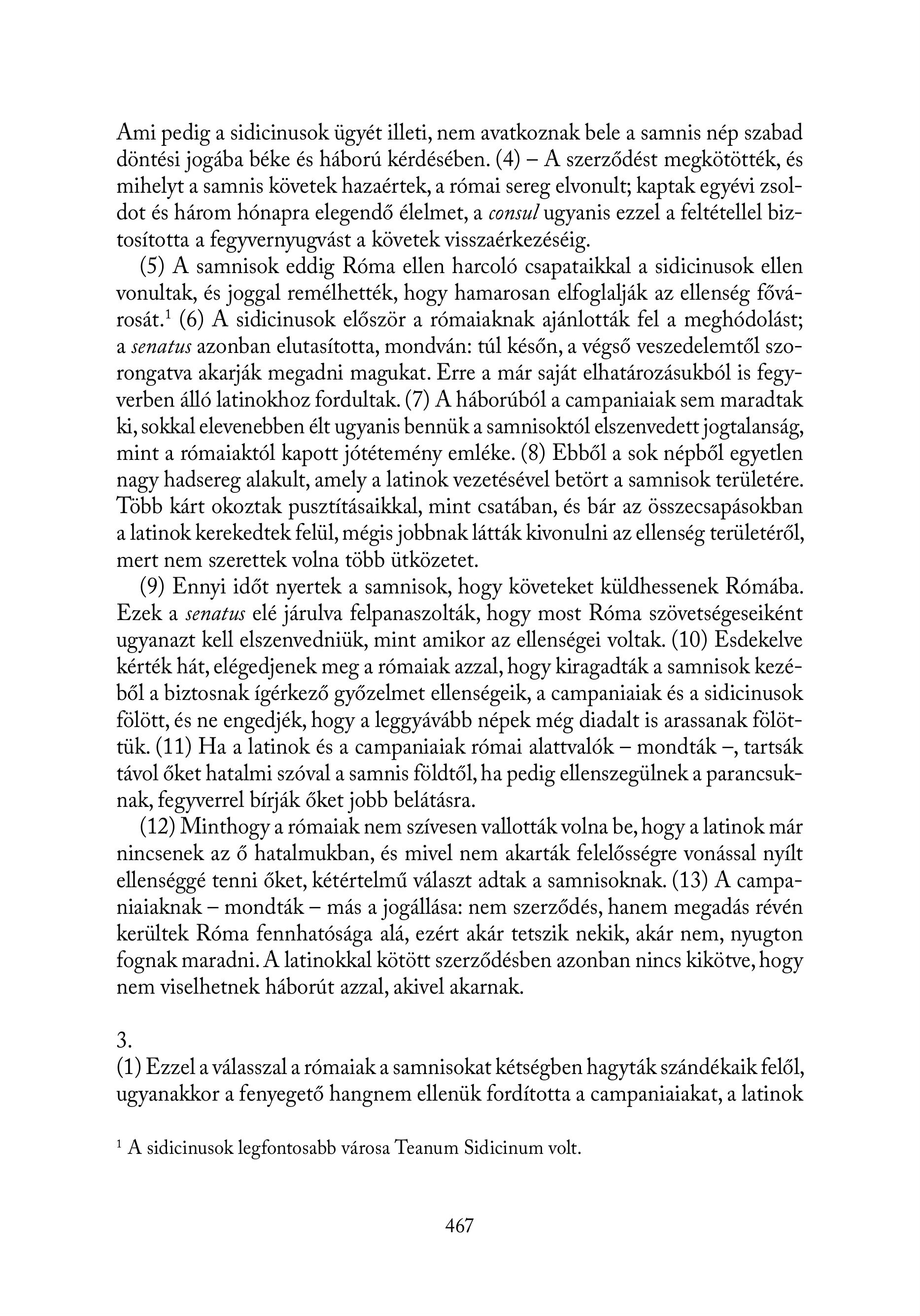Ami pedig a sidicinusok ügyét illeti, nem avatkoznak bele a samnis nép szabad döntési jogába béke és háború kérdésében. (4) — A szerződést megkötötték, és mihelyt a samnis követek hazaértek, a római sereg elvonult; kaptak egyévi zsoldot és három hónapra elegendő élelmet, a consul ugyanis ezzel a feltétellel biztosította a fegyvernyugvást a követek visszaérkezéséig. (5) A samnisok eddig Róma ellen harcoló csapataikkal a sidicinusok ellen vonultak, és joggal remélhették, hogy hamarosan elfoglalják az ellenség fővárosát." (6) A sidicinusok először a rómaiaknak ajánlották fel a meghódolást; a senatus azonban elutasította, mondván: túl későn, a végső veszedelemtől szorongatva akarják megadni magukat. Erre a már saját elhatározásukból is fegyverben álló latinokhoz fordultak. (7) A háborúból a campaniaiak sem maradtak ki, sokkal elevenebben élt ugyanis bennük a samnisoktól elszenvedett jogtalanság, mint a rómaiaktól kapott jótétemény emléke. (8) Ebből a sok népből egyetlen nagy hadsereg alakult, amely a latinok vezetésével betört a samnisok területére. Több kárt okoztak pusztításaikkal, mint csatában, és bár az összecsapásokban a latinok kerekedtek felül, mégis jobbnak látták kivonulni az ellenség területéről, mert nem szerettek volna több ütközetet. (9) Ennyi időt nyertek a samnisok, hogy követeket küldhessenek Rómába. Ezek a senatus elé jarulva felpanaszoltak, hogy most Róma szövetségeseiként ugyanazt kell elszenvedniük, mint amikor az ellenségei voltak. (10) Esdekelve kérték hát, elégedjenek meg a rómaiak azzal, hogy kiragadták a samnisok kezéből a biztosnak ígérkező győzelmet ellenségeik, a campaniaiak és a sidicinusok fölött, és ne engedjék, hogy a leggyávább népek még diadalt is arassanak fölöttük. (11) Ha a latinok és a campaniaiak római alattvalók — mondták -, tartsák távol őket hatalmi szóval a samnis földtől, ha pedig ellenszegülnek a parancsuknak, fegyverrel bírják őket jobb belátásra. (12) Minthogy a rómaiak nem szívesen vallották volna be, hogy a latinok már nincsenek az ő hatalmukban, és mivel nem akarták felelősségre vonással nyílt ellenséggé tenni őket, kétértelmű választ adtak a samnisoknak. (13) A campaniaiaknak — mondták — más a jogállása: nem szerződés, hanem megadás révén kerültek Róma fennhatósága alá, ezért akár tetszik nekik, akár nem, nyugton fognak maradni. A latinokkal kötött szerződésben azonban nincs kikötve, hogy nem viselhetnek háborút azzal, akivel akarnak. 3. (1) Ezzel a válasszal a rómaiak a samnisokat kétségben hagyták szándékaik felől, ugyanakkor a fenyegető hangnem ellenük fordította a campaniaiakat, a latinok 1 A sidicinusok legfontosabb vârosa Teanum Sidicinum volt. 8 467