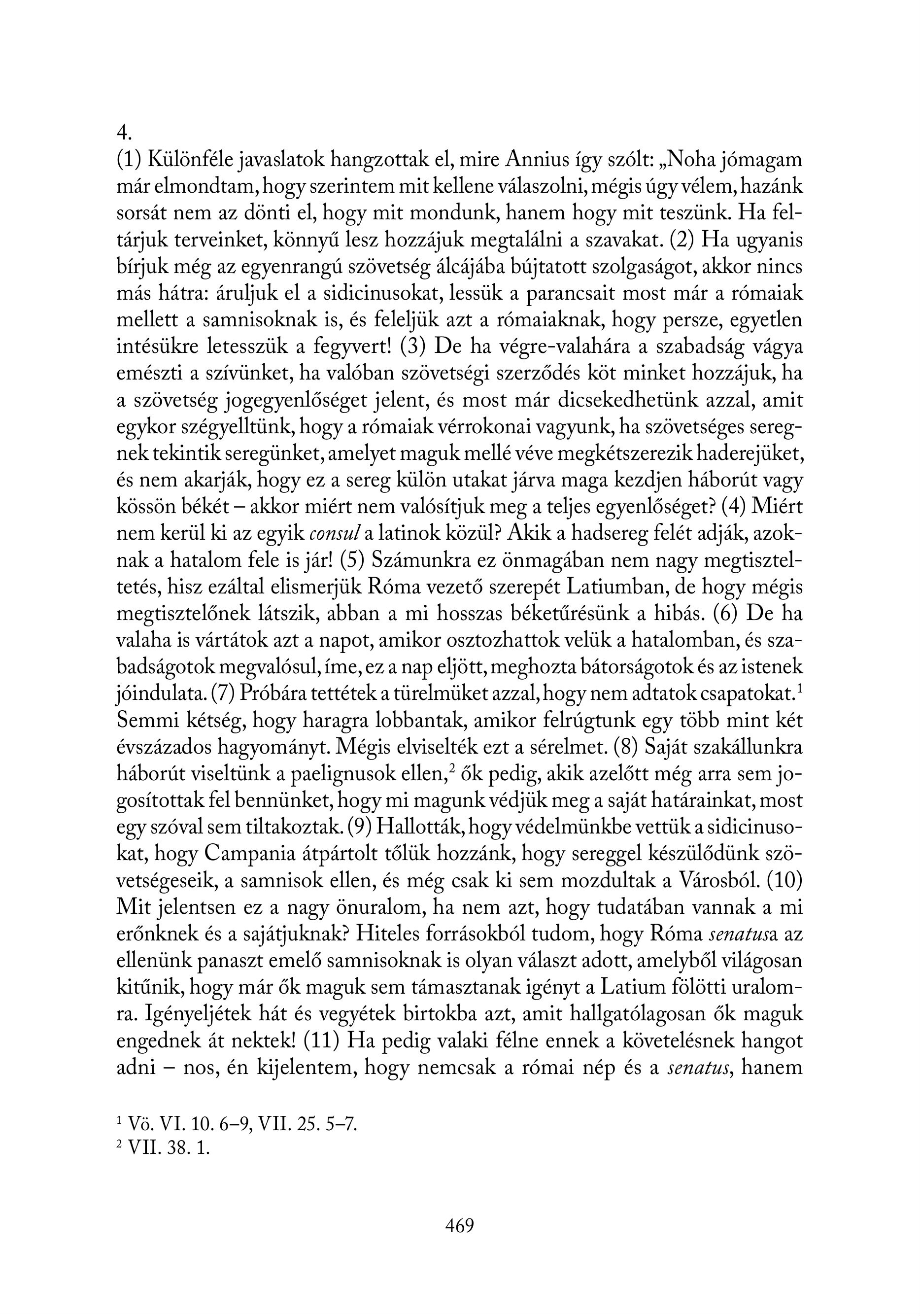 4. (1) Különféle javaslatok hangzottak el, mire Annius így szólt: , Noha jómagam már elmondtam, hogy szerintem mit kellene válaszolni, mégis úgy vélem, hazánk sorsát nem az dönti el, hogy mit mondunk, hanem hogy mit teszünk. Ha feltárjuk terveinket, könnyű lesz hozzájuk megtalálni a szavakat. (2) Ha ugyanis bírjuk még az egyenrangú szövetség álcájába bújtatott szolgaságot, akkor nincs más hátra: áruljuk el a sidicinusokat, lessük a parancsait most már a rómaiak mellett a samnisoknak is, és feleljük azt a rómaiaknak, hogy persze, egyetlen intésükre letesszük a fegyvert! (3) De ha végre-valahára a szabadság vágya emészti a szívünket, ha valóban szövetségi szerződés köt minket hozzájuk, ha a szövetség jogegyenlőséget jelent, és most már dicsekedhetünk azzal, amit egykor szégyelltünk, hogy a rómaiak vérrokonai vagyunk, ha szövetséges seregnek tekintik seregünket, amelyet maguk mellé véve megkétszerezik haderejüket, és nem akarják, hogy ez a sereg külön utakat járva maga kezdjen háborút vagy kössön békét — akkor miért nem valósítjuk meg a teljes egyenlőséget? (4) Miért nem kerül ki az egyik consul a latinok közül? Akik a hadsereg felét adják, azoknak a hatalom fele is jár! (5) Számunkra ez önmagában nem nagy megtiszteltetés, hisz ezáltal elismerjük Róma vezető szerepét Latiumban, de hogy mégis megtisztelőnek látszik, abban a mi hosszas béketűrésünk a hibás. (6) De ha valaha is vártátok azt a napot, amikor osztozhattok velük a hatalomban, és szabadságotok megvalósul, íme, ez a nap eljött, meghozta bátorságotok és az istenek jóindulata. (7) Próbára tettétek a türelmüket azzal, hogy nem adtatok csapatokat. Semmi kétség, hogy haragra lobbantak, amikor felrúgtunk egy több mint két évszázados hagyományt. Mégis elviselték ezt a sérelmet. (8) Saját szakállunkra háborút viseltünk a paelignusok ellen,? ők pedig, akik azelőtt még arra sem jogosítottak fel bennünket, hogy mi magunk védjük meg a saját határainkat, most egy szóval sem tiltakoztak. (9) Hallották, hogy védelmünkbe vettük a sidicinusokat, hogy Campania átpártolt tőlük hozzánk, hogy sereggel készülődünk szövetségeseik, a samnisok ellen, és még csak ki sem mozdultak a Városból. (10) Mit jelentsen ez a nagy önuralom, ha nem azt, hogy tudatában vannak a mi erőnknek és a sajátjuknak? Hiteles forrásokból tudom, hogy Róma senazusa az ellenünk panaszt emelő samnisoknak is olyan választ adott, amelyből világosan kitűnik, hogy már ők maguk sem támasztanak igényt a Latium fölötti uralomra. Igényeljétek hát és vegyétek birtokba azt, amit hallgatólagosan ők maguk engednek át nektek! (11) Ha pedig valaki félne ennek a követelésnek hangot adni — nos, én kijelentem, hogy nemcsak a római nép és a senazus, hanem ! Vö. VI. 10. 6-9, VII. 25. 5—7. 2 VIL 38. 1. 469