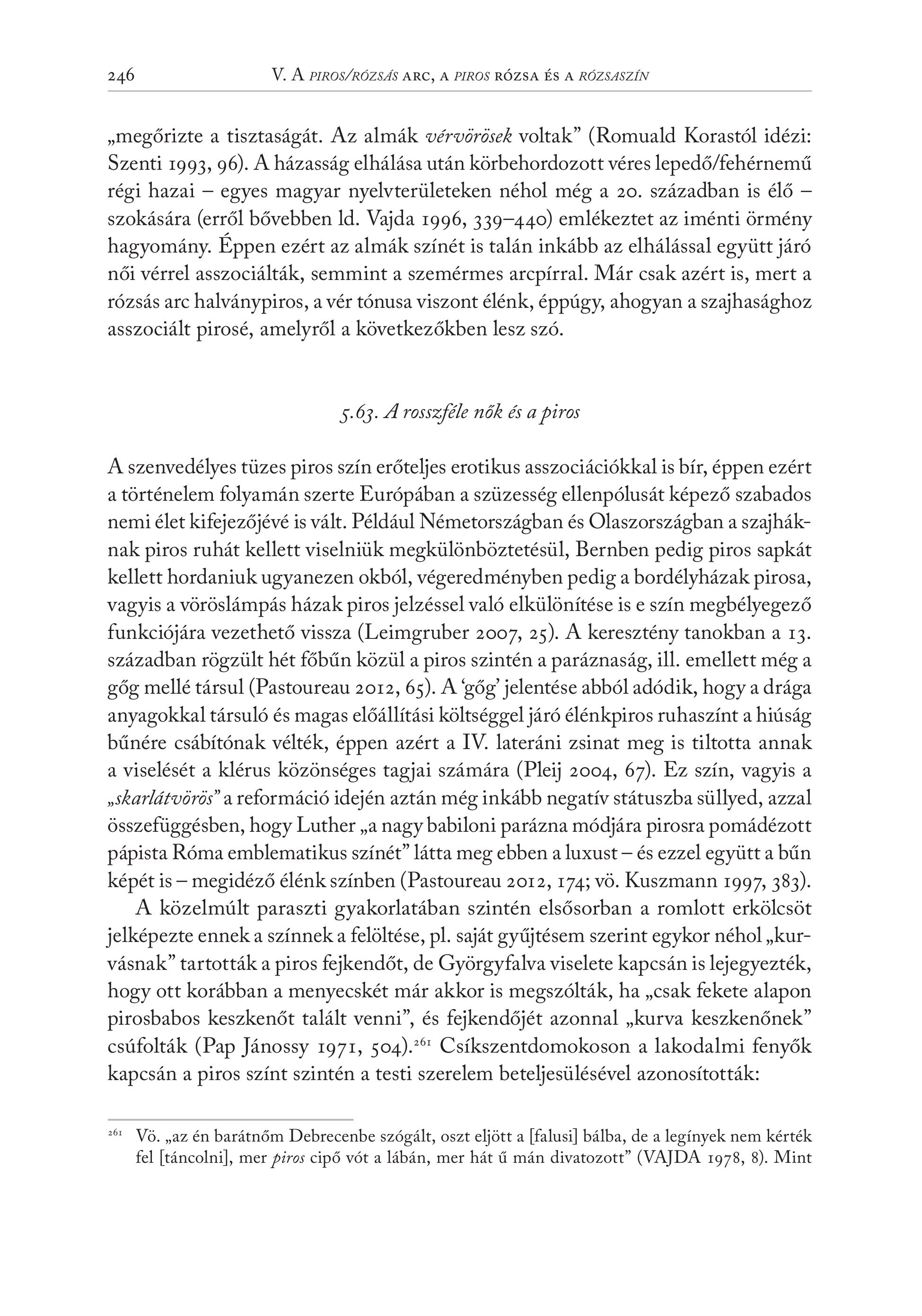 246 V. A PIROS/ROZSAS ARC, A PIROS RÓZSA ÉS A RÓZSASZÍN , megőrizte a tisztaságát. Az almák vérvőrösek voltak" (Romuald Korastól idézi: Szenti 1993, 96). A házasság elhálása után körbehordozott véres lepedő/fehérnemű régi hazai — egyes magyar nyelvterületeken néhol még a 20. században is élő — szokására (erről bővebben Id. Vajda 1996, 339—440) emlékeztet az iménti örmény hagyomány. Éppen ezért az almák színét is talán inkább az elhálással együtt járó női vérrel asszociálták, semmint a szemérmes arcpírral. Már csak azért is, mert a rózsás arc halványpiros, a vér tónusa viszont élénk, éppúgy, ahogyan a szajhasághoz asszociált pirosé, amelyről a következőkben lesz szó. 5.63. A rosszféle nők és a piros A szenvedélyes tüzes piros szín erőteljes erotikus asszociációkkal is bír, éppen ezért a történelem folyamán szerte Európában a szüzesség ellenpólusát képező szabados nemi élet kifejezőjévé is vált. Például Németországban és Olaszországban a szajháknak piros ruhát kellett viselniük megkülönböztetésül, Bernben pedig piros sapkát kellett hordaniuk ugyanezen okból, végeredményben pedig a bordélyházak pirosa, vagyis a vöröslámpás házak piros jelzéssel való elkülönítése is e szín megbélyegező funkciójára vezethető vissza (Leimgruber 2007, 25). A keresztény tanokban a 13. században rögzült hét főbűn közül a piros szintén a paráznaság, ill. emellett még a gőg mellé társul (Pastoureau 2012, 65). A gőg jelentése abból adódik, hogy a drága anyagokkal társuló és magas előállítási költséggel járó élénkpiros ruhaszínt a hiúság bűnére csábítónak vélték, éppen azért a IV. lateráni zsinat meg is tiltotta annak a viselését a klérus közönséges tagjai számára (Pleij 2004, 67). Ez szín, vagyis a , skarlátvörös" a reformáció idején aztán még inkább negatív státuszba süllyed, azzal összefüggésben, hogy Luther , a nagy babiloni parázna módjára pirosra pomádézott pápista Róma emblematikus színét" látta meg ebben a luxust — és ezzel együtt a bűn képét is — megidéző élénk színben (Pastoureau 2012, 174; v6. Kuszmann 1997, 383). A közelmúlt paraszti gyakorlatában szintén elsősorban a romlott erkölcsöt jelképezte ennek a színnek a felöltése, pl. saját gyűjtésem szerint egykor néhol , kurvásnak?" tartották a piros fejkendőt, de Györgyfalva viselete kapcsán is lejegyezték, hogy ott korábban a menyecskét már akkor is megszólták, ha , csak fekete alapon pirosbabos keszkenőt talált venni", és fejkendőjét azonnal ,kurva keszkenőnek" csúfolták (Pap Janossy 1971, 504).** kapcsán a piros színt szintén a testi szerelem beteljesülésével azonosították: Csikszentdomokoson a lakodalmi fenyék 261 Vo. ,az én barátnőm Debrecenbe szógált, oszt eljött a [falusi] bálba, de a legínyek nem kérték fel [táncolni], mer piros cipő vót a lábán, mer hát ű mán divatozott" (VAJDA 1978, 8). Mint