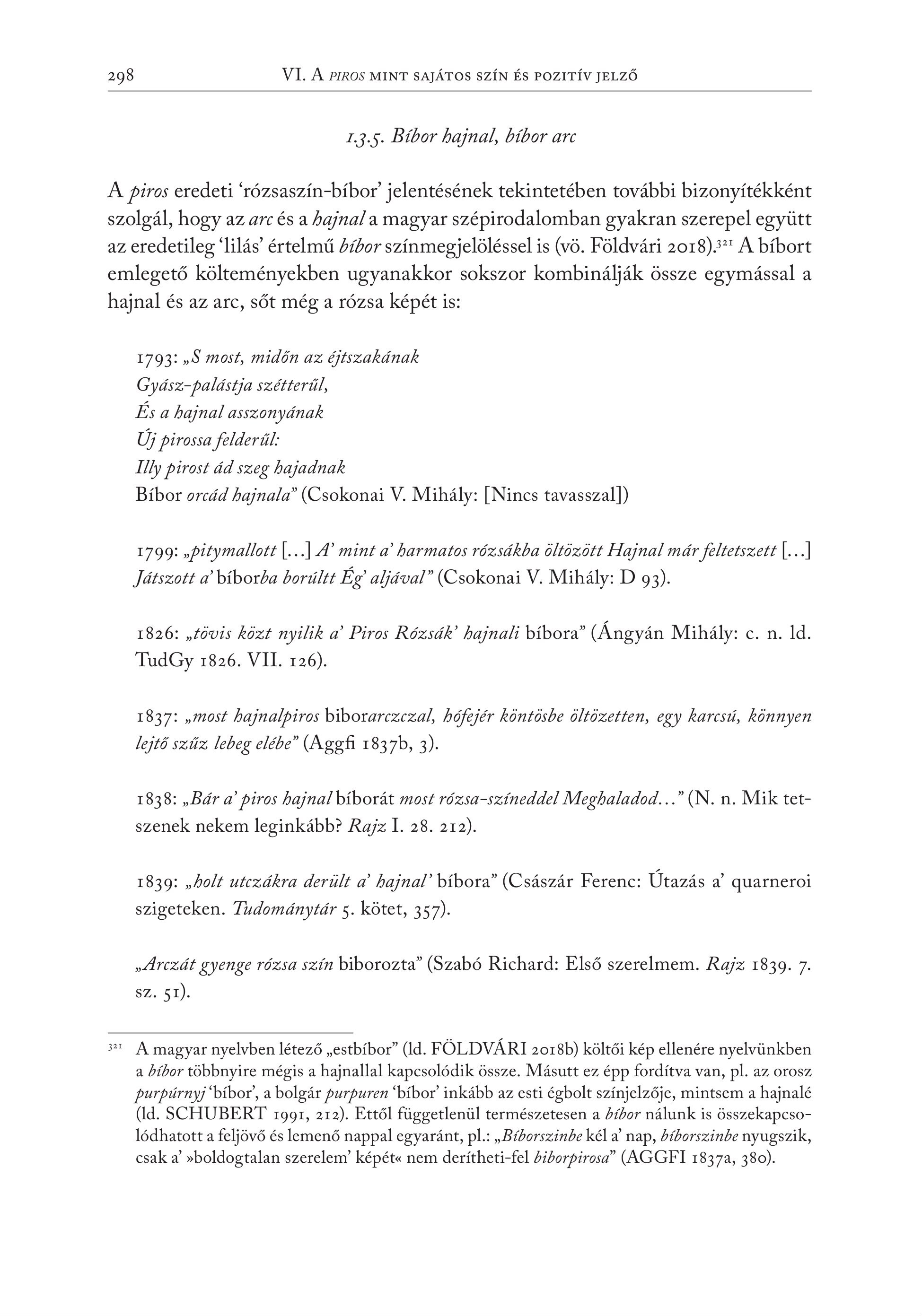 I.3.5. Bíbor hajnal, bíbor arc 1793: ,9 most, midôn az éjtszakának Gyász-palástja szétterűl, És a hajnal asszonyának Új pirossa felderűl: Illy pirost ád szeg hajadnak Bíbor orcád hajnala" (Csokonai V. Mihály: [Nincs tavasszal]) 1799: Ppitymallott [...] 4" mint a" harmatos rózsákba öltözött Hajnal már feltetszett [...] Játszott a bíborba borúltt Ég" aljával" (Csokonai V. Mihály: D 93). 1826: tövis közt nyilik a" Piros Rózsák" hajnali bibora” (Ängyän Mihäly: c. n. Id. TudGy 1826. VII. 126). 1837: , most hajnalpiros biborarczczal, bófejér köntösbe öltözetten, egy karcsú, könnyen lejtő szűz lebeg elébe" (Aggfi 1837b, 3). 1838: „Bär a’ piros hajnal biborat most rézsa-szineddel Meghaladod...” (N. n. Mik tetszenek nekem leginkább? Rajz I. 28. 212). 1839: „holt utezäkra derült a’ hajnal’ bibora” (Csäszär Ferenc: Utazäs a’ quarneroi szigeteken. Tudomänytar 5. kôtet, 357). „Arczät gyenge rözsa szin biborozta” (Szabö Richard: Első szerelmem. Rajz 1839. 7. sz. 51). A magyar nyelvben létező , estbíbor" (Id. FÖLDVÁRI 2or8b) költői kép ellenére nyelvünkben a bíbor többnyire mégis a hajnallal kapcsolódik össze. Másutt ez épp fordítva van, pl. az orosz Purpúrnyj bíbor, a bolgár purpuren "bíbor" inkább az esti égbolt színjelzője, mintsem a hajnalé (Id. SCHUBERT 1991, 212). Ettöl függetlenül termeszetesen a bibor nälunk is összekapcsolödhatott a feljövö és lemenő nappal egyaránt, pl.: , Bíborszinbe kél a" nap, bíborszinbe nyugszik, csak a’ »boldogtalan szerelem’ k&pet« nem deritheti-fel biborpirosa” (AGGFI 1837a, 380).