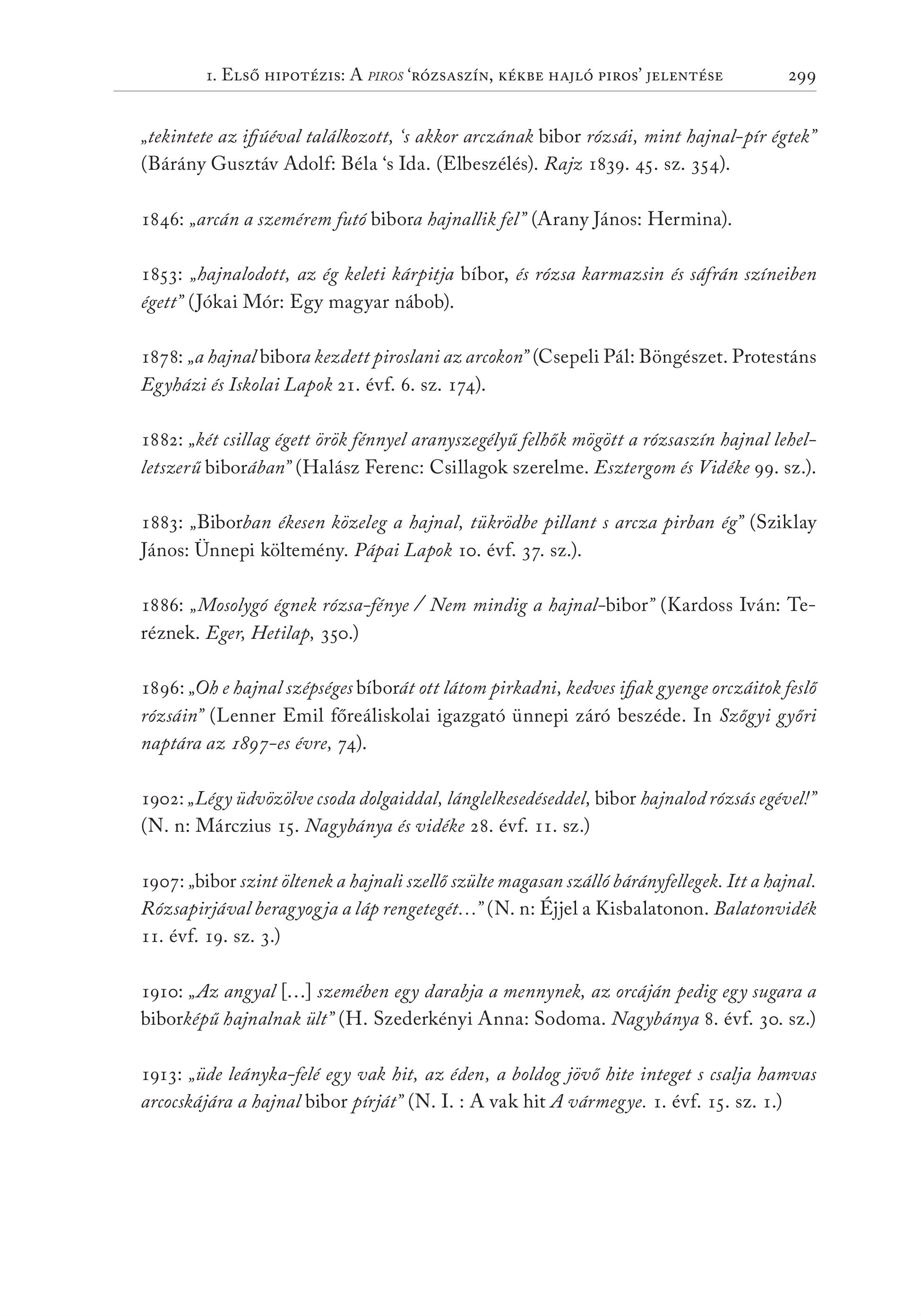 I. ELSŐ HIPOTÉZIS: A PIROS ‘ROZSASZIN, KEKBE HAJLO PIROS" JELENTÉSE 299 , tekintete az ifjúéval találkozott, 5 akkor arczának bibor rózsái, mint hajnal-pir égtek" (Bárány Gusztáv Adolf: Béla ss Ida. (Elbeszélés). Rajz 1839. 45. sz. 354). 1846: , arcán a szemérem futó bibora hajnallik fe!" (Arany János: Hermina). 1853: , hajnalodott, az ég keleti kárpitja bíbor, és rózsa karmazsin és sáfrán színeiben égett" (Jókai Mór: Egy magyar nábob). 1878: , a hajnal bibora kezdett piroslani az arcokon" (Csepeli Pál: Böngészet. Protestáns Egybázi és Iskolai Lapok 21. évf. 6. sz. 174). 1882: , két csillag égett örök fénnyel aranyszegélyű felhők mögött a rózsaszín hajnal lehelletszerü biboräban” (Haläsz Ferenc: Csillagok szerelme. Esztergom és Vidéke 99. sz.). 1883: ,BiborZan ékesen közeleg a hajnal, tükrödbe pillant s arcza pirban ég? (Sziklay János: Ünnepi költemény. Pápai Lapok 10. évf. 37. sz.). 1886: , Mosolygó égnek rózsa-fénye / Nem mindig a hajnal-bibor” (Kardoss Ivan: Teréznek. Eger, Hetilap, 350.) 1896: , 02 e hajnal szépséges bíboráz ozz látom pirkadni, kedves ipak gyenge orczditok feslö rözsdin” (Lenner Emil föreäliskolai igazgató ünnepi záró beszéde. In Szógyi győri naptára az 1897-es évre, 74). 1902: , Légy üdvözölve csoda dolgaiddal, lánglelkesedéseddel, bibor hajnalod rézsas egevel!” (N. n: Märczius 15. Nagybánya és vidéke 28. évf. 11. sz.) 1907: „bibor szinz öltenek a hajnali szellő szülte magasan szálló bárányfellegek. Itt a hajnal. Rözsapirjäval beragyogja a lap rengetegét...”(N. n: Ejjel a Kisbalatonon. Balatonvidek II. évf. 19. sz. 3.) 1910: , Az angyal [...] szemében egy darabja a mennynek, az orcáján bedig egy sugara a biborképű hajnalnak ult” (H. Szederkényi Anna: Sodoma. Nagybánya 8. évf. 30. sz.) I9I3: , üde leányka-felé egy vak hit, az éden, a boldog jövő bite integet s csalja hamvas arcocskájára a hajnal bibor pírját" (N. I. : A vak hit 4 vármegye. 1. évf. 15. sz. I.)