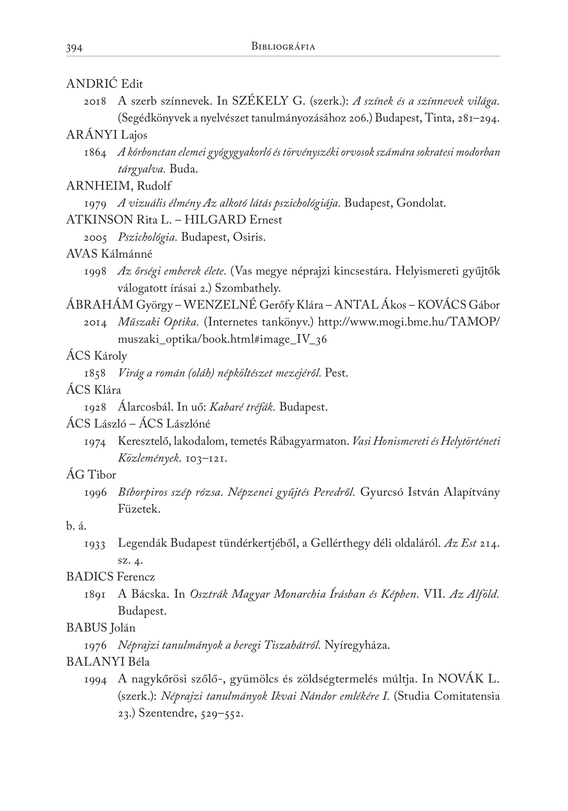 394 BIBLIOGRÁFIA ANDRIC Edit 2018 A szerb színnevek. In SZÉKELY G. (szerk.): A szinek es a szinnevek világa. (Segédkönyvek a nyelvészet tanulmányozásához 206.) Budapest, Tinta, 281—294. ARÁNYI Lajos 1864 A körbonctan elemei gyögygyakorlö és törvényszéki orvosok számára sokratesi modorban tárgyalva. Buda. ARNHEIM, Rudolf 1979 4 vizuális élmény Az alkotó látás pszichológiája. Budapest, Gondolat. ATKINSON Rita L. - HILGARD Ernest 2005 Pszicholögia. Budapest, Osiris. AVAS Kálmánné 1998 Az őrségi emberek élete. (Vas megye néprajzi kincsestára. Helyismereti gyűjtők válogatott írásai 2.) Szombathely. ABRAHAM Gyérgy- WENZELNE Geréfy Klara— ANTAL Akos — KOVACS Gabor 2014 Műszaki Optika. (Internetes tankönyv.) http://www.mogi.bme.hu/TAMOP/ muszaki_optika/book.html#image_IV_36 ÄcS Käroly 1858 Virág a román (oláh) népköltészet mezejéről. Pest. ÁCS Klára 1928 Älarcosbäl. In uő: Kabaré tréfák. Budapest. ÁCS László - ÁCS Lászlóné 1974 Keresztelő, lakodalom, temetés Rábagyarmaton. Vasi Honismereti és Helytörténeti Közlemenyek. 103-121. ÁG Tibor 1996 Biborpiros szep rözsa. Népzenei gyűjtés Peredről. Gyurcsó István Alapítvány Füzetek. b. á. 1933 Legendák Budapest tündérkertjéből, a Gellérthegy déli oldaláról. Az Esz 214. SZ. 4. BADICS Ferencz 1891 A Bácska. In Oszírák Magyar Monarchia Írásban és Képben. VII. Az Alföla. Budapest. BABUS Jolán 1976 Néprajzi tanulmányok a beregi Tiszahátról. Nyíregyháza. BALANYI Béla 1994 A nagykőrösi szőlő-, gyümölcs és zöldségtermelés múltja. In NOVÁK L. (szerk.): Néprajzi tanulmányok Ikvai Nándor emlékére I. (Studia Comitatensia 23.) Szentendre, 529—552.