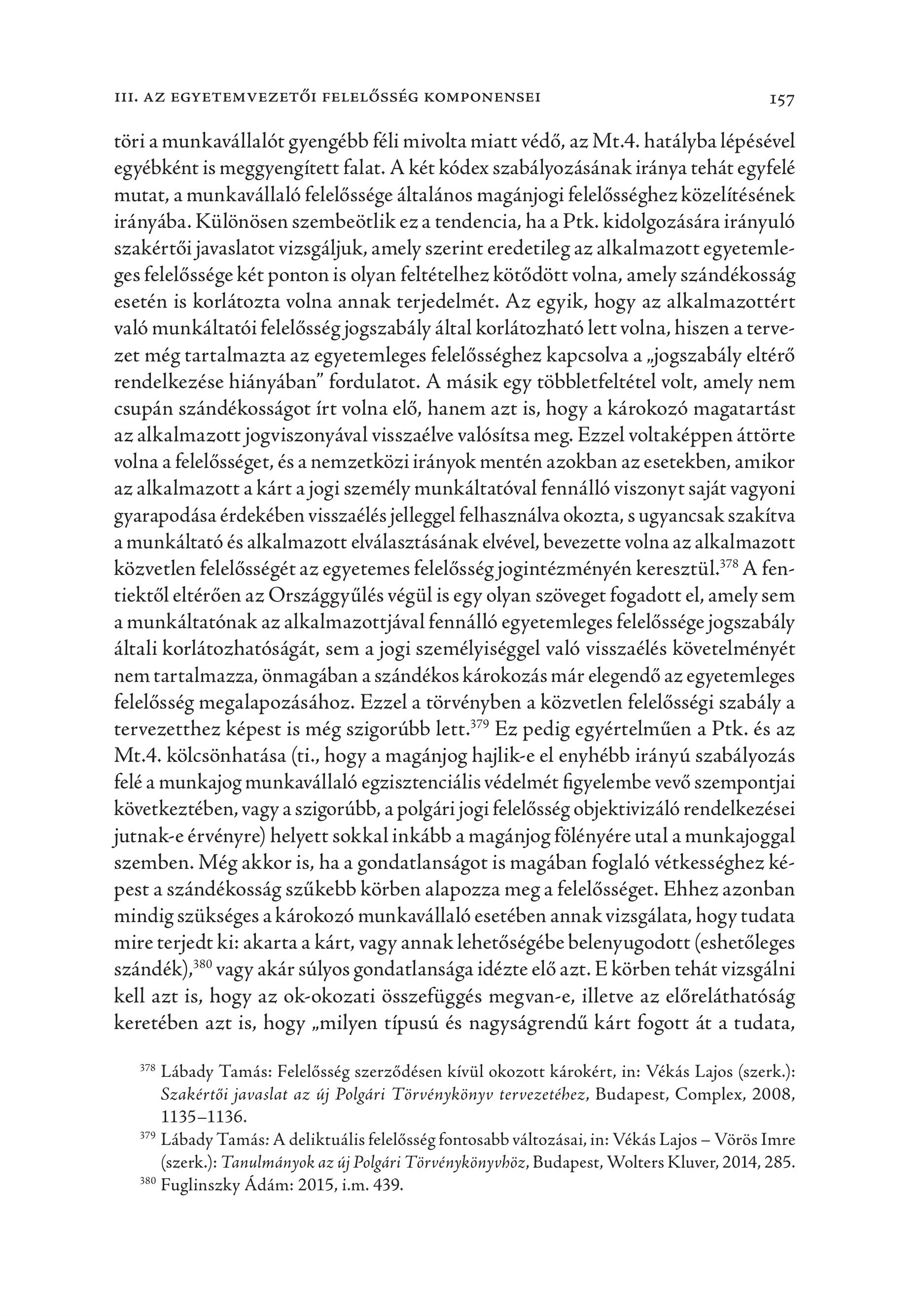 III, AZ EGYETEMVEZETŐI FELELŐSSÉG KOMPONENSEI 157 töri amunkavállalót gyengébb féli mivolta miatt védő, az Mt.4. hatályba lépésével egyébként is meggyengített falat. A két kódex szabályozásának iránya tehát egyfelé mutat, a munkavállaló felelőssége általános magánjogi felelősséghez közelítésének irányába. Különösen szembeötlik ez a tendencia, ha a Ptk. kidolgozására irányuló szakértői javaslatot vizsgáljuk, amely szerint eredetileg az alkalmazott egyetemleges felelőssége két ponton is olyan feltételhez kötődött volna, amely szándékosság esetén is korlátozta volna annak terjedelmét. Az egyik, hogy az alkalmazottért való munkáltatói felelősség jogszabály által korlátozható lett volna, hiszen a tervezet még tartalmazta az egyetemleges felelősséghez kapcsolva a , jogszabály eltérő rendelkezése hiányában" fordulatot. A másik egy többletfeltétel volt, amely nem csupán szándékosságot írt volna elő, hanem azt is, hogy a károkozó magatartást az alkalmazott jogviszonyával visszaélve valósítsa meg. Ezzel voltaképpen áttörte volna a felelősséget, és a nemzetközi irányok mentén azokban az esetekben, amikor az alkalmazott a kárt a jogi személy munkáltatóval fennálló viszonyt saját vagyoni gyarapodása érdekében visszaélés jelleggel felhasználva okozta, s ugyancsak szakítva a munkáltató és alkalmazott elválasztásának elvével, bevezette volna az alkalmazott közvetlen felelősségét az egyetemes felelősség jogintézményén keresztül." A fentiektől eltérően az Országgyűlés végül is egy olyan szöveget fogadott el, amely sem a munkáltatónak az alkalmazottjával fennálló egyetemleges felelőssége jogszabály általi korlátozhatóságát, sem a jogi személyiséggel való visszaélés követelményét nem tartalmazza, önmagában a szándékos károkozás már elegendő az egyetemleges felelősség megalapozásához. Ezzel a törvényben a közvetlen felelősségi szabály a tervezetthez képest is még szigorúbb lett." Ez pedig egyértelműen a Ptk. és az Mt.4. kölcsönhatása (ti., hogy a magánjog hajlik-e el enyhébb irányú szabályozás feléa munkajog munkavállaló egzisztenciális védelmét figyelembe vevő szempontjai következtében, vagy a szigorúbb, a polgári jogi felelősség objektivizáló rendelkezései jutnak-e érvényre) helyett sokkal inkább a magánjog fölényére utal a munkajoggal szemben. Még akkor is, ha a gondatlanságot is magában foglaló vétkességhez képest a szándékosság szűkebb körben alapozza meg a felelősséget. Ehhez azonban mindig szükséges a károkozó munkavállaló esetében annak vizsgálata, hogy tudata mire terjedt ki: akarta a kárt, vagy annak lehetőségébe belenyugodott (eshetőleges szándék), vagy akár súlyos gondatlansága idézte elő azt. E körben tehát vizsgálni kell azt is, hogy az ok-okozati összefüggés megvan-e, illetve az előreláthatóság keretében azt is, hogy , milyen típusú és nagyságrendű kárt fogott át a tudata, 378 Lábady Tamás: Felelősség szerződésen kívül okozott károkért, in: Vékás Lajos (szerk.): Szakértői javaslat az új Polgári Törvénykönyv tervezetébez, Budapest, Complex, 2008, 1135-1136. 39 Lábady Tamás: A deliktuális felelősség fontosabb változásai, in: Vékás Lajos — Vörös Imre (szerk.): Tanulmányok az új Polgári Törvénykönyvböz, Budapest, Wolters Kluver, 2014, 285. 380 Fuglinszky Ádám: 2015, i.m. 439.