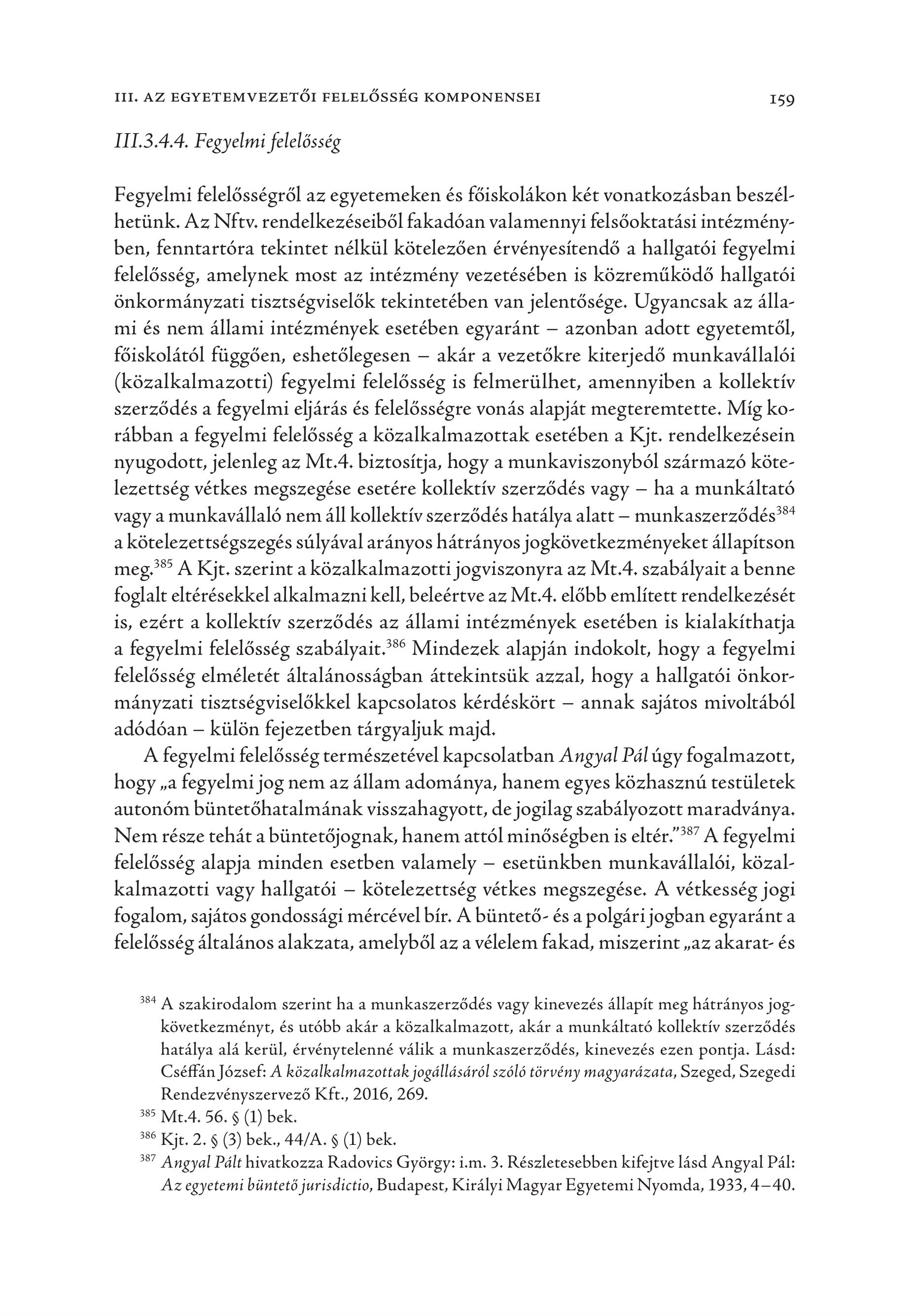 III, AZ EGYETEMVEZETŐI FELELŐSSÉG KOMPONENSEI 159 III.3.4.4. Fegyelmi felelősség Fegyelmi felelősségről az egyetemeken és főiskolákon két vonatkozásban beszél hetünk. Az Nftv. rendelkezéseiből fakadóan valamennyi felsőoktatási intézményben, fenntartóra tekintet nélkül kötelezően érvényesítendő a hallgatói fegyelmi felelősség, amelynek most az intézmény vezetésében is közreműködő hallgatói önkormányzati tisztségviselők tekintetében van jelentősége. Ugyancsak az állami és nem állami intézmények esetében egyaránt — azonban adott egyetemtől, főiskolától függően, eshetőlegesen — akár a vezetőkre kiterjedő munkavállalói (közalkalmazotti) fegyelmi felelősség is felmerülhet, amennyiben a kollektív szerződés a fegyelmi eljárás és felelősségre vonás alapját megteremtette. Míg korábban a fegyelmi felelősség a közalkalmazottak esetében a Kjt. rendelkezésein nyugodott, jelenleg az Mt.4. biztosítja, hogy a munkaviszonyból származó kötelezettség vétkes megszegése esetére kollektív szerződés vagy — ha a munkáltató vagy a munkavállaló nem áll kollektív szerződés hatálya alatt — munkaszerződés?" a kötelezettségszegés súlyával arányos hátrányos jogkövetkezményeket állapítson meg.’® A Kjt. szerint a közalkalmazotti jogviszonyra az Mt.4. szabályait a benne foglalt eltérésekkel alkalmazni kell, beleértve az Mt.4. előbb említett rendelkezését is, ezért a kollektív szerződés az állami intézmények esetében is kialakíthatja a fegyelmi felelősség szabályait." Mindezek alapján indokolt, hogy a fegyelmi felelősség elméletét általánosságban áttekintsük azzal, hogy a hallgatói önkormányzati tisztségviselőkkel kapcsolatos kérdéskört — annak sajátos mivoltából adódóan — külön fejezetben tárgyaljuk majd. A fegyelmi felelősség természetével kapcsolatban Angyal Pál úgy fogalmazott, hogy „a fegyelmi jog nem az állam adománya, hanem egyes közhasznú testületek autonóm büntetőhatalmának visszahagyott, de jogilag szabályozott maradványa. Nem része tehát a büntetőjognak, hanem attól minőségben is eltér.”**’ A fegyelmi felelősség alapja minden esetben valamely — esetünkben munkavállalói, közalkalmazotti vagy hallgatói — kötelezettség vétkes megszegése. A vétkesség jogi fogalom, sajátos gondossági mércével bír. A büntető- és a polgári jogban egyaránt a felelősség általános alakzata, amelyből az a vélelem fakad, miszerint ,az akarat- és 384 A szakirodalom szerint ha a munkaszerződés vagy kinevezés állapít meg hátrányos jogkövetkezményt, és utóbb akár a közalkalmazott, akár a munkáltató kollektív szerződés hatálya alá kerül, érvénytelenné válik a munkaszerződés, kinevezés ezen pontja. Lásd: Cséffán József: A közalkalmazottak jogállásáról szóló törvény magyarázata, Szeged, Szegedi Rendezvényszervező Kft., 2016, 269. 385 Mt.4. 56. § (1) bek. 386 Kjt. 2. § (3) bek., 44/A. § (1) bek. 387 Angyal Pált hivatkozza Radovics György: i.m. 3. Részletesebben kifejtve lásd Angyal Pál: Az egyetemi büntető jurisdictio, Budapest, Királyi Magyar Egyetemi Nyomda, 1933, 4—40.