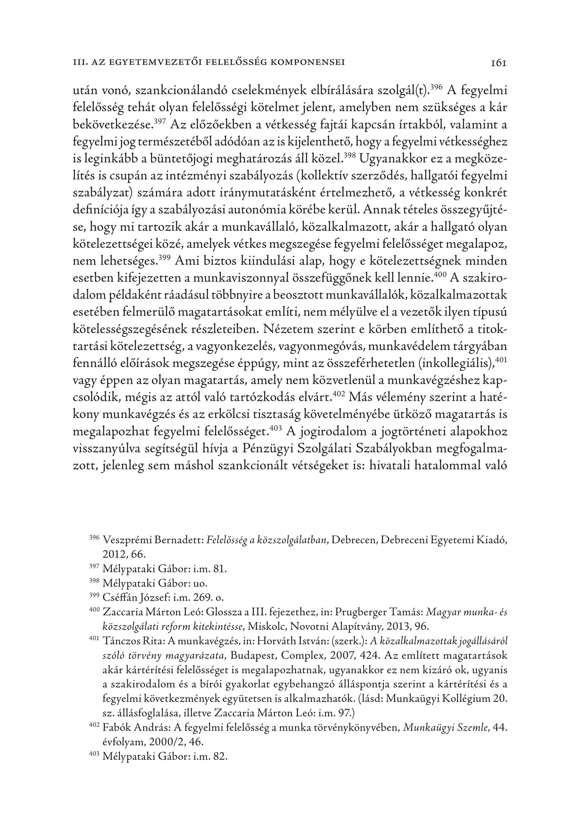 III. AZ EGYETEMVEZETŐI FELELŐSSÉG KOMPONENSEI I6I után vonó, szankcionálandó cselekmények elbírálására szolgál(t)."" A fegyelmi felelősség tehát olyan felelősségi kötelmet jelent, amelyben nem szükséges a kár bekövetkezése." Az előzőekben a vétkesség fajtái kapcsán írtakból, valamint a fegyelmi jog természetéből adódóan az is kijelenthető, hogy a fegyelmi vétkességhez is leginkább a büntetőjogi meghatározás áll közel." Ugyanakkor ez a megközelítés is csupán az intézményi szabályozás (kollektív szerződés, hallgatói fegyelmi szabályzat) számára adott iránymutatásként értelmezhető, a vétkesség konkrét definíciója így a szabályozási autonómia körébe kerül. Annak tételes összegyűjtése, hogy mi tartozik akár a munkavállaló, közalkalmazott, akár a hallgató olyan kötelezettségei közé, amelyek vétkes megszegése fegyelmi felelősséget megalapoz, nem lehetséges." Ami biztos kiindulási alap, hogy e kötelezettségnek minden esetben kifejezetten a munkaviszonnyal összefüggőnek kell lennie." A szakirodalom példaként ráadásul többnyire a beosztott munkavállalók, közalkalmazottak esetében felmerülő magatartásokat említi, nem mélyülve el a vezetők ilyen típusú kötelességszegésének részleteiben. Nézetem szerint e körben említhető a titoktartási kötelezettség, a vagyonkezelés, vagyonmegóvás, munkavédelem tárgyában fennálló előírások megszegése éppúgy, mint az összeférhetetlen (inkollegiális),"" vagy éppen az olyan magatartás, amely nem közvetlenül a munkavégzéshez kapcsolódik, mégis az attól való tartózkodás elvárt."? Más vélemény szerint a hatékony munkavégzés és az erkölcsi tisztaság követelményébe ütköző magatartás is megalapozhat fegyelmi felelősséget." A jogirodalom a jogtörténeti alapokhoz visszanyúlva segítségül hívja a Pénzügyi Szolgálati Szabályokban megfogalmazott, jelenleg sem máshol szankcionált vétségeket is: hivatali hatalommal való 396 Veszprémi Bernadett: Felelősség a közszolgálatban, Debrecen, Debreceni Egyetemi Kiadó, 2012, 66. 397 Mélypataki Gábor: i.m. 81. 398 Mélypataki Gábor: uo. 399 Cseffän Jözsef: i.m. 269. o. 400 Zaccaria Marton Leé: Glossza a III. fejezethez, in: Prugberger Tamas: Magyar munka- és közszolgálati reform kitekintésse, Miskolc, Novotni Alapítvány, 2013, 96. 41 Tánczos Rita: A munkavégzés, in: Horváth István: (szerk.): A közalkalmazottak jogállásáról szóló törvény magyarázata, Budapest, Complex, 2007, 424. Az említett magatartások akár kártérítési felelősséget is megalapozhatnak, ugyanakkor ez nem kizáró ok, ugyanis fegyelmi következmények együtetsen is alkalmazhatók. (lásd: Munkaügyi Kollégium 20. sz. állásfoglalása, illetve Zaccaria Márton Leó: i.m. 97.) 42 Fabók András: A fegyelmi felelősség a munka törvénykönyvében, Munkaügyi Szemle, 44. évfolyam, 2000/2, 46. 13 Mélypataki Gábor: i.m. 82.