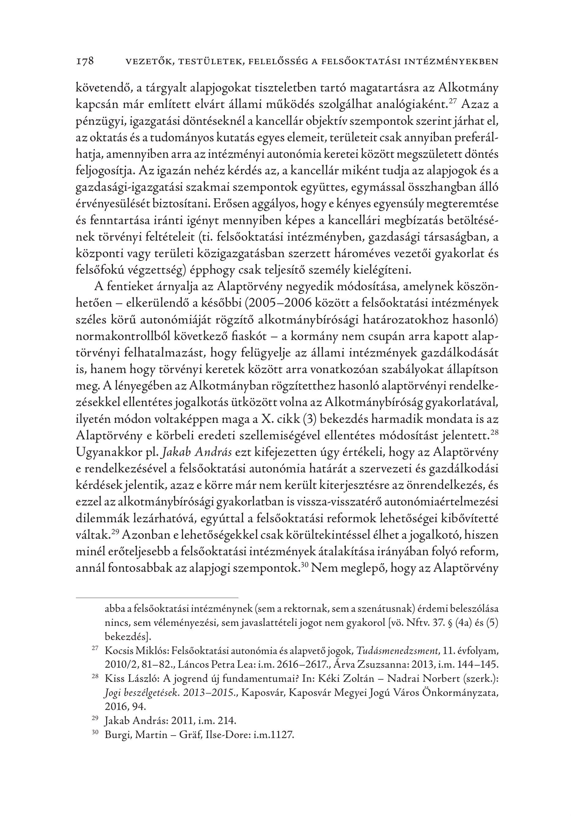 178 VEZETŐK, TESTÜLETEK, FELELŐSSÉG A FELSŐOKTATÁSI INTÉZMÉNYEKBEN követendő, a tárgyalt alapjogokat tiszteletben tartó magatartásra az Alkotmány kapcsán már említett elvárt állami működés szolgálhat analógiaként." Azaz a pénzügyi, igazgatási döntéseknél a kancellár objektív szempontok szerint járhat el, az oktatás és a tudományos kutatás egyes elemeit, területeit csak annyiban preferálhatja, amennyiben arra az intézményi autonómia keretei között megszületett döntés feljogosítja. Az igazán nehéz kérdés az, a kancellár miként tudja az alapjogok és a gazdasági-igazgatási szakmai szempontok együttes, egymással összhangban álló érvényesülését biztosítani. Erősen aggályos, hogy e kényes egyensúly megteremtése és fenntartása iránti igényt mennyiben képes a kancellári megbízatás betöltésének törvényi feltételeit (ti. felsőoktatási intézményben, gazdasági társaságban, a központi vagy területi közigazgatásban szerzett hároméves vezetői gyakorlat és felsőfokú végzettség) épphogy csak teljesítő személy kielégíteni. A fentieket árnyalja az Alaptörvény negyedik módosítása, amelynek köszönhetően - elkerülendő a későbbi (2005—2006 között a felsőoktatási intézmények széles körű autonómiáját rögzítő alkotmánybírósági határozatokhoz hasonló) normakontrollból következő fiaskót — a kormány nem csupán arra kapott alaptörvényi felhatalmazást, hogy felügyelje az állami intézmények gazdálkodását is, hanem hogy törvényi keretek között arra vonatkozóan szabályokat állapítson meg. A lényegében az Alkotmányban rögzítetthez hasonló alaptörvényi rendelkezésekkel ellentétes jogalkotás ütközött volna az Alkotmánybíróság gyakorlatával, ilyetén módon voltaképpen maga a X. cikk (3) bekezdés harmadik mondata is az Alaptörvény e körbeli eredeti szellemiségével ellentétes módosítást jelentett." Ugyanakkor pl. Jakab András ezt kifejezetten úgy értékeli, hogy az Alaptörvény e rendelkezésével a felsőoktatási autonómia határát a szervezeti és gazdálkodási kérdések jelentik, azaz e körre már nem került kiterjesztésre az önrendelkezés, és ezzel az alkotmánybírósági gyakorlatban is vissza-visszatérő autonómiaértelmezési dilemmák lezárhatóvá, egyúttal a felsőoktatási reformok lehetőségei kibővítetté váltak." Azonban e lehetőségekkel csak körültekintéssel élhet a jogalkotó, hiszen minél erőteljesebb a felsőoktatási intézmények átalakítása irányában folyó reform, annál fontosabbak az alapjogi szempontok." Nem meglepő, hogy az Alaptörvény abba a felsőoktatási intézménynek (sem a rektornak, sem a szenátusnak) érdemi beleszólása nincs, sem véleményezési, sem javaslattételi jogot nem gyakorol (vö. Nftv. 37. § (4a) és (5) bekezdés]. "7 Kocsis Miklós: Felsőoktatási autonómia és alapvető jogok, Tudásmenedzsment, 11. évfolyam, 2010/2, 81—82., Láncos Petra Lea: i.m. 2616—2617., Árva Zsuzsanna: 2013, i.m. 144—145. °8 Kiss Laszlé: A jogrend uj fundamentumai? In: Kéki Zoltan — Nadrai Norbert (szerk.): Jogi beszélgetések. 2013—2015., Kaposvár, Kaposvár Megyei Jogú Város Önkormányzata, 2016, 94. 3 Jakab Andräs: 2011, i.m. 214. © Burgi, Martin — Graf, Ilse-Dore: i.m.1127.