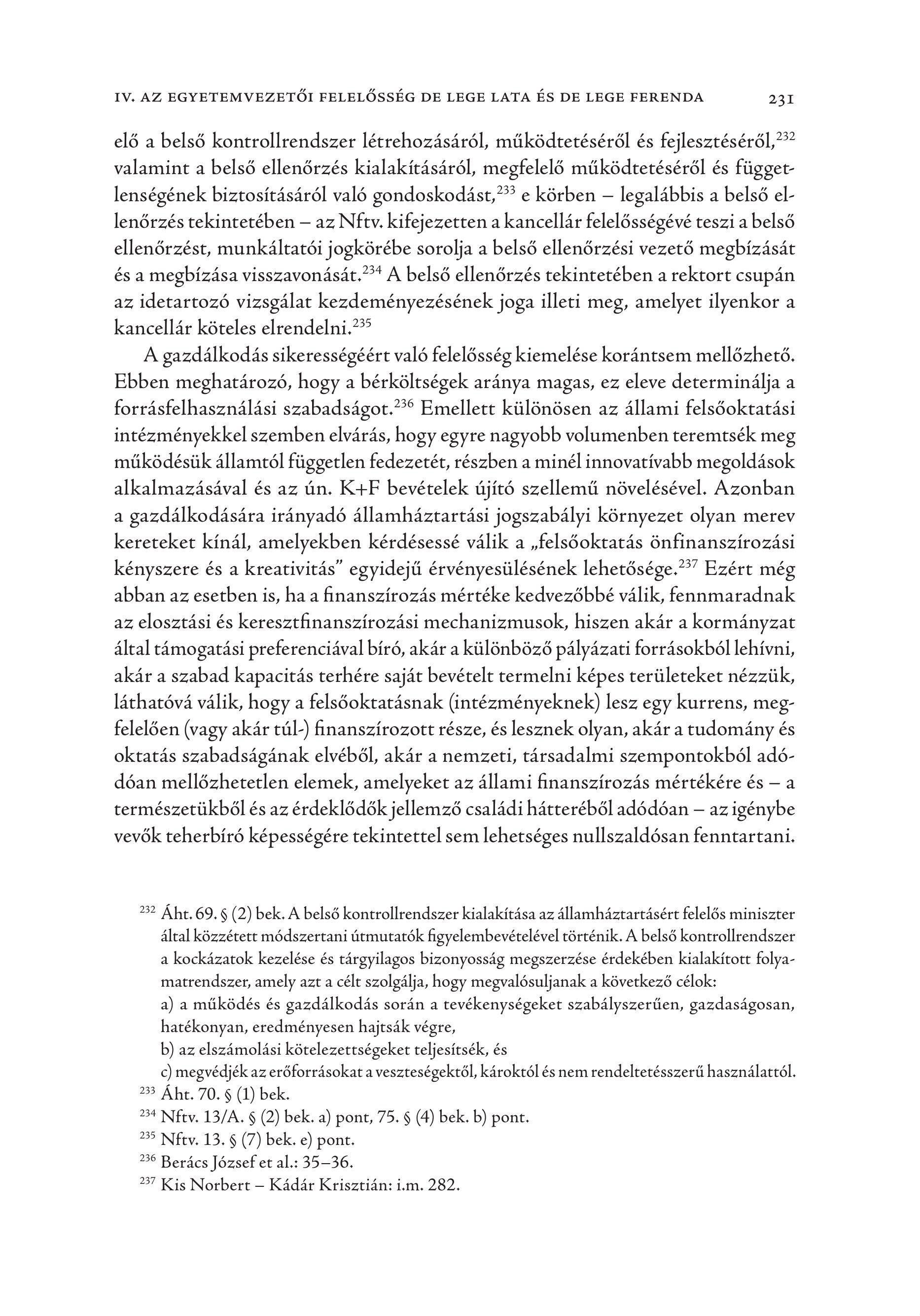 IV. AZ EGYETEMVEZETŐI FELELŐSSÉG DE LEGE LATA ÉS DE LEGE FERENDA 231 elö a belsö kontrollrendszer letrehozäsäröl, müködteteseröl &s fejleszteseröl,”? valamint a belső ellenőrzés kialakításáról, megfelelő működtetéséről és függet233 lenségének biztosításáról való gondoskodást, ??? e körben — legalábbis a belső ellenôrzés tekintetében — az Nftv. kifejezetten a kancellár felelősségévé teszi a belső ellenőrzést, munkáltatói jogkörébe sorolja a belső ellenőrzési vezető megbízását és a megbízása visszavonását." A belső ellenőrzés tekintetében a rektort csupán az idetartozó vizsgálat kezdeményezésének joga illeti meg, amelyet ilyenkor a kancellár köteles elrendelni." A gazdálkodás sikerességéért való felelősség kiemelése korántsem mellőzhető. Ebben meghatározó, hogy a bérköltségek aránya magas, ez eleve determinálja a forrásfelhasználási szabadságot." Emellett különösen az állami felsőoktatási intézményekkel szemben elvárás, hogy egyre nagyobb volumenben teremtsék meg működésük államtól független fedezetét, részben a minél innovatívabb megoldások alkalmazásával és az in. K+F bevételek újító szellemű növelésével. Azonban a gazdálkodására irányadó államháztartási jogszabályi környezet olyan merev kereteket kínál, amelyekben kérdésessé válik a , felsőoktatás önfinanszírozási kényszere és a kreativitás" egyidejű érvényesülésének lehetősége." Ezért még abban az esetben is, ha a finanszírozás mértéke kedvezőbbé válik, fennmaradnak az elosztási és keresztfinanszírozási mechanizmusok, hiszen akár a kormányzat által támogatási preferenciával bíró, akár a különböző pályázati forrásokból lehívni, akár a szabad kapacitás terhére saját bevételt termelni képes területeket nézzük, láthatóvá válik, hogy a felsőoktatásnak (intézményeknek) lesz egy kurrens, megfelelően (vagy akár túl-) finanszírozott része, és lesznek olyan, akár a tudomány és oktatás szabadságának elvéből, akár a nemzeti, társadalmi szempontokból adódóan mellőzhetetlen elemek, amelyeket az állami finanszírozás mértékére és — a természetükből és az érdeklődők jellemző családi hátteréből adódóan — az igénybe vevők teherbíró képességére tekintettel sem lehetséges nullszaldósan fenntartani. 232 Áht. 69. § (2) bek. A belső kontrollrendszer kialakítása az államháztartásért felelős miniszter által közzétett módszertani útmutatók figyelembevételével történik. A belső kontrollrendszer a kockázatok kezelése és tárgyilagos bizonyosság megszerzése érdekében kialakított folyamatrendszer, amely azt a célt szolgálja, hogy megvalósuljanak a következő célok: a) a működés és gazdálkodás során a tevékenységeket szabályszerűen, gazdaságosan, hatékonyan, eredményesen hajtsák végre, b) az elszámolási kötelezettségeket teljesítsék, és c) megvédjék az erőforrásokat a veszteségektől, károktól és nem rendeltetésszerű használattól. 233 Áht. 70. § (1) bek. 34 Nftv. 13/A. $ (2) bek. a) pont, 75. § (4) bek. b) pont. 35 Nftv. 13. § (7) bek. e) pont. © Beracs Jozsef et al.: 35-36. 237 Kis Norbert — Kádár Krisztián: i.m. 282.