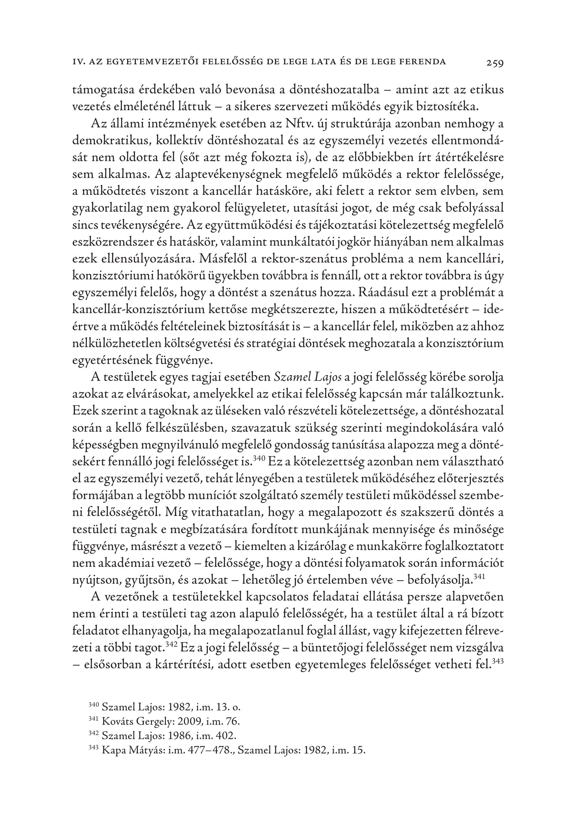 IV. AZ EGYETEMVEZETŐI FELELŐSSÉG DE LEGE LATA ÉS DE LEGE FERENDA 259 támogatása érdekében való bevonása a döntéshozatalba — amint azt az etikus vezetés elméleténél láttuk — a sikeres szervezeti működés egyik biztosítéka. Az állami intézmények esetében az Nftv. új struktúrája azonban nemhogy a demokratikus, kollektív döntéshozatal és az egyszemélyi vezetés ellentmondását nem oldotta fel (sőt azt még fokozta is), de az előbbiekben írt átértékelésre sem alkalmas. Az alaptevékenységnek megfelelő működés a rektor felelőssége, a működtetés viszont a kancellár hatásköre, aki felett a rektor sem elvben, sem gyakorlatilag nem gyakorol felügyeletet, utasítási jogot, de még csak befolyással sincs tevékenységére. Az együttműködési és tájékoztatási kötelezettség megfelelő eszközrendszer és hatáskör, valamint munkáltatói jogkör hiányában nem alkalmas ezek ellensúlyozására. Másfelől a rektor-szenátus probléma a nem kancellári, konzisztóriumi hatókörű ügyekben továbbra is fennáll, ott a rektor továbbra is úgy egyszemélyi felelős, hogy a döntést a szenátus hozza. Ráadásul ezt a problémát a kancellár-konzisztórium kettőse megkétszerezte, hiszen a működtetésért — ideértve a működés feltételeinek biztosítását is — a kancellár felel, miközben azahhoz nélkülözhetetlen költségvetési és stratégiai döntések meghozatala a konzisztórium egyetértésének függvénye. A testületek egyes tagjai esetében Szamel Lajos a jogi felelősség körébe sorolja azokat az elvárásokat, amelyekkel az etikai felelősség kapcsán már találkoztunk. Ezek szerint a tagoknak az üléseken való részvételi kötelezettsége, a döntéshozatal során a kellő felkészülésben, szavazatuk szükség szerinti megindokolására való képességben megnyilvánuló megfelelő gondosság tanúsítása alapozza meg a döntésekért fennálló jogi felelősséget is. Ez a kötelezettség azonban nem választható el az egyszemélyi vezető, tehát lényegében a testületek működéséhez előterjesztés formájában a legtöbb muníciót szolgáltató személy testületi működéssel szembeni felelősségétől. Míg vitathatatlan, hogy a megalapozott és szakszerű döntés a testületi tagnak e megbízatására fordított munkájának mennyisége és minősége függvénye, másrészt a vezető — kiemelten a kizárólag e munkakörre foglalkoztatott nem akadémiai vezető — felelőssége, hogy a döntési folyamatok során információt nyújtson, gyűjtsön, és azokat — lehetőleg jó értelemben véve — befolyásolja" A vezetőnek a testületekkel kapcsolatos feladatai ellátása persze alapvetően nem érinti a testületi tag azon alapuló felelősségét, ha a testület által a rá bízott feladatot elhanyagolja, ha megalapozatlanul foglal állást, vagy kifejezetten félrevezeti a többi tagot? Ez a jogi felelősség — a büntetőjogi felelősséget nem vizsgálva — elsősorban a kártérítési, adott esetben egyetemleges felelősséget vetheti fel? 340 Szamel Lajos: 1982, i.m. 13. 0. "4 Kováts Gergely: 2009, i.m. 76. 42 Szamel Lajos: 1986, i.m. 402. "8 Kapa Mátyás: i.m. 477-478., Szamel Lajos: 1982, i.m. 15.