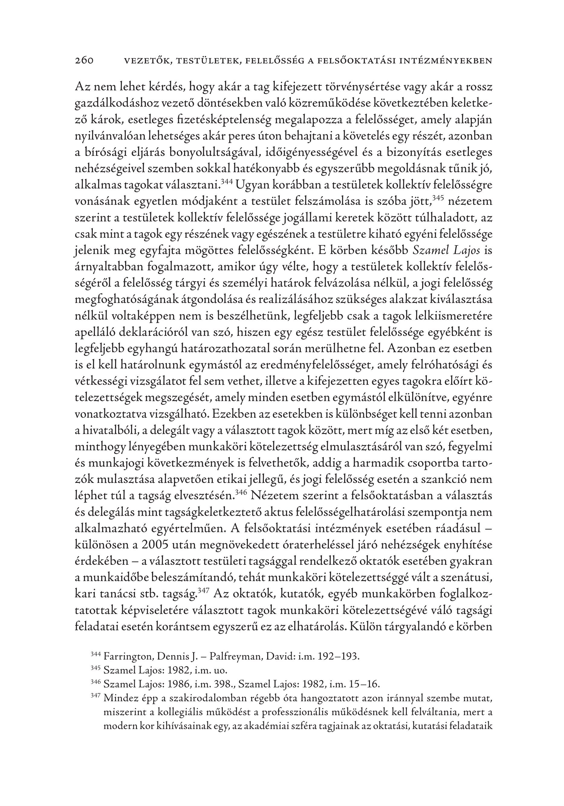 260 VEZETŐK, TESTÜLETEK, FELELŐSSÉG A FELSŐOKTATÁSI INTÉZMÉNYEKBEN Az nem lehet kérdés, hogy akár a tag kifejezett törvénysértése vagy akár a rossz gazdálkodáshoz vezető döntésekben való közreműködése következtében keletkező károk, esetleges fizetésképtelenség megalapozza a felelősséget, amely alapján nyilvánvalóan lehetséges akár peres úton behajtani a követelés egy részét, azonban a bírósági eljárás bonyolultságával, időigényességével és a bizonyítás esetleges nehézségeivel szemben sokkal hatékonyabb és egyszerűbb megoldásnak tűnik jó, alkalmas tagokat választani. Ugyan korábban a testületek kollektív felelősségre 345 nézetem vonásának egyetlen módjaként a testület felszámolása is szóba jött, szerint a testületek kollektív felelőssége jogállami keretek között túlhaladott, az csak mint a tagok egy részének vagy egészének a testületre kiható egyéni felelőssége jelenik meg egyfajta mögöttes felelősségként. E körben később Szamel Lajos is árnyaltabban fogalmazott, amikor úgy vélte, hogy a testületek kollektív felelősségéről a felelősség tárgyi és személyi határok felvázolása nélkül, a jogi felelősség megfoghatóságának átgondolása és realizálásához szükséges alakzat kiválasztása nélkül voltaképpen nem is beszélhetünk, legfeljebb csak a tagok lelkiismeretére apelláló deklarációról van szó, hiszen egy egész testület felelőssége egyébként is legfeljebb egyhangú határozathozatal során merülhetne fel. Azonban ez esetben is el kell határolnunk egymástól az eredményfelelősséget, amely felróhatósági és vétkességi vizsgálatot fel sem vethet, illetve a kifejezetten egyes tagokra előírt kötelezettségek megszegését, amely minden esetben egymástól elkülönítve, egyénre vonatkoztatva vizsgálható. Ezekben az esetekben is különbséget kell tenni azonban a hivatalbóli, a delegált vagy a választott tagok között, mert míg az első két esetben, minthogy lényegében munkaköri kötelezettség elmulasztásáról van szó, fegyelmi és munkajogi következmények is felvethetők, addig a harmadik csoportba tartozók mulasztása alapvetően etikai jellegű, és jogi felelősség esetén a szankció nem léphet túl a tagság elvesztésén." Nézetem szerint a felsőoktatásban a választás és delegálás mint tagságkeletkeztető aktus felelősségelhatárolási szempontja nem alkalmazható egyértelműen. A felsőoktatási intézmények esetében ráadásul — különösen a 2005 után megnövekedett óraterheléssel járó nehézségek enyhítése érdekében — a választott testületi tagsággal rendelkező oktatók esetében gyakran a munkaidőbe beleszámítandó, tehát munkaköri kötelezettséggé vált a szenátusi, kari tanácsi stb. tagság" Az oktatók, kutatók, egyéb munkakörben foglalkoztatottak képviseletére választott tagok munkaköri kötelezettségévé váló tagsági feladatai esetén korántsem egyszerű ez az elhatárolás. Külön tárgyalandó e körben 34 Farrington, Dennis J. — Palfreyman, David: i.m. 192—193. 3 Szamel Lajos: 1982, i.m. uo. 346 Szamel Lajos: 1986, i.m. 398., Szamel Lajos: 1982, i.m. 15-16. 34 Mindez épp a szakirodalomban régebb óta hangoztatott azon iránnyal szembe mutat, miszerint a kollegiális működést a professzionális működésnek kell felváltania, mert a modern kor kihívásainak egy, az akadémiai szféra tagjainak az oktatási, kutatási feladataik