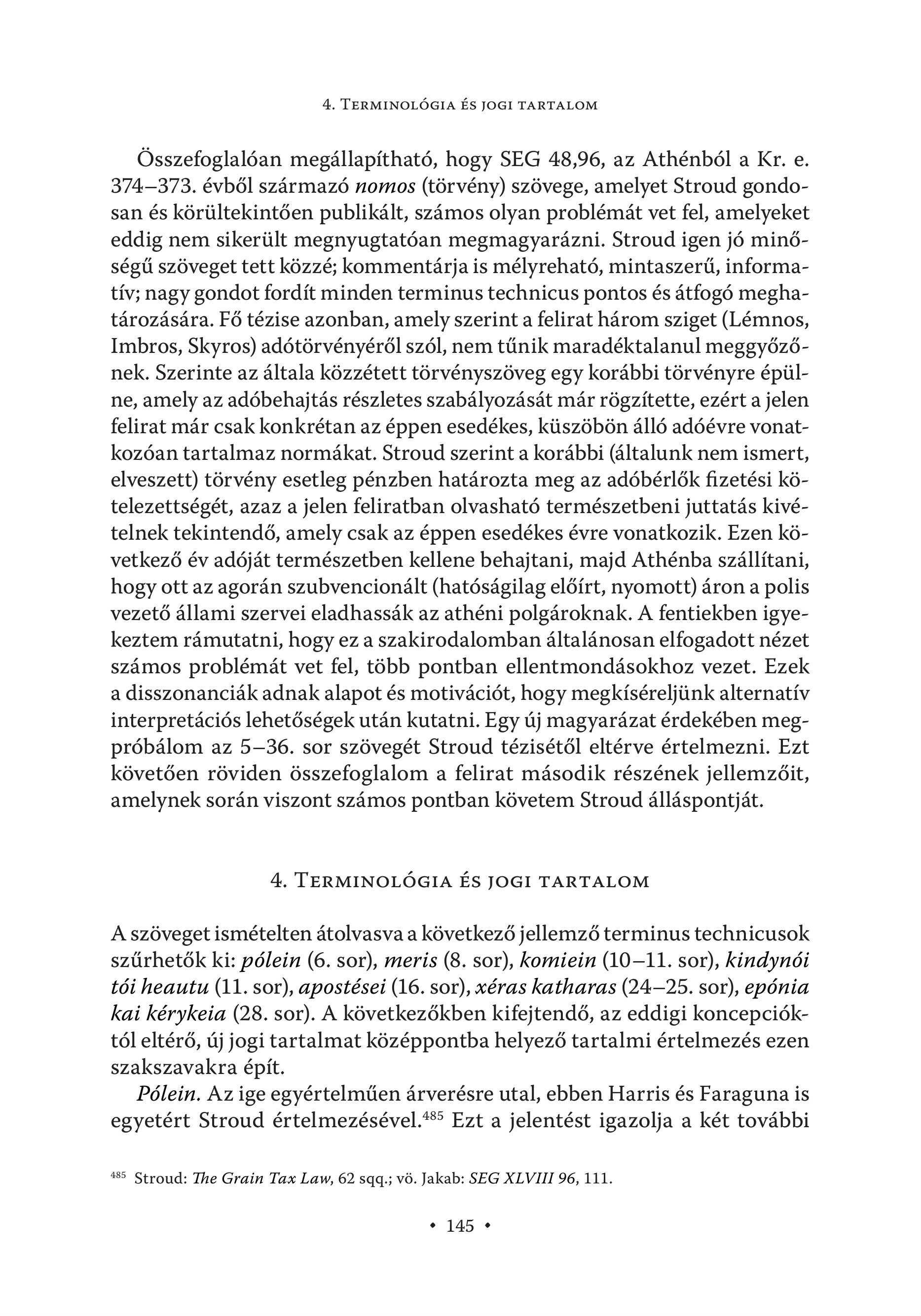 4. TERMINOLÓGIA ÉS JOGI TARTALOM Összefoglalóan megállapítható, hogy SEG 48,96, az Athénbdl a Kr. e. 374—373. évből származó nomos (törvény) szövege, amelyet Stroud gondosan és körültekintően publikált, számos olyan problémát vet fel, amelyeket eddig nem sikerült megnyugtatóan megmagyarázni. Stroud igen jó minőségű szöveget tett közzé; kommentárja is mélyreható, mintaszerű, informatív; nagy gondot fordít minden terminus technicus pontos és átfogó meghatározására. Fő tézise azonban, amely szerint a felirat három sziget (Lémnos, Imbros, Skyros) adótörvényéről szól, nem tűnik maradéktalanul meggyőzőnek. Szerinte az általa közzétett törvényszöveg egy korábbi törvényre épülne, amely az adóbehajtás részletes szabályozását már rögzítette, ezért a jelen felirat már csak konkrétan az éppen esedékes, küszöbön álló adóévre vonatkozóan tartalmaz normákat. Stroud szerint a korábbi (általunk nem ismert, elveszett) törvény esetleg pénzben határozta meg az adóbérlők fizetési kötelezettségét, azaz a jelen feliratban olvasható természetbeni juttatás kivételnek tekintendő, amely csak az éppen esedékes évre vonatkozik. Ezen következő év adóját természetben kellene behajtani, majd Athénba szállítani, hogy ott az agorán szubvencionált (hatóságilag előírt, nyomott) áron a polis vezető állami szervei eladhassák az athéni polgároknak. A fentiekben igyekeztem rámutatni, hogy ez a szakirodalomban általánosan elfogadott nézet számos problémát vet fel, több pontban ellentmondásokhoz vezet. Ezek a disszonanciák adnak alapot és motivációt, hogy megkíséreljünk alternatív interpretációs lehetőségek után kutatni. Egy új magyarázat érdekében megpröbälom az 5-36. sor szövegét Stroud tézisétől eltérve értelmezni. Ezt követően röviden összefoglalom a felirat második részének jellemzőit, amelynek során viszont számos pontban követem Stroud álláspontját. 4. TERMINOLÓGIA ÉS JOGI TARTALOM A szöveget ismételten átolvasva a következő jellemző terminus technicusok szürhetôk ki: pôlein (6. sor), meris (8. sor), komiein (10-11. sor), kindynói tôi heautu (11. sor), apostesei (16. sor), xeras katharas (24-25. sor), epönia kai kerykeia (28. sor). A következökben kifejtendö, az eddigi koncepciöktól eltérő, új jogi tartalmat középpontba helyező tartalmi értelmezés ezen szakszavakra épít. Pólein. Az ige egyértelműen árverésre utal, ebben Harris és Faraguna is egyetért Stroud értelmezésével." Ezt a jelentést igazolja a két további 485 Stroud: The Grain Tax Law, 62 sqq.; vo. Jakab: SEG XLVIII 96, 111. s 145 "