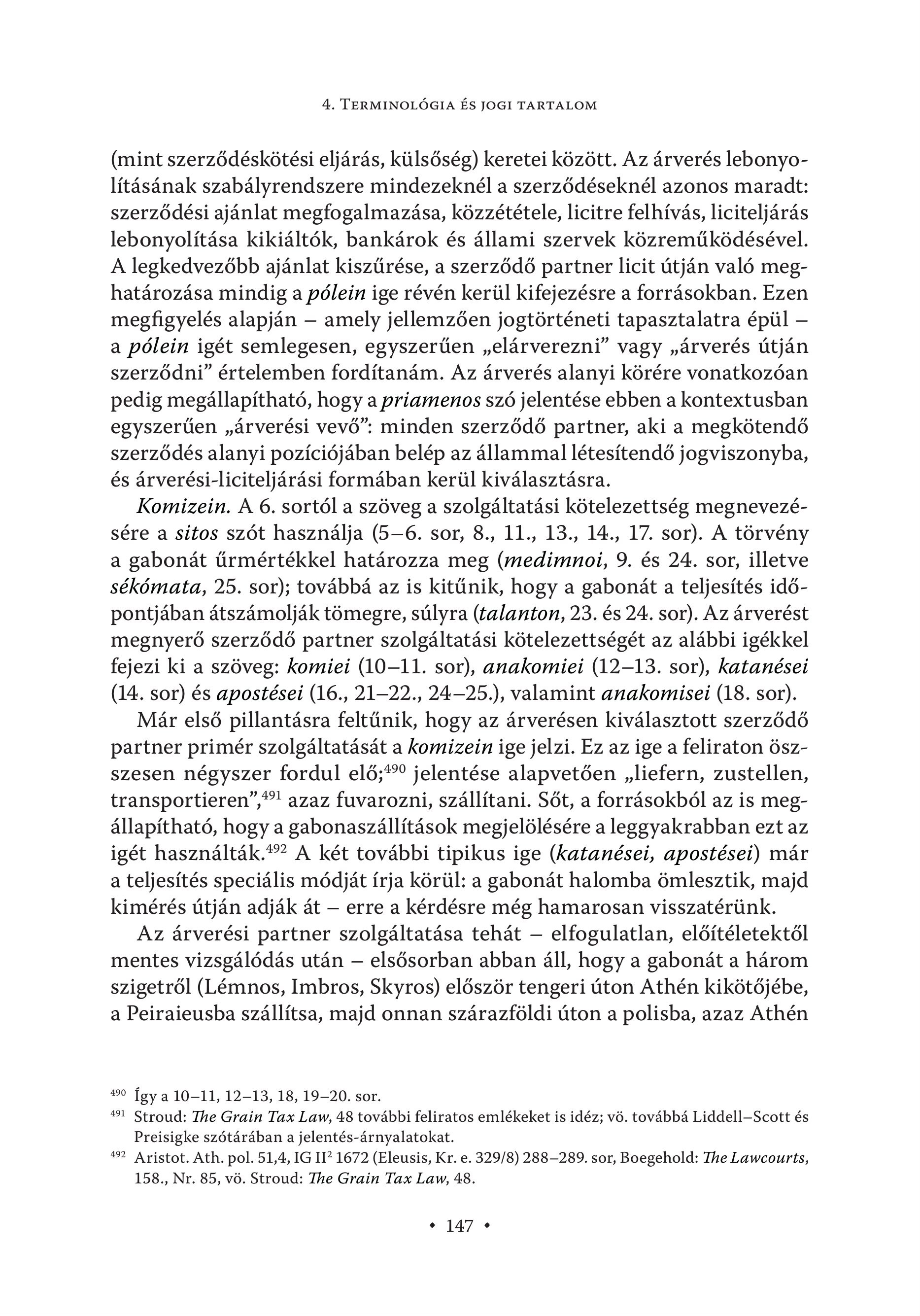 4. TERMINOLÓGIA ÉS JOGI TARTALOM (mint szerződéskötési eljárás, külsőség) keretei között. Az árverés lebonyolításának szabályrendszere mindezeknél a szerződéseknél azonos maradt: szerződési ajánlat megfogalmazása, közzététele, licitre felhívás, liciteljárás lebonyolítása kikiáltók, bankárok és állami szervek közreműködésével. A legkedvezőbb ajánlat kiszűrése, a szerződő partner licit útján való meghatározása mindig a pólein ige révén kerül kifejezésre a forrásokban. Ezen megfigyelés alapján — amely jellemzően jogtörténeti tapasztalatra épül — a pólein igét semlegesen, egyszerűen , elárverezni" vagy ,árverés útján szerződni" értelemben fordítanám. Az árverés alanyi körére vonatkozóan pedig megállapítható, hogy a priamenos szó jelentése ebben a kontextusban egyszerűen , árverési vevő": minden szerződő partner, aki a megkötendő szerződés alanyi pozíciójában belép az állammal létesítendő jogviszonyba, és árverési-liciteljárási formában kerül kiválasztásra. Komizein. A 6. sortól a szöveg a szolgáltatási kötelezettség megnevezésére a sitos szöt hasznälja (5-6. sor, 8., 11., 13., 14., 17. sor). A törvény a gabonát űrmértékkel határozza meg (medimnoi, 9. és 24. sor, illetve sékómata, 25. sor); továbbá az is kitűnik, hogy a gabonát a teljesítés időpontjában átszámolják tömegre, súlyra (talanton, 23. és 24. sor). Az árverést megnyerő szerződő partner szolgáltatási kötelezettségét az alábbi igékkel fejezi ki a szöveg: komiei (10-11. sor), anakomiei (12-13. sor), katanései (14. sor) és apostései (16., 21-22., 24—-25.), valamint anakomisei (18. sor). Már első pillantásra feltűnik, hogy az árverésen kiválasztott szerződő partner primér szolgáltatását a komizein ige jelzi. Ez az ige a feliraton öszszesen négyszer fordul elő;"" jelentése alapvetően „liefern, zustellen, transportieren”,*”! azaz fuvarozni, szállítani. Sőt, a forrásokból az is megállapítható, hogy a gabonaszállítások megjelölésére a leggyakrabban ezt az igét használták."? A két további tipikus ige (katanései, apostései) már a teljesítés speciális módját írja körül: a gabonát halomba ömlesztik, majd kimérés útján adják át — erre a kérdésre még hamarosan visszatérünk. Az árverési partner szolgáltatása tehát — elfogulatlan, előítéletektől mentes vizsgálódás után — elsősorban abban áll, hogy a gabonát a három szigetről (Lémnos, Imbros, Skyros) először tengeri úton Athén kikötőjébe, a Peiraieusba szállítsa, majd onnan szárazföldi úton a polisba, azaz Athén 490 Igy a 10-11, 12-13, 18, 19-20. sor. #1 Stroud: The Grain Tax Law, 48 tovabbi feliratos emlékeket is idéz; v6. tovabba Liddell—Scott és Preisigke szötäräban a jelentes-ärnyalatokat. 192 Aristot. Ath. pol. 51,4, IG II? 1672 (Eleusis, Kr. e. 329/8) 288-289. sor, Boegehold: The Lawcourts, 158., Nr. 85, vö. Stroud: The Grain Tax Law, 48. s 147 "
