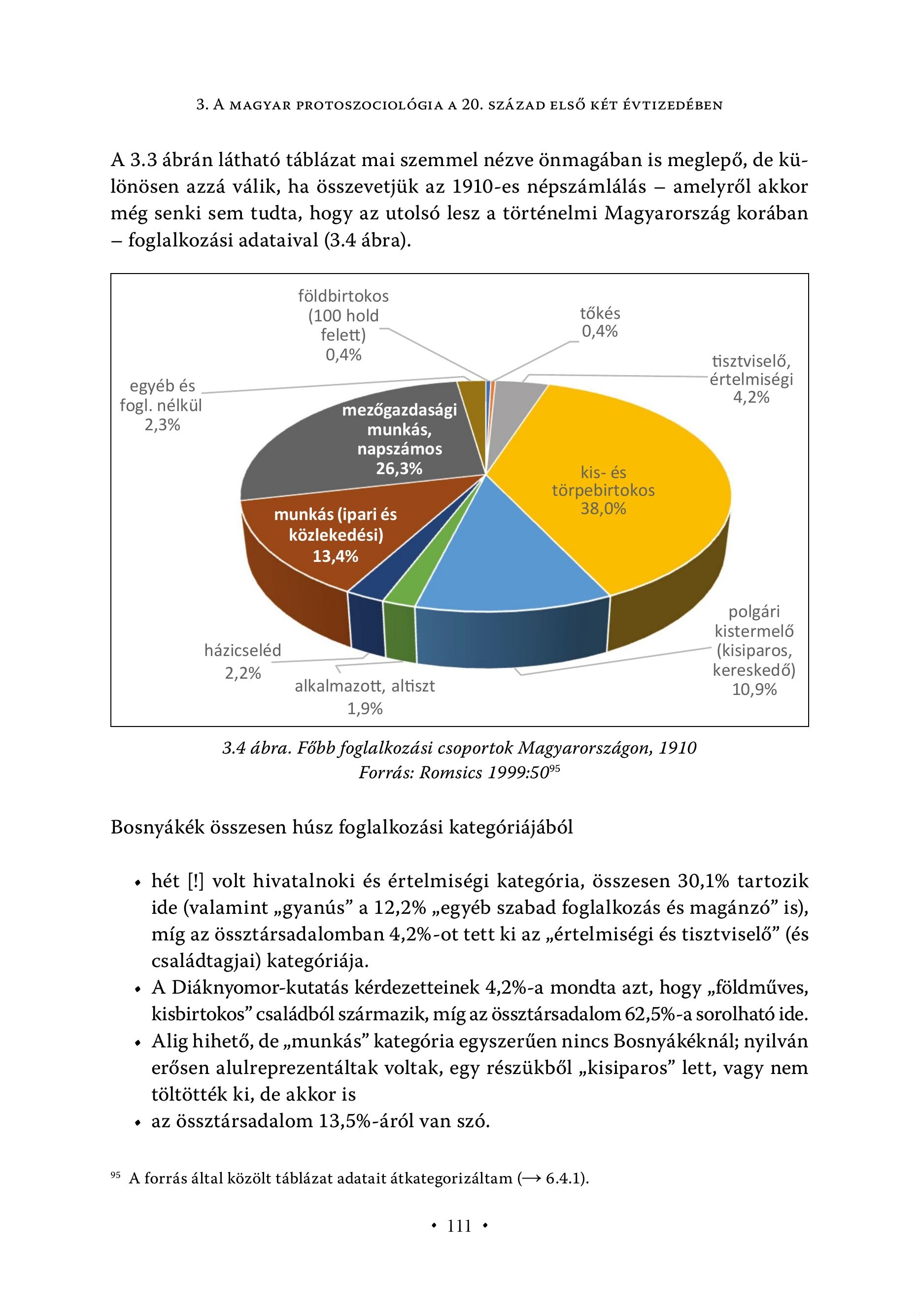 3. A MAGYAR PROTOSZOCIOLÓGIA A 20. SZÁZAD ELSŐ KÉT ÉVTIZEDÉBEN A 3.3 ábrán látható táblázat mai szemmel nézve önmagában is meglepő, de különösen azzá válik, ha összevetjük az 1910-es népszámlálás — amelyről akkor még senki sem tudta, hogy az utolsó lesz a történelmi Magyarország korában — foglalkozási adataival (3.4 ábra).               földbirtokos (100 hold tőkés felett) 0,4% 0,4% tisztviselő, egyéb és Erte misegi fogl. nelkül mezögazdasägi 2,3% munkas, napszamos 26,3% munkás (ipari és közlekedési) 13,4% polgäri kistermelö hazicseléd (kisiparos, 2,2% . kereskedö) alkalmazott, altiszt 10,9% 1,9%       3.4 ábra. Főbb foglalkozási csoportok Magyarországon, 1910 Forrds: Romsics 1999:50° Bosnyákék összesen húsz foglalkozási kategóriájából + het [!] volt hivatalnoki és értelmiségi kategória, összesen 30,196 tartozik ide (valamint , gyanús" a 12,290 ,egyéb szabad foglalkozás és magánzó" is), míg az össztársadalomban 4,296-ot tett ki az , értelmiségi és tisztviselő" (és családtagjai) kategóriája. + A Diäknyomor-kutatäs kérdezetteinek 4,2%-a mondta azt, hogy ,,foldmtives, kisbirtokos" családból származik, míg az össztärsadalom 62,5%-a sorolhatö ide. s Alig hihető, de ,munkás" kategória egyszerűen nincs Bosnyákéknál; nyilván erősen alulreprezentáltak voltak, egy részükből , kisiparos" lett, vagy nem töltötték ki, de akkor is + az össztärsadalom 13,5%-äröl van szó. 95 A forräs ältal közölt täbläzat adatait ätkategorizältam (> 6.4.1). * 111 +