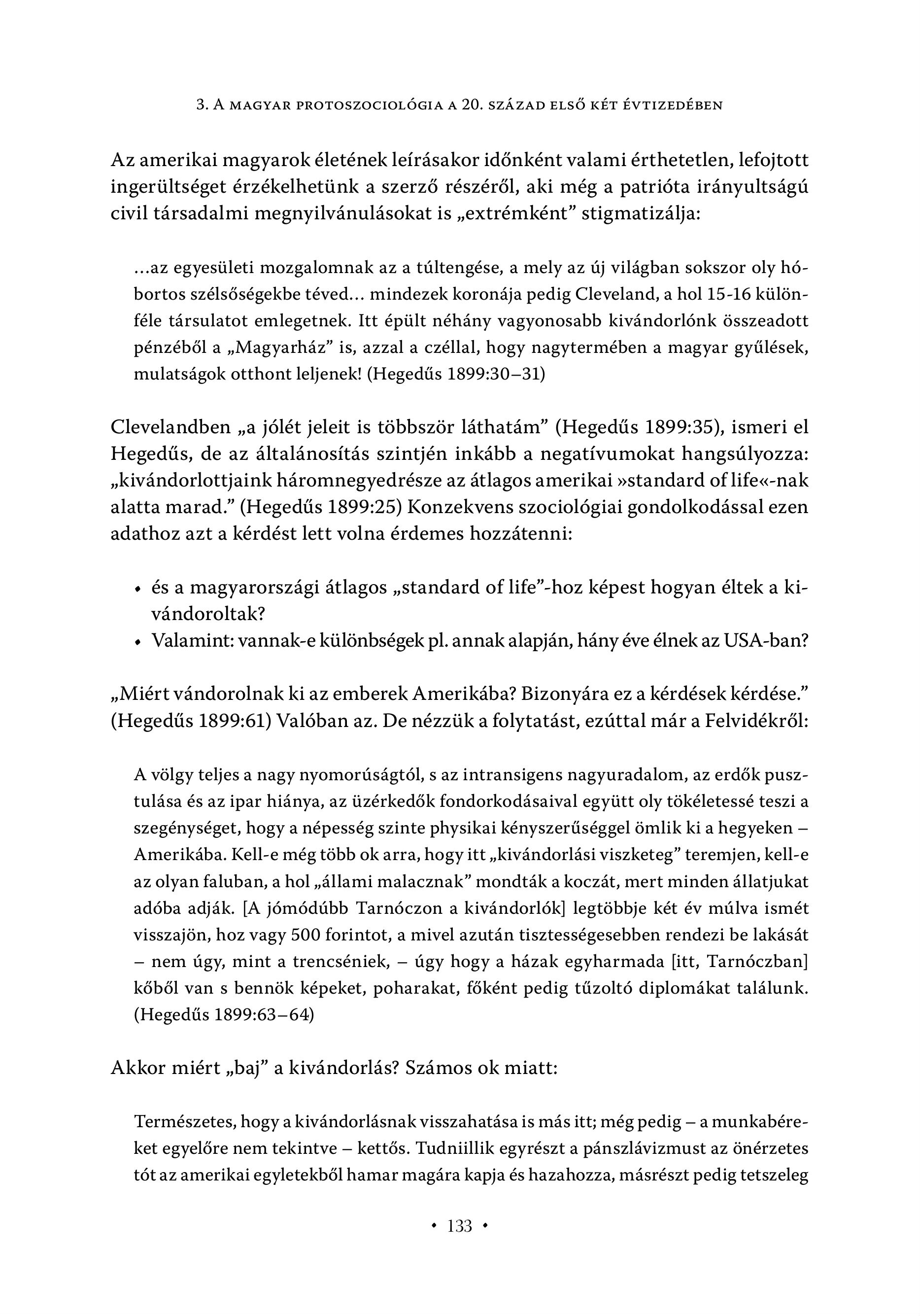 3. A MAGYAR PROTOSZOCIOLÓGIA A 20. SZÁZAD ELSŐ KÉT ÉVTIZEDÉBEN Az amerikai magyarok életének leírásakor időnként valami érthetetlen, lefojtott ingerültséget érzékelhetünk a szerző részéről, aki még a patrióta irányultságú civil társadalmi megnyilvánulásokat is ,,extrémként” stigmatizalja: ... az egyesületi mozgalomnak az a túltengése, a mely az új világban sokszor oly hóbortos szélsőségekbe téved... mindezek koronája pedig Cleveland, a hol 15-16 különféle társulatot emlegetnek. Itt épült néhány vagyonosabb kivándorlónk összeadott pénzéből a , Magyarház" is, azzal a czéllal, hogy nagytermében a magyar gyűlések, mulatságok otthont leljenek! (Hegedűs 1899:30—31) Clevelandben ,a jólét jeleit is többször láthatám" (Hegedűs 1899:35), ismeri el Hegedűs, de az általánosítás szintjén inkább a negatívumokat hangsúlyozza: »kivandorlottjaink haromnegyedrésze az atlagos amerikai »standard of life«-nak alatta marad." (Hegedűs 1899:25) Konzekvens szociológiai gondolkodással ezen adathoz azt a kérdést lett volna érdemes hozzátenni: s és a magyarországi átlagos , standard of life"-hoz képest hogyan éltek a kivándoroltak? s Valamint: vannak-e különbségek pl. annak alapján, hány éve élnek az USA-ban? .Miért vándorolnak ki az emberek Amerikába? Bizonyára ez a kérdések kérdése." (Hegedűs 1899:61) Valóban az. De nézzük a folytatást, ezúttal már a Felvidékről: A völgy teljes a nagy nyomorúságtól, s az intransigens nagyuradalom, az erdők pusztulása és az ipar hiánya, az üzérkedők fondorkodásaival együtt oly tökéletessé teszi a szegénységet, hogy a népesség szinte physikai kényszerűséggel ömlik ki a hegyeken — Amerikába. Kell-e még több ok arra, hogy itt , kivándorlási viszketeg" teremjen, kell-e az olyan faluban, a hol , állami malacznak" mondták a koczát, mert minden állatjukat adóba adják. [A jómódúbb Tarnóczon a kivándorlók] legtöbbje két év múlva ismét visszajön, hoz vagy 500 forintot, a mivel azután tisztességesebben rendezi be lakását — nem tgy, mint a trencséniek, — úgy hogy a házak egyharmada litt, Tarnöczban] kőből van s bennök képeket, poharakat, főként pedig tűzoltó diplomákat találunk. (Hegedtis 1899:63-64) Akkor miért , baj" a kivándorlás? Számos ok miatt: Természetes, hogy a kivándorlásnak visszahatása is más itt; még pedig — amunkabéreket egyelőre nem tekintve — kettős. Tudniillik egyrészt a pánszlávizmust az önérzetes tót az amerikai egyletekből hamar magára kapja és hazahozza, másrészt pedig tetszeleg e 133"