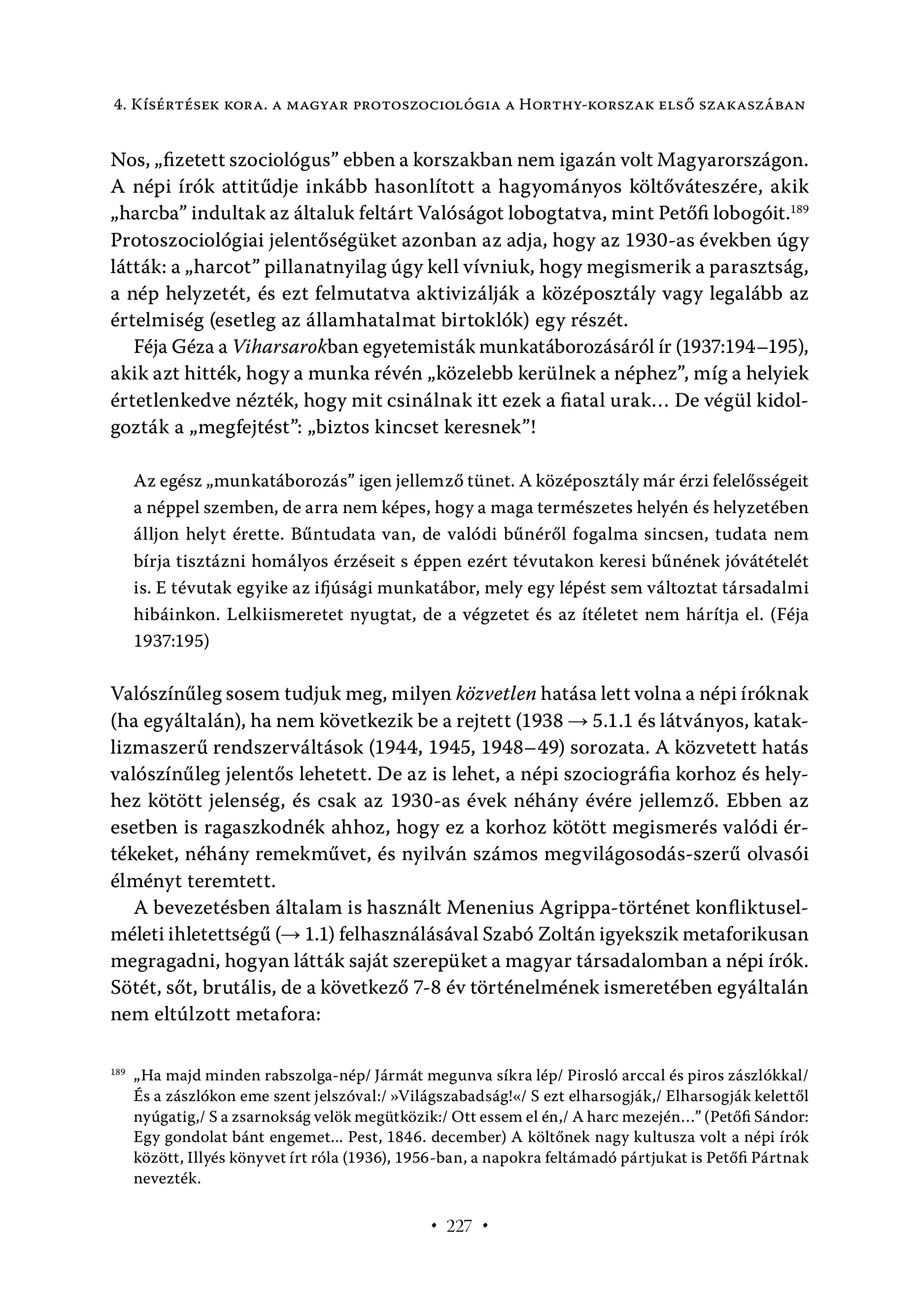 4. KÍSÉRTÉSEK KORA. A MAGYAR PROTOSZOCIOLÓGIA A HORTHY-KORSZAK ELSŐ SZAKASZÁBAN Nos, , fizetett szociológus" ebben a korszakban nem igazán volt Magyarországon. A népi írók attitűdje inkább hasonlított a hagyományos költőváteszére, akik „harcba” indultak az ältaluk feltárt Valóságot lobogtatva, mint Petőfi lobogóit."? Protoszociológiai jelentőségüket azonban az adja, hogy az 1930-as években úgy látták: a , harcot" pillanatnyilag úgy kell vívniuk, hogy megismerik a parasztság, a nép helyzetét, és ezt felmutatva aktivizálják a középosztály vagy legalább az értelmiség (esetleg az államhatalmat birtoklók) egy részét. Féja Géza a Viharsarokban egyetemisták munkatáborozásáról ír (1937:194—195), akik azt hitték, hogy a munka révén , közelebb kerülnek a néphez", míg a helyiek értetlenkedve nézték, hogy mit csinálnak itt ezek a fiatal urak... De végül kidolgozták a , megfejtést": , biztos kincset keresnek"! Az egész ,munkatáborozás? igen jellemző tünet. A középosztály már érzi felelősségeit a néppel szemben, de arra nem képes, hogy a maga természetes helyén és helyzetében álljon helyt érette. Bűntudata van, de valódi bűnéről fogalma sincsen, tudata nem bírja tisztázni homályos érzéseit s éppen ezért tévutakon keresi bűnének jóvátételét is. E tévutak egyike az igúsági munkatábor, mely egy lépést sem változtat társadalmi hibáinkon. Lelkiismeretet nyugtat, de a végzetet és az ítéletet nem hárítja el. (Féja 1937:195) Valószínűleg sosem tudjuk meg, milyen közvetlen hatása lett volna a népi íróknak (ha egyáltalán), ha nem következik be a rejtett (1938 — 5.1.1 és látványos, kataklizmaszerű rendszerváltások (1944, 1945, 1948—49) sorozata. A közvetett hatás valószínűleg jelentős lehetett. De az is lehet, a népi szociográfia korhoz és helyhez kötött jelenség, és csak az 1930-as évek néhány évére jellemző. Ebben az esetben is ragaszkodnék ahhoz, hogy ez a korhoz kötött megismerés valódi értékeket, néhány remekművet, és nyilván számos megvilágosodás-szerű olvasói élményt teremtett. A bevezetésben általam is használt Menenius Agrippa-történet konfliktuselméleti ihletettségü (— 1.1) felhasználásával Szabó Zoltán igyekszik metaforikusan megragadni, hogyan látták saját szerepüket a magyar társadalomban a népi írók. Sötét, sőt, brutális, de a következő 7-8 év történelmének ismeretében egyáltalán nem eltúlzott metafora: 189 , Ha majd minden rabszolga-nép/ Jármát megunva síkra lép/ Pirosló arccal és piros zászlókkal/ Es a zäszlökon eme szent jelszöval:/ »Vilägszabadsäg!«/ S ezt elharsogjäk,/ Elharsogjäk kelettöl nyúgatig;/ S a zsarnokság velök megütközik:/ Ott essem el én,/ A harc mezején..." (Petőfi Sándor: Egy gondolat bánt engemet... Pest, 1846. december) A költőnek nagy kultusza volt a népi írók között, Illyés könyvet írt róla (1936), 1956-ban, a napokra feltámadó pártjukat is Petőfi Pártnak nevezték. e 227 "