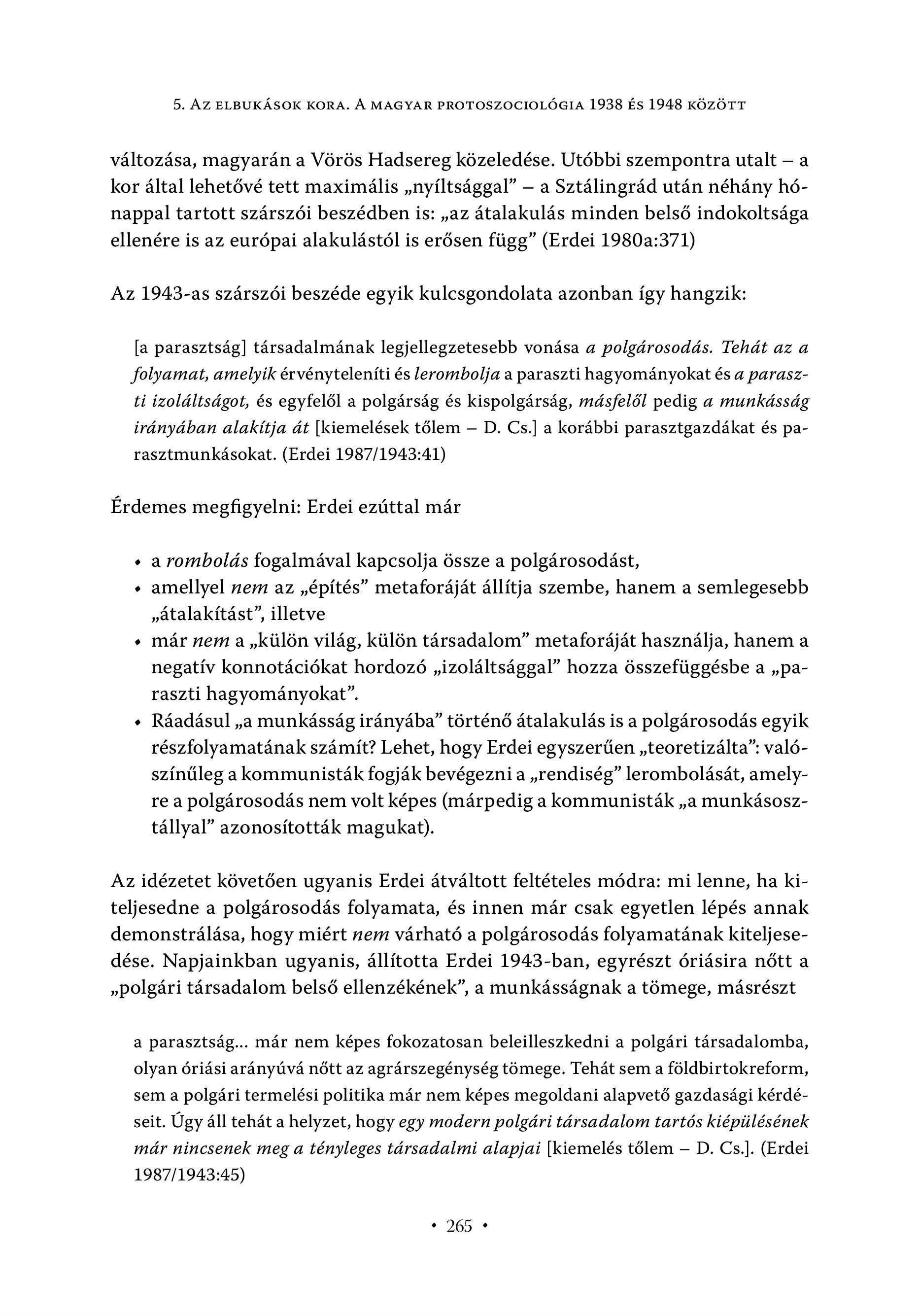 5. AZ ELBUKÁSOK KORA. A MAGYAR PROTOSZOCIOLÓGIA 1938 És 1948 KÖZÖTT változása, magyarán a Vörös Hadsereg közeledése. Utóbbi szempontra utalt — a kor által lehetővé tett maximális , nyíltsággal" — a Sztálingrád után néhány hónappal tartott szárszói beszédben is: , az átalakulás minden belső indokoltsága ellenére is az európai alakulástól is erősen függ" (Erdei 1980a:371) Az 1943-as szárszói beszéde egyik kulcsgondolata azonban így hangzik: [a parasztság] társadalmának legjellegzetesebb vonása a polgárosodás. Tehát az a folyamat, amelyik érvényteleníti és lerombolja a paraszti hagyományokat és a paraszti izoláltságot, és egyfelől a polgárság és kispolgárság, másfelől pedig a munkásság irányában alakítja át [kiemelések télem — D. Cs.] a korábbi parasztgazdákat és parasztmunkäsokat. (Erdei 1987/1943:41) Érdemes megfigyelni: Erdei ezúttal már s a rombolás fogalmával kapcsolja össze a polgárosodást, s amellyel nem az , építés" metaforáját állítja szembe, hanem a semlegesebb „atalakitäst”, illetve s már nem a , külön világ, külön társadalom" metaforáját használja, hanem a negatív konnotációkat hordozó ,izoláltsággal" hozza összefüggésbe a , paraszti hagyományokat". s Ráadásul ,a munkásság irányába" történő átalakulás is a polgárosodás egyik részfolyamatának számít? Lehet, hogy Erdei egyszerűen , teoretizálta": valószínűleg akommunisták fogják bevégezni a , rendiség" lerombolását, amelyre a polgárosodás nem volt képes (márpedig a kommunisták , a munkásosztállyal" azonosították magukat). Az idézetet követően ugyanis Erdei átváltott feltételes módra: mi lenne, ha kiteljesedne a polgárosodás folyamata, és innen már csak egyetlen lépés annak demonstrálása, hogy miért nem várható a polgárosodás folyamatának kiteljesedése. Napjainkban ugyanis, állította Erdei 1943-ban, egyrészt óriásira nőtt a ,polgári társadalom belső ellenzékének", a munkásságnak a tömege, másrészt a parasztság... már nem képes fokozatosan beleilleszkedni a polgári társadalomba, olyan óriási arányúvá nőtt az agrárszegénység tömege. Tehát sem a földbirtokreform, sem a polgári termelési politika már nem képes megoldani alapvető gazdasági kérdéseit. Úgy áll tehát a helyzet, hogy egy modern polgári társadalom tartós kiépülésének már nincsenek meg a tényleges társadalmi alapjai [kiemelés tőlem — D. Cs.]. (Erdei 1987/1943:45)