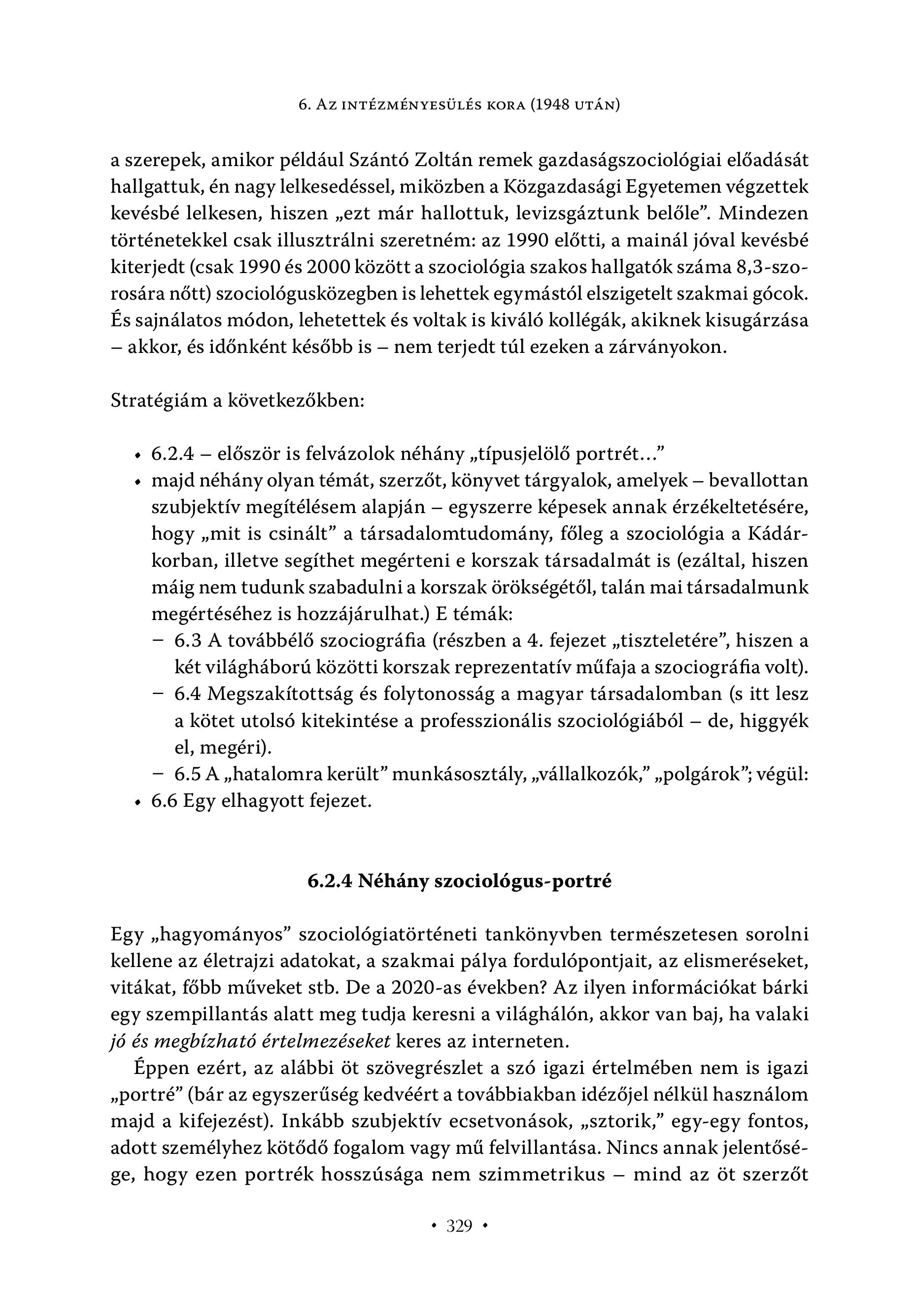 6. AZ INTÉZMÉNYESÜLÉS KORA (1948 UTÁN) a szerepek, amikor például Szántó Zoltán remek gazdaságszociológiai előadását hallgattuk, én nagy lelkesedéssel, miközben a Közgazdasági Egyetemen végzettek kevésbé lelkesen, hiszen ,ezt már hallottuk, levizsgáztunk belőle". Mindezen történetekkel csak illusztrálni szeretném: az 1990 előtti, a mainál jóval kevésbé kiterjedt (csak 1990 és 2000 között a szociológia szakos hallgatók száma 8,3-szorosára nőtt) szociológusközegben is lehettek egymástól elszigetelt szakmai gócok. És sajnálatos módon, lehetettek és voltak is kiváló kollégák, akiknek kisugárzása — akkor, és időnként később is — nem terjedt túl ezeken a zárványokon. Stratégiám a következőkben: s 6.2.4 — először is felvázolok néhány , típusjelölő portrét..." s majd néhány olyan témát, szerzőt, könyvet tárgyalok, amelyek — bevallottan szubjektív megítélésem alapján — egyszerre képesek annak érzékeltetésére, hogy , mit is csinált" a társadalomtudomány, főleg a szociológia a Kádárkorban, illetve segíthet megérteni e korszak társadalmát is (ezáltal, hiszen máig nem tudunk szabadulni a korszak örökségétől, talán mai társadalmunk megértéséhez is hozzájárulhat.) E témák: — 6.3 A továbbélő szociográfia (részben a 4. fejezet , tiszteletére", hiszen a két világháború közötti korszak reprezentatív műfaja a szociográfia volt). — 6.4 Megszakítottság és folytonosság a magyar társadalomban (s itt lesz a kötet utolsó kitekintése a professzionális szociológiából — de, higgyék el, megéri). — 6.5 A , hatalomra került" munkásosztály, , vállalkozók," , polgárok"; végül: s 6.6 Egy elhagyott fejezet. 6.2.4 Néhány szociológus-portré Egy ,hagyományos" szociológiatörténeti tankönyvben természetesen sorolni kellene az életrajzi adatokat, a szakmai pálya fordulópontjait, az elismeréseket, vitákat, főbb műveket stb. De a 2020-as években? Az ilyen információkat bárki egy szempillantás alatt meg tudja keresni a világhálón, akkor van baj, ha valaki jó és megbízható értelmezéseket keres az interneten. Éppen ezért, az alábbi öt szövegrészlet a szó igazi értelmében nem is igazi „portre” (bär az egyszerűség kedvéért a továbbiakban idézőjel nélkül használom majd a kifejezést). Inkább szubjektív ecsetvonások, , sztorik," egy-egy fontos, adott személyhez kötődő fogalom vagy mű felvillantása. Nincs annak jelentősége, hogy ezen portrék hosszúsága nem szimmetrikus — mind az öt szerzőt + 329 +
