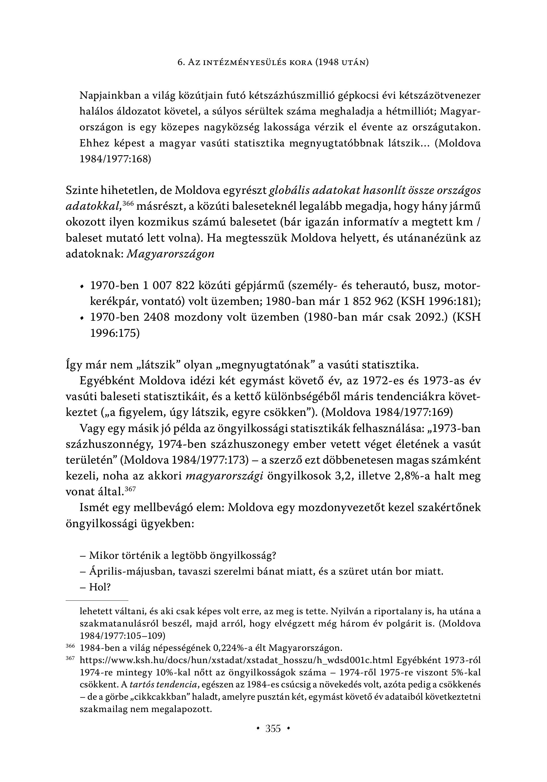 6. AZ INTÉZMÉNYESÜLÉS KORA (1948 UTÁN) Napjainkban a világ közútjain futó kétszázhúszmillió gépkocsi évi kétszázötvenezer halálos áldozatot követel, a súlyos sérültek száma meghaladja a hétmilliót; Magyarországon is egy közepes nagyközség lakossága vérzik el évente az országutakon. Ehhez képest a magyar vasúti statisztika megnyugtatóbbnak látszik... (Moldova 1984/1977:168) Szinte hihetetlen, de Moldova egyrészt globális adatokat hasonlít össze országos adatokkal," másrészt, a közúti baleseteknél legalább megadja, hogy hány jármű okozott ilyen kozmikus számú balesetet (bár igazán informatív a megtett km / baleset mutató lett volna). Ha megtesszük Moldova helyett, és utánanézünk az adatoknak: Magyarországon s 1970-ben 1 007 822 közúti gépjármű (személy- és teherautó, busz, motorkerékpár, vontató) volt üzemben; 1980-ban már 1 852 962 (KSH 1996:181); s 1970-ben 2408 mozdony volt üzemben (1980-ban már csak 2092.) (KSH 1996:175) Így már nem , látszik" olyan , megnyugtatónak? a vasúti statisztika. Egyébként Moldova idézi két egymást követő év, az 1972-es és 1973-as év vasúti baleseti statisztikáit, és a kettő különbségéből máris tendenciákra következtet (,,a figyelem, úgy látszik, egyre csökken"). (Moldova 1984/1977:169) Vagy egy másik jó példa az öngyilkossági statisztikák felhasználása: , 1973-ban százhuszonnégy, 1974-ben százhuszonegy ember vetett véget életének a vasút területén" (Moldova 1984/1977:173) — a szerző ezt döbbenetesen magas számként kezeli, noha az akkori magyarországi öngyilkosok 3,2, illetve 2,8%-a halt meg vonat ältal.?°” Ismet egy mellbevägö elem: Moldova egy mozdonyvezetöt kezel szakertönek öngyilkossägi ügyekben: — Mikor történik a legtöbb öngyilkosság? — Április-májusban, tavaszi szerelmi bánat miatt, és a szüret után bor miatt. — Hol? lehetett váltani, és aki csak képes volt erre, az meg is tette. Nyilván a riportalany is, ha utána a szakmatanulásról beszél, majd arról, hogy elvégzett még három év polgárit is. (Moldova 1984/1977:105-109) 1984-ben a világ népességének 0,22496-a élt Magyarországon. https://www.ksh.hu/docs/hun/xstadat/xstadat_hosszu/h_wdsd001c.html Egyébként 1973-r6l 1974-re mintegy 10%-kal nőtt az öngyilkosságok száma — 1974-ről 1975-re viszont 596-kal csökkent. A tartós tendencia, egészen az 1984-es csúcsig a növekedés volt, azóta pedig a csökkenés — de a görbe , cikkcakkban" haladt, amelyre pusztán két, egymást követő év adataiból következtetni szakmailag nem megalapozott. 366 36 I + 355 +