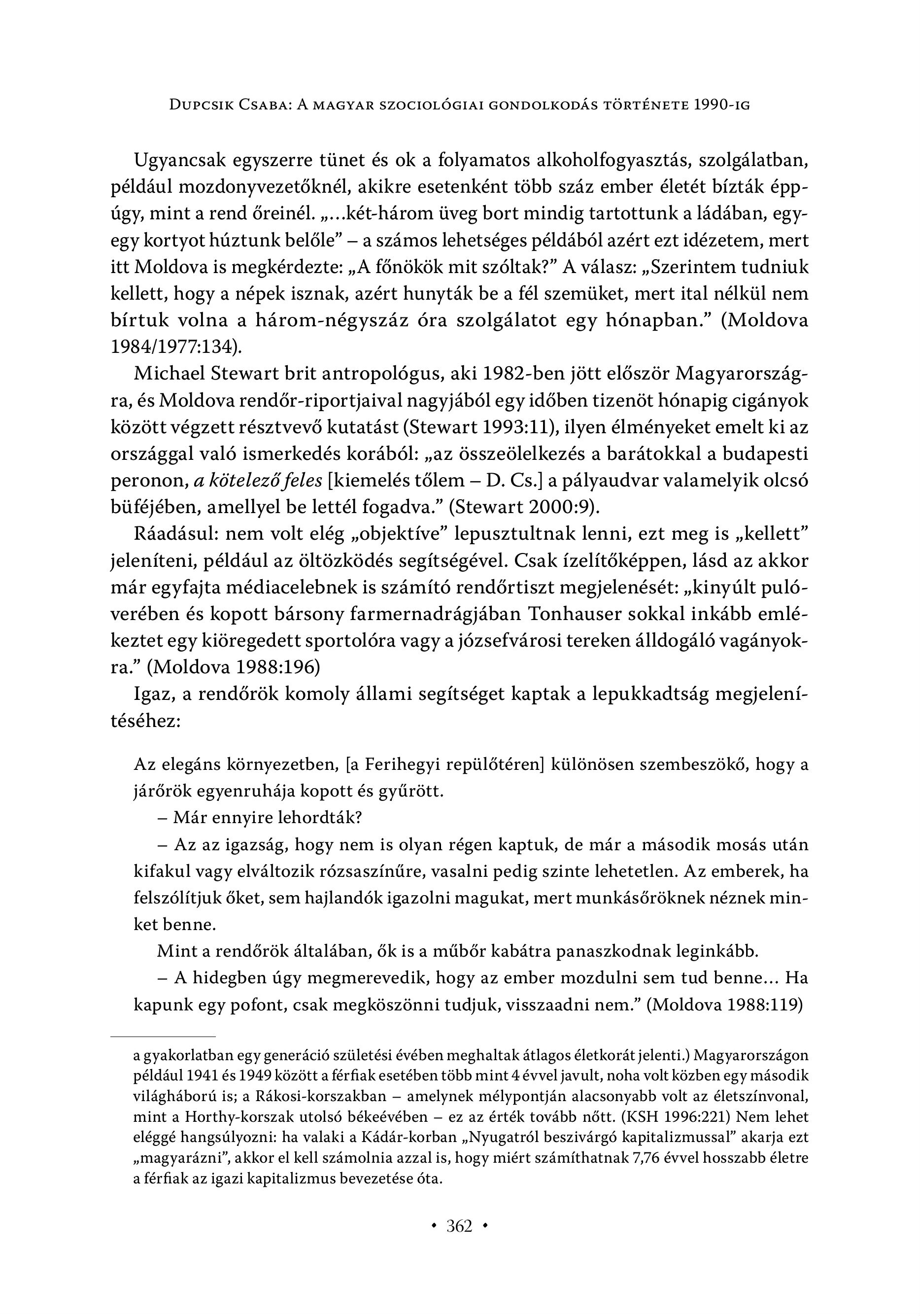 DUPCSIK CSABA: A MAGYAR SZOCIOLÓGIAI GONDOLKODÁS TÖRTÉNETE 1990-1G Ugyancsak egyszerre tünet és ok a folyamatos alkoholfogyasztás, szolgálatban, például mozdonyvezetőknél, akikre esetenként több száz ember életét bízták éppúgy, mint a rend őreinél. ,,...két-három üveg bort mindig tartottunk a ládában, egyegy kortyot húztunk belőle" — a számos lehetséges példából azért ezt idézetem, mert itt Moldova is megkérdezte: , A főnökök mit szóltak?" A válasz: , Szerintem tudniuk kellett, hogy a népek isznak, azért hunyták be a fél szemüket, mert ital nélkül nem bírtuk volna a három-négyszáz óra szolgálatot egy hónapban." (Moldova 1984/1977:134). Michael Stewart brit antropológus, aki 1982-ben jött először Magyarországra, és Moldova rendőr-riportjaival nagyjából egy időben tizenöt hónapig cigányok között végzett résztvevő kutatást (Stewart 1993:11), ilyen élményeket emelt ki az országgal való ismerkedés korából: , az összeölelkezés a barátokkal a budapesti peronon, a kötelező feles [kiemelés tőlem — D. Cs.] a pályaudvar valamelyik olcsó büféjében, amellyel be lettél fogadva." (Stewart 2000:9). Ráadásul: nem volt elég , objektíve" lepusztultnak lenni, ezt meg is , kellett" jeleníteni, például az öltözködés segítségével. Csak ízelítőképpen, lásd az akkor már egyfajta médiacelebnek is számító rendőrtiszt megjelenését: , kinyúlt pulóverében és kopott bársony farmernadrágjában Tonhauser sokkal inkább emlékeztet egy kiöregedett sportolóra vagy a józsefvárosi tereken álldogáló vagányokra.” (Moldova 1988:196) Igaz, a rendőrök komoly állami segítséget kaptak a lepukkadtsäg megjelenitéséhez: Az elegáns környezetben, [a Ferihegyi repülőtéren] különösen szembeszökő, hogy a járőrök egyenruhája kopott és gyűrött. — Már ennyire lehordták? — Az az igazság, hogy nem is olyan régen kaptuk, de már a második mosás után kifakul vagy elváltozik rózsaszínűre, vasalni pedig szinte lehetetlen. Az emberek, ha felszólítjuk őket, sem hajlandók igazolni magukat, mert munkásőröknek néznek minket benne. Mint a rendőrök általában, ők is a műbőr kabátra panaszkodnak leginkább. — A hidegben úgy megmerevedik, hogy az ember mozdulni sem tud benne... Ha kapunk egy pofont, csak megköszönni tudjuk, visszaadni nem." (Moldova 1988:119) a gyakorlatban egy generáció születési évében meghaltak átlagos életkorát jelenti.) Magyarországon például 1941 és 1949 között a férfiak esetében több mint 4 évvel javult, noha volt közben egy második világháború is; a Rákosi-korszakban — amelynek mélypontján alacsonyabb volt az életszínvonal, mint a Horthy-korszak utolsó békeévében - ez az érték tovább nőtt. (KSH 1996:221) Nem lehet eléggé hangsúlyozni: ha valaki a Kádár-korban , Nyugatról beszivárgó kapitalizmussal" akarja ezt , magyarázni", akkor el kell számolnia azzal is, hogy miért számíthatnak 7,76 évvel hosszabb életre a férfiak az igazi kapitalizmus bevezetése óta. * 362 +