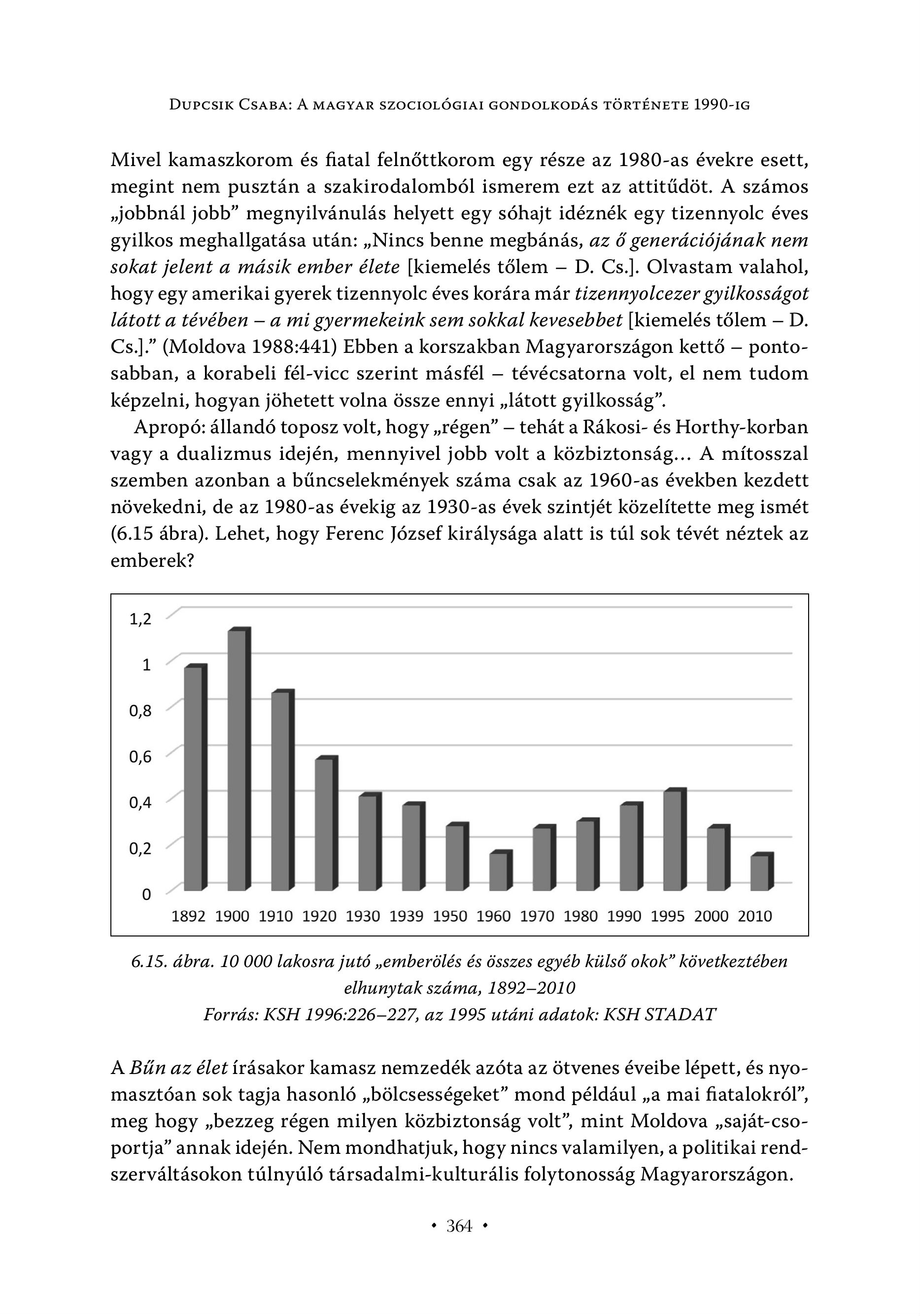 DUPCSIK CSABA: A MAGYAR SZOCIOLÓGIAI GONDOLKODÁS TÖRTÉNETE 1990-1G Mivel kamaszkorom és fiatal felnőttkorom egy része az 1980-as évekre esett, megint nem pusztán a szakirodalomból ismerem ezt az attitűdöt. A számos jobbnál jobb" megnyilvánulás helyett egy sóhajt idéznék egy tizennyolc éves gyilkos meghallgatása után: , Nincs benne megbánás, az ő generációjának nem sokat jelent a másik ember élete [kiemelés tőlem — D. Cs.]. Olvastam valahol, hogy egy amerikai gyerek tizennyolc éves korára már tizennyolcezer gyilkosságot látott a tévében - a mi gyermekeink sem sokkal kevesebbet [kiemelés tőlem — D. Cs.]." (Moldova 1988:441) Ebben a korszakban Magyarországon kettő — pontosabban, a korabeli fél-vicc szerint másfél — tévécsatorna volt, el nem tudom képzelni, hogyan jöhetett volna össze ennyi , látott gyilkosság". Apropó: állandó toposz volt, hogy , régen" — tehát a Rákosi- és Horthy-korban vagy a dualizmus idején, mennyivel jobb volt a közbiztonság... A mítosszal szemben azonban a bűncselekmények száma csak az 1960-as években kezdett növekedni, de az 1980-as évekig az 1930-as évek szintjét közelítette meg ismét (6.15 ábra). Lehet, hogy Ferenc József királysága alatt is túl sok tévét néztek az emberek? 12 1 0,8 0,6 0 1892 1900 1910 1920 1930 1939 1950 1960 1970 1980 1990 1995 2000 2010 > ND o 6.15. ábra. 10 000 lakosra jutó ,emberölés és összes egyéb külső okok" következtében elhunytak szama, 1892-2010 Forras: KSH 1996:226-227, az 1995 utani adatok: KSH STADAT A Bűn az élet írásakor kamasz nemzedék azóta az ötvenes éveibe lépett, és nyomasztóan sok tagja hasonló , bölcsességeket" mond például , a mai fiatalokról", meg hogy , bezzeg régen milyen közbiztonság volt", mint Moldova ,,sajat-csoportja" annak idején. Nem mondhatjuk, hogy nincs valamilyen, a politikai rendszerváltásokon túlnyúló társadalmi-kulturális folytonosság Magyarországon. * 364 +