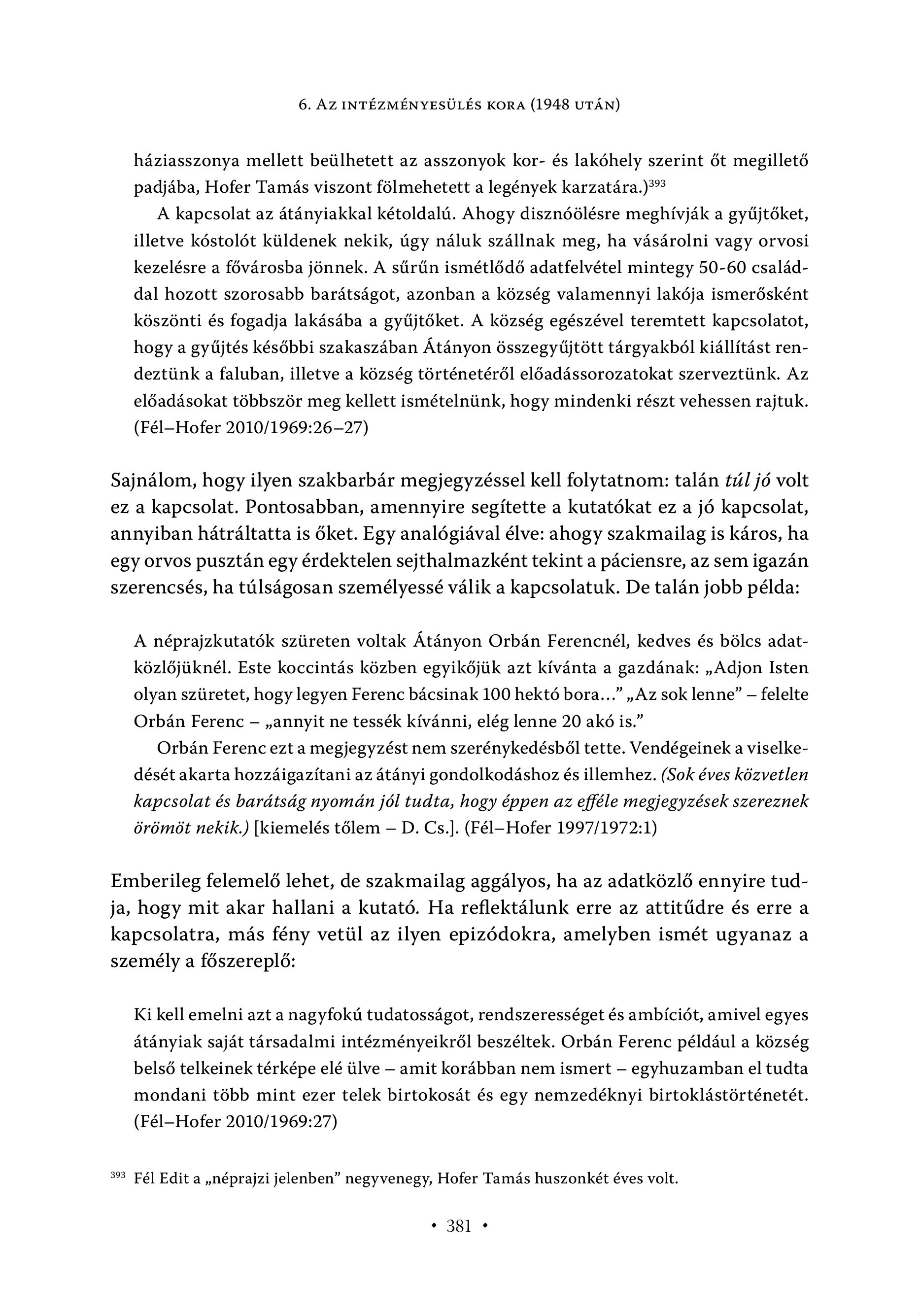 6. AZ INTÉZMÉNYESÜLÉS KORA (1948 UTÁN) háziasszonya mellett beülhetett az asszonyok kor- és lakóhely szerint őt megillető padjäba, Hofer Tamäs viszont fölmehetett a legenyek karzatära.)?” A kapcsolat az átányiakkal kétoldalú. Ahogy disznóölésre meghívják a gyüjtöket, illetve kóstolót küldenek nekik, úgy náluk szállnak meg, ha vásárolni vagy orvosi kezelésre a fővárosba jönnek. A sűrűn ismétlődő adatfelvétel mintegy 50-60 családdal hozott szorosabb barátságot, azonban a község valamennyi lakója ismerősként köszönti és fogadja lakásába a gyűjtőket. A község egészével teremtett kapcsolatot, hogy a gyűjtés későbbi szakaszában Átányon összegyűjtött tárgyakból kiállítást rendeztünk a faluban, illetve a község történetéről előadássorozatokat szerveztünk. Az előadásokat többször meg kellett ismételnünk, hogy mindenki részt vehessen rajtuk. (Fel-Hofer 2010/1969:26-27) Sajnálom, hogy ilyen szakbarbár megjegyzéssel kell folytatnom: talán túl jó volt ez a kapcsolat. Pontosabban, amennyire segítette a kutatókat ez a jó kapcsolat, annyiban hátráltatta is őket. Egy analógiával élve: ahogy szakmailag is káros, ha egy orvos pusztán egy érdektelen sejthalmazként tekint a páciensre, az sem igazán szerencsés, ha túlságosan személyessé válik a kapcsolatuk. De talán jobb példa: A néprajzkutatók szüreten voltak Átányon Orbán Ferencnél, kedves és bölcs adatközlöjüknel. Este koccintás közben egyikőjük azt kívánta a gazdának: , Adjon Isten olyan szüretet, hogy legyen Ferenc bácsinak 100 hektó bora..." , Az sok lenne" — felelte Orbán Ferenc - , annyit ne tessék kívánni, elég lenne 20 akó is." Orbán Ferenc ezt a megjegyzést nem szerénykedésből tette. Vendégeinek a viselkedését akarta hozzáigazítani az átányi gondolkodáshoz és illemhez. (Sok éves közvetlen kapcsolat és barátság nyomán jól tudta, hogy éppen az efféle megjegyzések szereznek örömöt nekik.) [kiemeles tölem — D. Cs.]. (Fél-Hofer 1997/1972:1) Emberileg felemelő lehet, de szakmailag aggályos, ha az adatközlő ennyire tudja, hogy mit akar hallani a kutató. Ha reflektálunk erre az attitűdre és erre a kapcsolatra, más fény vetül az ilyen epizódokra, amelyben ismét ugyanaz a személy a főszereplő: Ki kell emelni azt a nagyfokú tudatosságot, rendszerességet és ambíciót, amivel egyes átányiak saját társadalmi intézményeikről beszéltek. Orbán Ferenc például a község belső telkeinek térképe elé ülve — amit korábban nem ismert — egyhuzamban el tudta mondani több mint ezer telek birtokosát és egy nemzedéknyi birtoklástörténetét. (Fél-Hofer 2010/1969:27) 393 Fél Edit a , néprajzi jelenben" negyvenegy, Hofer Tamás huszonkét éves volt. * 381 °
