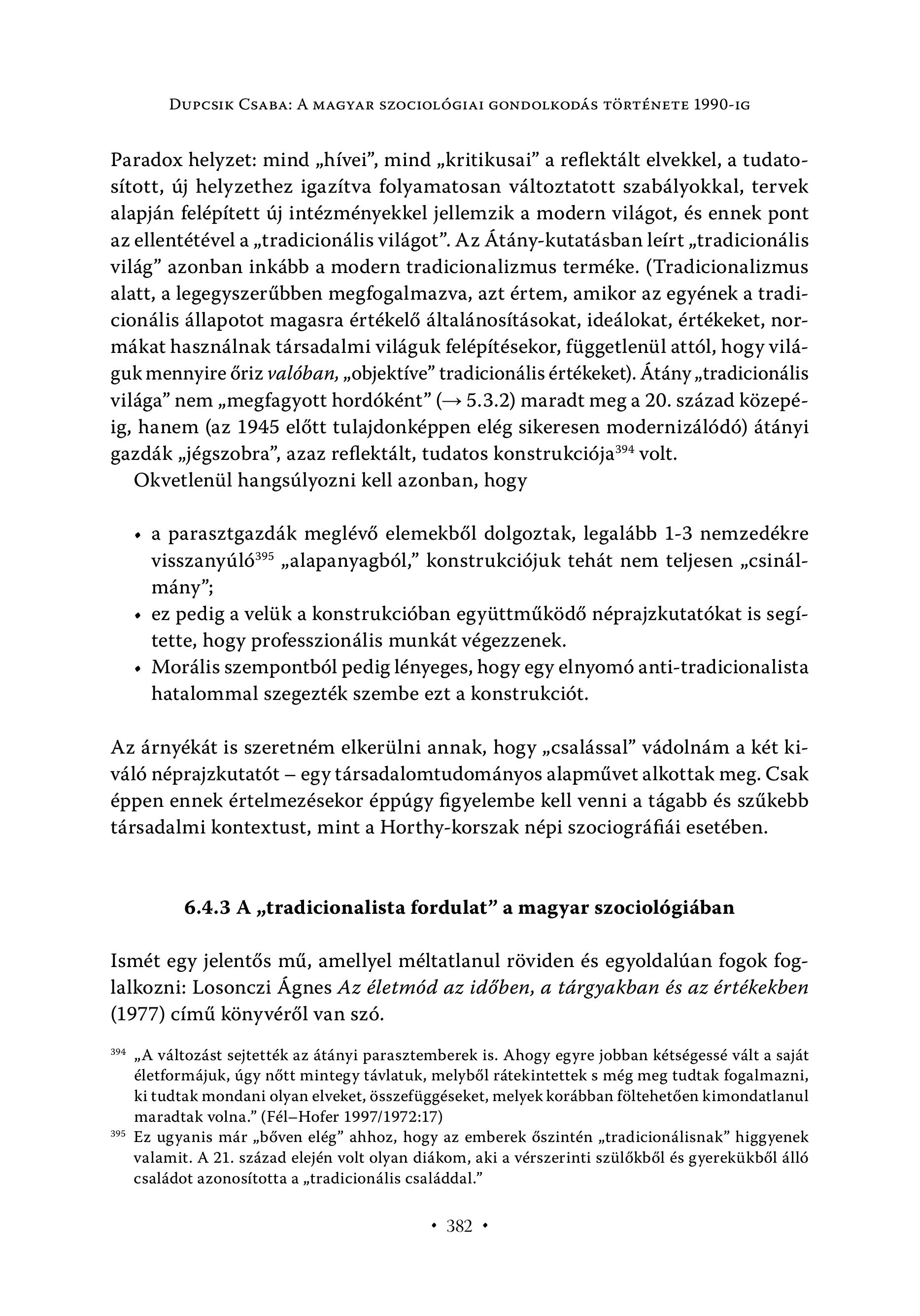 DUPCSIK CSABA: A MAGYAR SZOCIOLÓGIAI GONDOLKODÁS TÖRTÉNETE 1990-1G Paradox helyzet: mind , hívei", mind , kritikusai" a reflektált elvekkel, a tudatosított, új helyzethez igazítva folyamatosan változtatott szabályokkal, tervek alapján felépített új intézményekkel jellemzik a modern világot, és ennek pont az ellentétével a , tradicionális világot". Az Átány-kutatásban leírt , tradicionális világ" azonban inkább a modern tradicionalizmus terméke. (Tradicionalizmus alatt, a legegyszerűbben megfogalmazva, azt értem, amikor az egyének a tradicionális állapotot magasra értékelő általánosításokat, ideálokat, értékeket, normákat használnak társadalmi világuk felépítésekor, függetlenül attól, hogy világuk mennyire őriz valóban, ,objektíve" tradicionális értékeket). Átány , tradicionális világa" nem , megfagyott hordóként" (c 5.3.2) maradt meg a 20. század közepéig, hanem (az 1945 előtt tulajdonképpen elég sikeresen modernizálódó) átányi gazdák „jegszobra”, azaz reflektált, tudatos konstrukciója?" volt. Okvetlenül hangsúlyozni kell azonban, hogy s a parasztgazdák meglévő elemekből dolgoztak, legalább 1-3 nemzedékre visszanyúló?" , alapanyagból," konstrukciójuk tehát nem teljesen ,csinälmany”; s ez pedig a velük a konstrukcióban együttműködő néprajzkutatókat is segítette, hogy professzionális munkát végezzenek. s Morális szempontból pedig lényeges, hogy egy elnyomó anti-tradicionalista hatalommal szegezték szembe ezt a konstrukciót. Az árnyékát is szeretném elkerülni annak, hogy , csalással" vádolnám a két kiváló néprajzkutatót — egy társadalomtudományos alapművet alkottak meg. Csak éppen ennek értelmezésekor éppúgy figyelembe kell venni a tágabb és szűkebb társadalmi kontextust, mint a Horthy-korszak népi szociográfiái esetében. 6.4.3 A ,,tradicionalista fordulat” a magyar szociológiában Ismét egy jelentős mű, amellyel méltatlanul röviden és egyoldalúan fogok foglalkozni: Losonczi Ágnes Az életmód az időben, a tárgyakban és az értékekben (1977) című könyvéről van szó. 394 A változást sejtették az átányi parasztemberek is. Ahogy egyre jobban kétségessé vált a saját életformájuk, úgy nőtt mintegy távlatuk, melyből rátekintettek s még meg tudtak fogalmazni, ki tudtak mondani olyan elveket, összefüggéseket, melyek korábban föltehetően kimondatlanul maradtak volna." (Fél-Hofer 1997/1972:17) Ez ugyanis már , bőven elég" ahhoz, hogy az emberek őszintén ,tradicionálisnak" higgyenek valamit. A 21. század elején volt olyan diákom, aki a vérszerinti szülőkből és gyerekükből álló családot azonosította a , tradicionális családdal." 39: a * 382 "