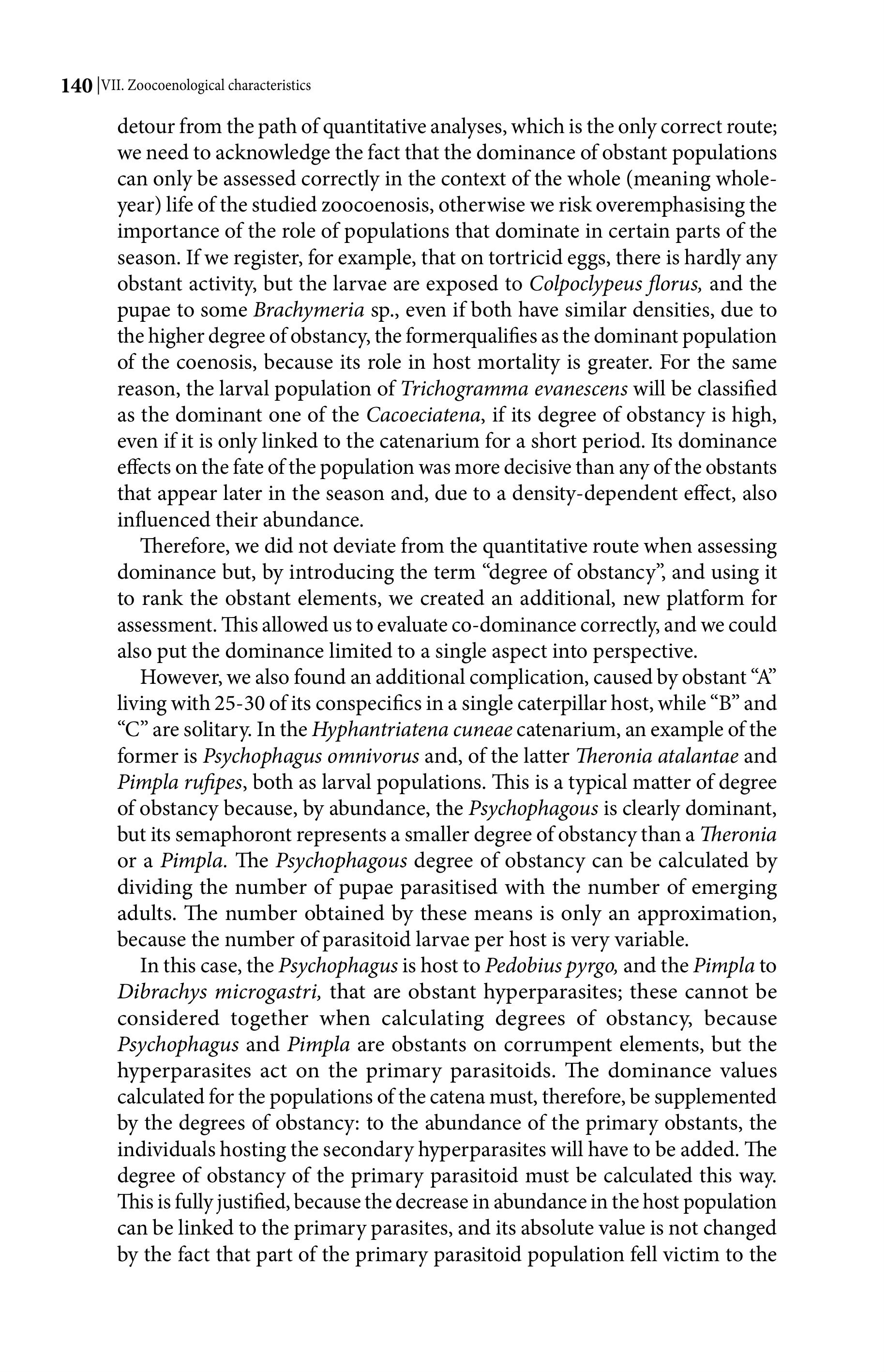 140 IVII. Zoocoenological characteristics detour from the path of guantitative analyses, which is the only correct route; we need to acknowledge the fact that the dominance of obstant populations can only be assessed correctly in the context of the whole (meaning wholeyear) life of the studied zoocoenosis, otherwise we risk overemphasising the importance of the role of populations that dominate in certain parts of the season. If we register, for example, that on tortricid eggs, there is hardly any obstant activity, but the larvae are exposed to Colpoclypeus florus, and the pupae to some Brachymeria sp., even if both have similar densities, due to the higher degree of obstancy, the formergualifies as the dominant population of the coenosis, because its role in host mortality is greater. For the same reason, the larval population of Trichogramma evanescens will be classified as the dominant one of the Cacoeciatena, if its degree of obstancy is high, even if it is only linked to the catenarium for a short period. Its dominance effects on the fate of the population was more decisive than any of the obstants that appear later in the season and, due to a density-dependent effect, also influenced their abundance. Therefore, we did not deviate from the quantitative route when assessing dominance but, by introducing the term “degree of obstancy’, and using it to rank the obstant elements, we created an additional, new platform for assessment. This allowed us to evaluate co-dominance correctly, and we could also put the dominance limited to a single aspect into perspective. However, we also found an additional complication, caused by obstant “A” living with 25-30 of its conspecifics in a single caterpillar host, while “B” and “C” are solitary. In the Hyphantriatena cuneae catenarium, an example of the former is Psychophagus omnivorus and, of the latter Theronia atalantae and Pimpla rufipes, both as larval populations. This is a typical matter of degree of obstancy because, by abundance, the Psychophagous is clearly dominant, but its semaphoront represents a smaller degree of obstancy than a Theronia or a Pimpla. The Psychophagous degree of obstancy can be calculated by dividing the number of pupae parasitised with the number of emerging adults. The number obtained by these means is only an approximation, because the number of parasitoid larvae per host is very variable. In this case, the Psychophagus is host to Pedobius pyrgo, and the Pimpla to Dibrachys microgastri, that are obstant hyperparasites; these cannot be considered together when calculating degrees of obstancy, because Psychophagus and Pimpla are obstants on corrumpent elements, but the hyperparasites act on the primary parasitoids. The dominance values calculated for the populations of the catena must, therefore, be supplemented by the degrees of obstancy: to the abundance of the primary obstants, the individuals hosting the secondary hyperparasites will have to be added. The degree of obstancy of the primary parasitoid must be calculated this way. This is fully justified, because the decrease in abundance in the host population can be linked to the primary parasites, and its absolute value is not changed by the fact that part of the primary parasitoid population fell victim to the