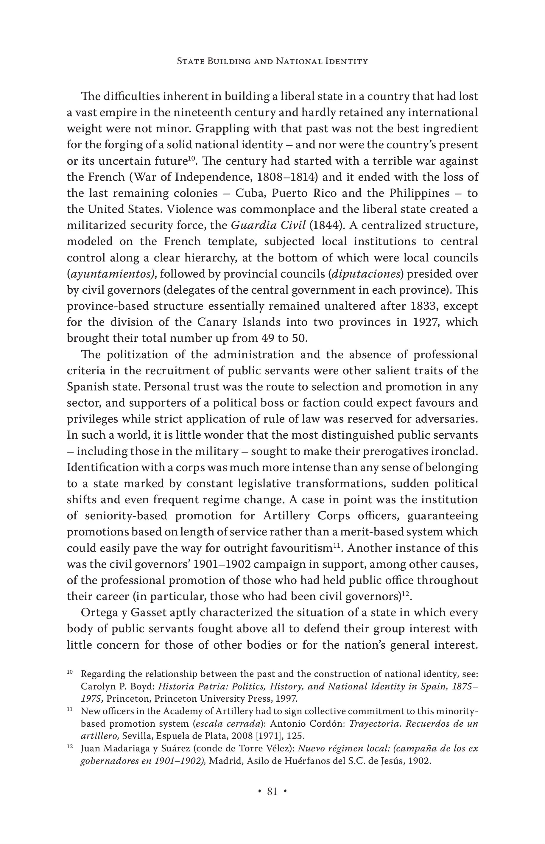 STATE BUILDING AND NATIONAL IDENTITY The difficulties inherent in building a liberal state in a country that had lost a vast empire in the nineteenth century and hardly retained any international weight were not minor. Grappling with that past was not the best ingredient for the forging of a solid national identity — and nor were the country’s present or its uncertain future’. The century had started with a terrible war against the French (War of Independence, 1808-1814) and it ended with the loss of the last remaining colonies — Cuba, Puerto Rico and the Philippines — to the United States. Violence was commonplace and the liberal state created a militarized security force, the Guardia Civil (1844). A centralized structure, modeled on the French template, subjected local institutions to central control along a clear hierarchy, at the bottom of which were local councils (ayuntamientos), followed by provincial councils (diputaciones) presided over by civil governors (delegates of the central government in each province). This province-based structure essentially remained unaltered after 1833, except for the division of the Canary Islands into two provinces in 1927, which brought their total number up from 49 to 50. The politization of the administration and the absence of professional criteria in the recruitment of public servants were other salient traits of the Spanish state. Personal trust was the route to selection and promotion in any sector, and supporters of a political boss or faction could expect favours and privileges while strict application of rule of law was reserved for adversaries. In such a world, it is little wonder that the most distinguished public servants — including those in the military — sought to make their prerogatives ironclad. Identification with a corps was much more intense than any sense of belonging to a state marked by constant legislative transformations, sudden political shifts and even frequent regime change. A case in point was the institution of seniority-based promotion for Artillery Corps officers, guaranteeing promotions based on length of service rather than a merit-based system which could easily pave the way for outright favouritism’. Another instance of this was the civil governors’ 1901-1902 campaign in support, among other causes, of the professional promotion of those who had held public office throughout their career (in particular, those who had been civil governors)”. Ortega y Gasset aptly characterized the situation of a state in which every body of public servants fought above all to defend their group interest with little concern for those of other bodies or for the nation’s general interest. 10 Regarding the relationship between the past and the construction of national identity, see: Carolyn P. Boyd: Historia Patria: Politics, History, and National Identity in Spain, 18751975, Princeton, Princeton University Press, 1997. New officers in the Academy of Artillery had to sign collective commitment to this minoritybased promotion system (escala cerrada): Antonio Cordén: Trayectoria. Recuerdos de un artillero, Sevilla, Espuela de Plata, 2008 [1971], 125. Juan Madariaga y Suarez (conde de Torre Vélez): Nuevo régimen local: (campana de los ex gobernadores en 1901-1902), Madrid, Asilo de Huérfanos del S.C. de Jestis, 1902. +81 +