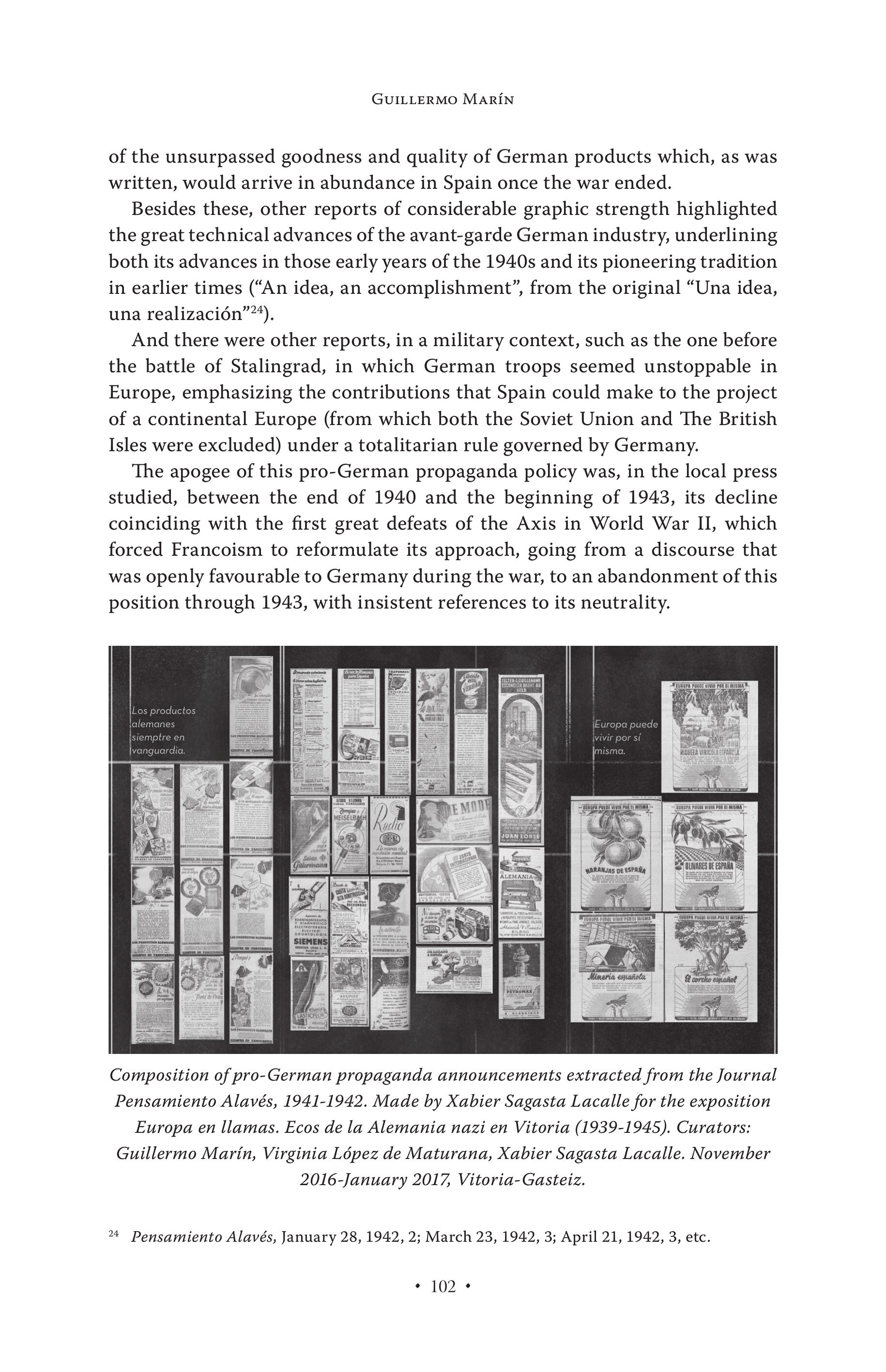 GUILLERMO MARÍN of the unsurpassed goodness and guality of German products which, as was written, would arrive in abundance in Spain once the war ended. Besides these, other reports of considerable graphic strength highlighted the great technical advances of the avant-garde German industry, underlining both its advances in those early years of the 1940s and its pioneering tradition in earlier times (“An idea, an accomplishment”, from the original “Una idea, una realizacién””’). And there were other reports, in a military context, such as the one before the battle of Stalingrad, in which German troops seemed unstoppable in Europe, emphasizing the contributions that Spain could make to the project of a continental Europe (from which both the Soviet Union and The British Isles were excluded) under a totalitarian rule governed by Germany. The apogee of this pro-German propaganda policy was, in the local press studied, between the end of 1940 and the beginning of 1943, its decline coinciding with the first great defeats of the Axis in World War II, which forced Francoism to reformulate its approach, going from a discourse that was openly favourable to Germany during the war, to an abandonment of this position through 1943, with insistent references to its neutrality. Pensamiento Alavés, 1941-1942. Made by Xabier Sagasta Lacalle for the exposition Europa en llamas. Ecos de la Alemania nazi en Vitoria (1939-1945). Curators: Guillermo Marin, Virginia Lopez de Maturana, Xabier Sagasta Lacalle. November 2016-January 2017, Vitoria-Gasteiz. 4 Pensamiento Alaves, January 28, 1942, 2; March 23, 1942, 3; April 21, 1942, 3, etc. * 102 +