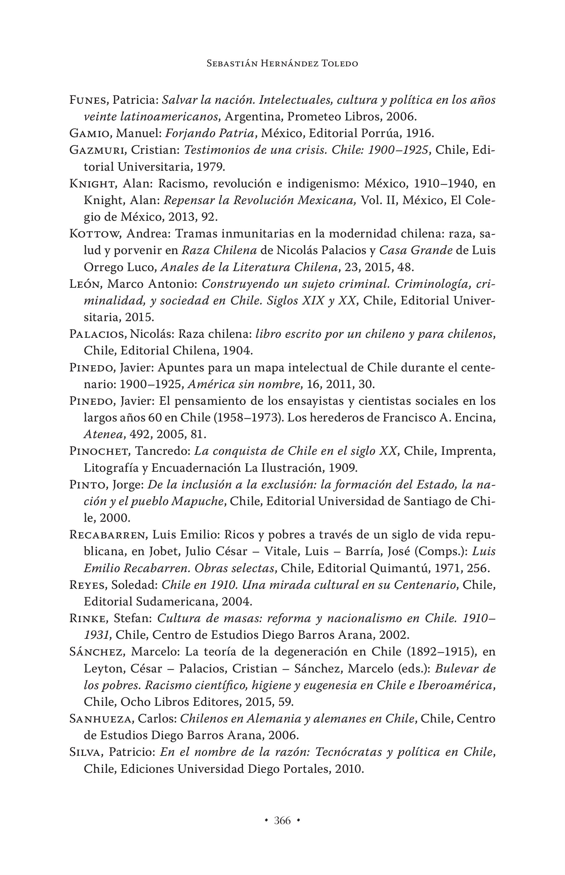 SEBASTIÁN HERNÁNDEZ TOLEDO FUNES, Patricia: Salvar la nacion. Intelectuales, cultura y politica en los años veinte latinoamericanos, Argentina, Prometeo Libros, 2006. GAMIO, Manuel: Forjando Patria, México, Editorial Porrüa, 1916. GAZMURI, Cristian: Testimonios de una crisis. Chile: 1900-1925, Chile, Editorial Universitaria, 1979. KNIGHT, Alan: Racismo, revolucién e indigenismo: México, 1910-1940, en Knight, Alan: Repensar la Revoluciôn Mexicana, Vol. II, México, El Colegio de México, 2013, 92. KoTTow, Andrea: Tramas inmunitarias en la modernidad chilena: raza, salud y porvenir en Raza Chilena de Nicolas Palacios y Casa Grande de Luis Orrego Luco, Anales de la Literatura Chilena, 23, 2015, 48. LEON, Marco Antonio: Construyendo un sujeto criminal. Criminologia, criminalidad, y sociedad en Chile. Siglos XIX y XX, Chile, Editorial Universitaria, 2015. PaLacios, Nicolas: Raza chilena: libro escrito por un chileno y para chilenos, Chile, Editorial Chilena, 1904. PINEDO, Javier: Apuntes para un mapa intelectual de Chile durante el centenario: 1900-1925, América sin nombre, 16, 2011, 30. PINEDO, Javier: El pensamiento de los ensayistas y cientistas sociales en los largos afios 60 en Chile (1958-1973). Los herederos de Francisco A. Encina, Atenea, 492, 2005, 81. PINOCHET, Tancredo: La conquista de Chile en el siglo XX, Chile, Imprenta, Litografia y Encuadernaciön La Ilustraciön, 1909. PINTO, Jorge: De la inclusiôn a la exclusion: la formacion del Estado, la nación y el pueblo Mapuche, Chile, Editorial Universidad de Santiago de Chile, 2000. RECABARREN, Luis Emilio: Ricos y pobres a través de un siglo de vida republicana, en Jobet, Julio César — Vitale, Luis — Barria, José (Comps.): Luis Emilio Recabarren. Obras selectas, Chile, Editorial Quimantü, 1971, 256. REYES, Soledad: Chile en 1910. Una mirada cultural en su Centenario, Chile, Editorial Sudamericana, 2004. RINKE, Stefan: Cultura de masas: reforma y nacionalismo en Chile. 19101931, Chile, Centro de Estudios Diego Barros Arana, 2002. SANCHEZ, Marcelo: La teoria de la degeneracién en Chile (1892-1915), en Leyton, César — Palacios, Cristian — Sänchez, Marcelo (eds.): Bulevar de los pobres. Racismo cientifico, higiene y eugenesia en Chile e Iberoamérica, Chile, Ocho Libros Editores, 2015, 59. SANHUEZA, Carlos: Chilenos en Alemania y alemanes en Chile, Chile, Centro de Estudios Diego Barros Arana, 2006. SILVA, Patricio: En el nombre de la razôn: Tecncratas y politica en Chile, Chile, Ediciones Universidad Diego Portales, 2010. * 366 *
