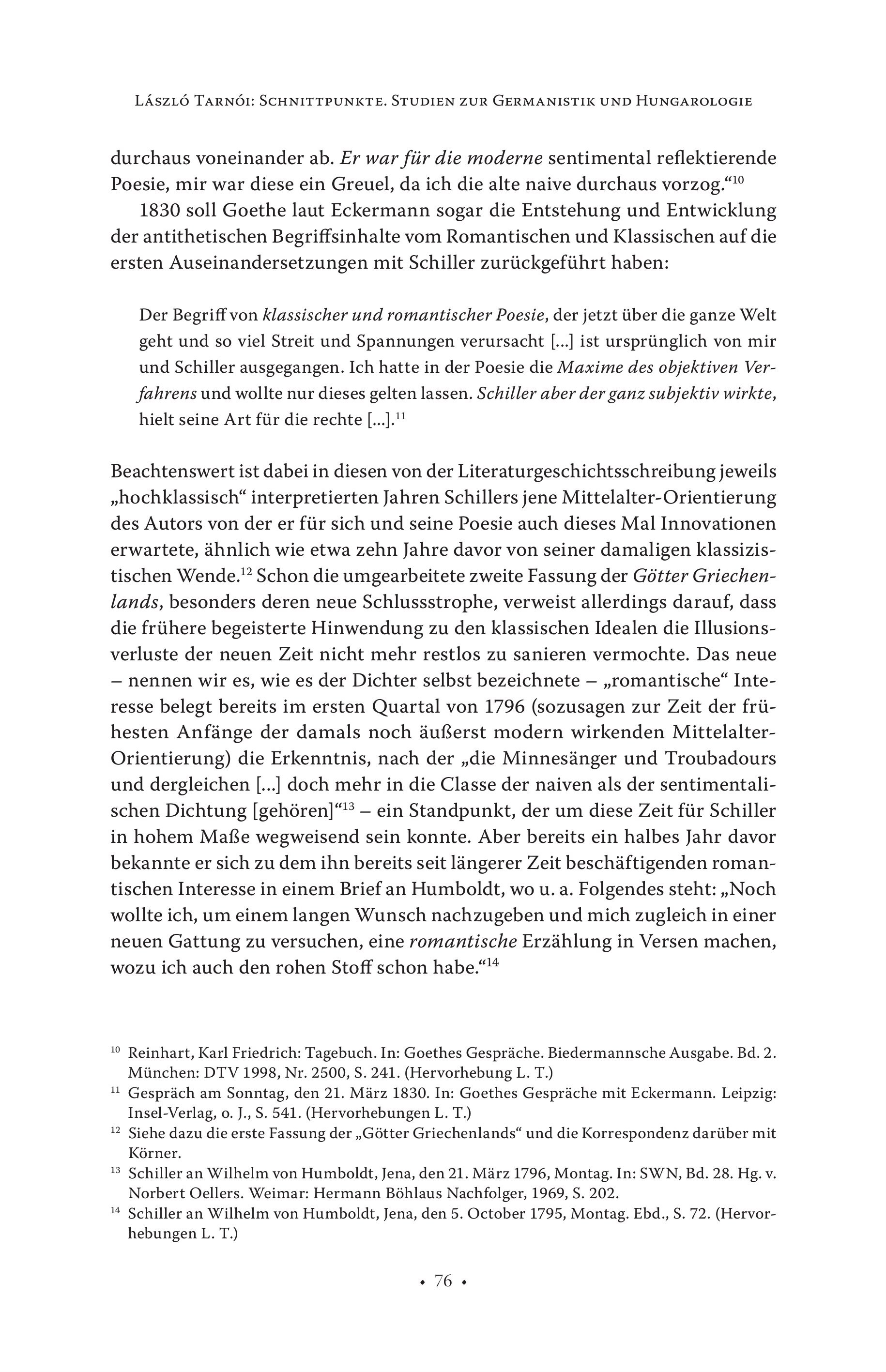 LÁSZLÓ TARNÓI: SCHNITTPUNKTE. STUDIEN ZUR GERMANISTIK UND HUNGAROLOGIE durchaus voneinander ab. Er war für die moderne sentimental reflektierende Poesie, mir war diese ein Greuel, da ich die alte naive durchaus vorzog."" 1830 soll Goethe laut Eckermann sogar die Entstehung und Entwicklung der antithetischen Begriffsinhalte vom Romantischen und Klassischen auf die ersten Auseinandersetzungen mit Schiller zurückgeführt haben: Der Begriff von klassischer und romantischer Poesie, der jetzt über die ganze Welt geht und so viel Streit und Spannungen verursacht [...] ist ursprünglich von mir und Schiller ausgegangen. Ich hatte in der Poesie die Maxime des objektiven VerJahrens und wollte nur dieses gelten lassen. Schiller aber der ganz subjektiv wirkte, hielt seine Art für die rechte [...]." Beachtenswert ist dabei in diesen von der Literaturgeschichtsschreibung jeweils „hochklassisch“ interpretierten Jahren Schillers jene Mittelalter-Orientierung des Autors von der er für sich und seine Poesie auch dieses Mal Innovationen erwartete, ähnlich wie etwa zehn Jahre davor von seiner damaligen klassizistischen Wende.!? Schon die umgearbeitete zweite Fassung der Götter Griechenlands, besonders deren neue Schlussstrophe, verweist allerdings darauf, dass die frühere begeisterte Hinwendung zu den klassischen Idealen die Illusionsverluste der neuen Zeit nicht mehr restlos zu sanieren vermochte. Das neue — nennen wir es, wie es der Dichter selbst bezeichnete — „romantische“ Interesse belegt bereits im ersten Quartal von 1796 (sozusagen zur Zeit der frühesten Anfänge der damals noch äußerst modern wirkenden MittelalterOrientierung) die Erkenntnis, nach der „die Minnesänger und Troubadours und dergleichen [...] doch mehr in die Classe der naiven als der sentimentalischen Dichtung [gehören]“'? - ein Standpunkt, der um diese Zeit für Schiller in hohem Maße wegweisend sein konnte. Aber bereits ein halbes Jahr davor bekannte er sich zu dem ihn bereits seit längerer Zeit beschäftigenden romantischen Interesse in einem Brief an Humboldt, wo u. a. Folgendes steht: „Noch wollte ich, um einem langen Wunsch nachzugeben und mich zugleich in einer neuen Gattung zu versuchen, eine romantische Erzählung in Versen machen, wozu ich auch den rohen Stoff schon habe.“'? 1 s Reinhart, Karl Friedrich: Tagebuch. In: Goethes Gespráche. Biedermannsche Ausgabe. Bd. 2. München: DTV 1998, Nr. 2500, S. 241. (Hervorhebung L. T.) Gesprách am Sonntag, den 21. Márz 1830. In: Goethes Gespráche mit Eckermann. Leipzig: Insel-Verlag, o. J., S. 541. (Hervorhebungen L. T.) Siehe dazu die erste Fassung der „Götter Griechenlands“ und die Korrespondenz darüber mit Körner. Schiller an Wilhelm von Humboldt, Jena, den 21. März 1796, Montag. In: SWN, Bd. 28. Hg. v. Norbert Oellers. Weimar: Hermann Böhlaus Nachfolger, 1969, S. 202. Schiller an Wilhelm von Humboldt, Jena, den 5. October 1795, Montag. Ebd., S. 72. (Hervorhebungen L. T.) 1 E 1 DS 1 u 1 i + 76 +