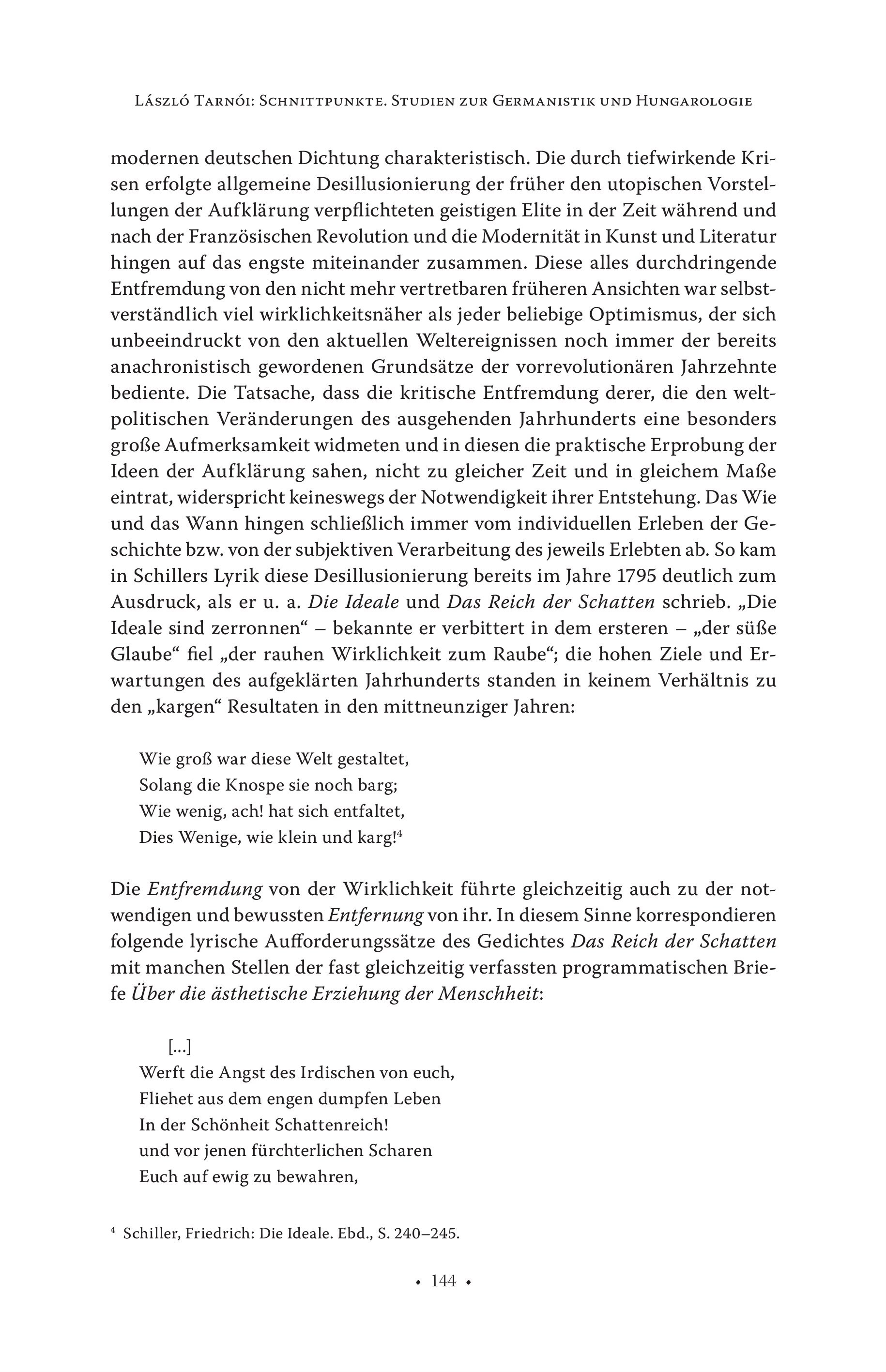 LÁSZLÓ TARNÓI: SCHNITTPUNKTE. STUDIEN ZUR GERMANISTIK UND HUNGAROLOGIE modernen deutschen Dichtung charakteristisch. Die durch tiefwirkende Krisen erfolgte allgemeine Desillusionierung der früher den utopischen Vorstellungen der Aufklärung verpflichteten geistigen Elite in der Zeit während und nach der Französischen Revolution und die Modernität in Kunst und Literatur hingen auf das engste miteinander zusammen. Diese alles durchdringende Entfremdung von den nicht mehr vertretbaren früheren Ansichten war selbstverständlich viel wirklichkeitsnäher als jeder beliebige Optimismus, der sich unbeeindruckt von den aktuellen Weltereignissen noch immer der bereits anachronistisch gewordenen Grundsätze der vorrevolutionären Jahrzehnte bediente. Die Tatsache, dass die kritische Entfremdung derer, die den weltpolitischen Veränderungen des ausgehenden Jahrhunderts eine besonders große Aufmerksamkeit widmeten und in diesen die praktische Erprobung der Ideen der Aufklärung sahen, nicht zu gleicher Zeit und in gleichem Maße eintrat, widerspricht keineswegs der Notwendigkeit ihrer Entstehung. Das Wie und das Wann hingen schließlich immer vom individuellen Erleben der Geschichte bzw. von der subjektiven Verarbeitung des jeweils Erlebten ab. So kam in Schillers Lyrik diese Desillusionierung bereits im Jahre 1795 deutlich zum Ausdruck, als er u. a. Die Ideale und Das Reich der Schatten schrieb. „Die Ideale sind zerronnen“ — bekannte er verbittert in dem ersteren — „der süße Glaube“ fiel „der rauhen Wirklichkeit zum Raube“; die hohen Ziele und Erwartungen des aufgeklärten Jahrhunderts standen in keinem Verhältnis zu den „kargen“ Resultaten in den mittneunziger Jahren: Wie groß war diese Welt gestaltet, Solang die Knospe sie noch barg; Wie wenig, ach! hat sich entfaltet, Dies Wenige, wie klein und karg!* Die Entfremdung von der Wirklichkeit führte gleichzeitig auch zu der notwendigen und bewussten Entfernung von ihr. In diesem Sinne korrespondieren folgende lyrische Aufforderungssatze des Gedichtes Das Reich der Schatten mit manchen Stellen der fast gleichzeitig verfassten programmatischen Briefe Über die ästhetische Erziehung der Menschheit: [...] Werft die Angst des Irdischen von euch, Fliehet aus dem engen dumpfen Leben In der Schönheit Schattenreich! und vor jenen fürchterlichen Scharen Euch auf ewig zu bewahren, * Schiller, Friedrich: Die Ideale. Ebd., S. 240-245. + 144