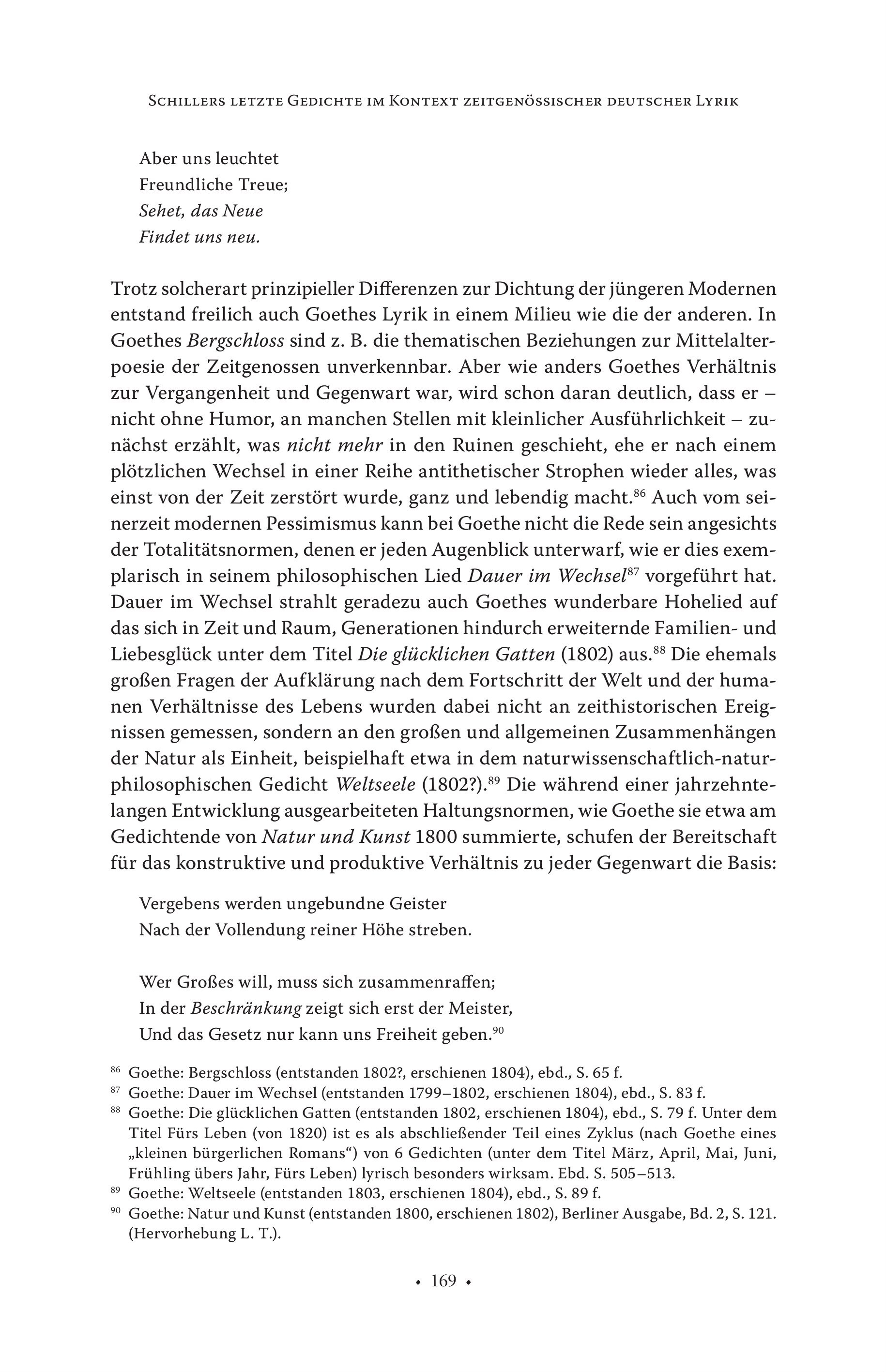 SCHILLERS LETZTE GEDICHTE IM KONTEXT ZEITGENÖSSISCHER DEUTSCHER LYRIK Aber uns leuchtet Freundliche Treue; Sehet, das Neue Findet uns neu. Trotz solcherart prinzipieller Differenzen zur Dichtung der jüngeren Modernen entstand freilich auch Goethes Lyrik in einem Milieu wie die der anderen. In Goethes Bergschloss sind z. B. die thematischen Beziehungen zur Mittelalterpoesie der Zeitgenossen unverkennbar. Aber wie anders Goethes Verhältnis zur Vergangenheit und Gegenwart war, wird schon daran deutlich, dass er — nicht ohne Humor, an manchen Stellen mit kleinlicher Ausführlichkeit — zunächst erzählt, was nicht mehr in den Ruinen geschieht, ehe er nach einem plötzlichen Wechsel in einer Reihe antithetischer Strophen wieder alles, was einst von der Zeit zerstört wurde, ganz und lebendig macht.®® Auch vom seinerzeit modernen Pessimismus kann bei Goethe nicht die Rede sein angesichts der Totalitätsnormen, denen er jeden Augenblick unterwarf, wie er dies exemplarisch in seinem philosophischen Lied Dauer im Wechsel” vorgeführt hat. Dauer im Wechsel strahlt geradezu auch Goethes wunderbare Hohelied auf das sich in Zeit und Raum, Generationen hindurch erweiternde Familien- und Liebesglück unter dem Titel Die glücklichen Gatten (1802) aus. Die ehemals großen Fragen der Aufklärung nach dem Fortschritt der Welt und der humanen Verhältnisse des Lebens wurden dabei nicht an zeithistorischen Ereignissen gemessen, sondern an den großen und allgemeinen Zusammenhängen der Natur als Einheit, beispielhaft etwa in dem naturwissenschaftlich-naturphilosophischen Gedicht Weltseele (1802). Die während einer jahrzehntelangen Entwicklung ausgearbeiteten Haltungsnormen, wie Goethe sie etwa am Gedichtende von Natur und Kunst 1800 summierte, schufen der Bereitschaft für das konstruktive und produktive Verhältnis zu jeder Gegenwart die Basis: Vergebens werden ungebundne Geister Nach der Vollendung reiner Höhe streben. Wer Großes will, muss sich zusammenraffen; In der Beschränkung zeigt sich erst der Meister, Und das Gesetz nur kann uns Freiheit geben.” 8 a Goethe: Bergschloss (entstanden 1802?, erschienen 1804), ebd., S. 65 f. Goethe: Dauer im Wechsel (entstanden 1799-1802, erschienen 1804), ebd., S. 83 f. Goethe: Die gliicklichen Gatten (entstanden 1802, erschienen 1804), ebd., S. 79 f. Unter dem Titel Fürs Leben (von 1820) ist es als abschließender Teil eines Zyklus (nach Goethe eines „kleinen bürgerlichen Romans“) von 6 Gedichten (unter dem Titel März, April, Mai, Juni, Frühling übers Jahr, Fürs Leben) lyrisch besonders wirksam. Ebd. S. 505-513. Goethe: Weltseele (entstanden 1803, erschienen 1804), ebd., S. 89 £. Goethe: Natur und Kunst (entstanden 1800, erschienen 1802), Berliner Ausgabe, Bd. 2, S. 121. (Hervorhebung L. T.). 8 & 8 œ 8 © 9 Ss + 169 «
