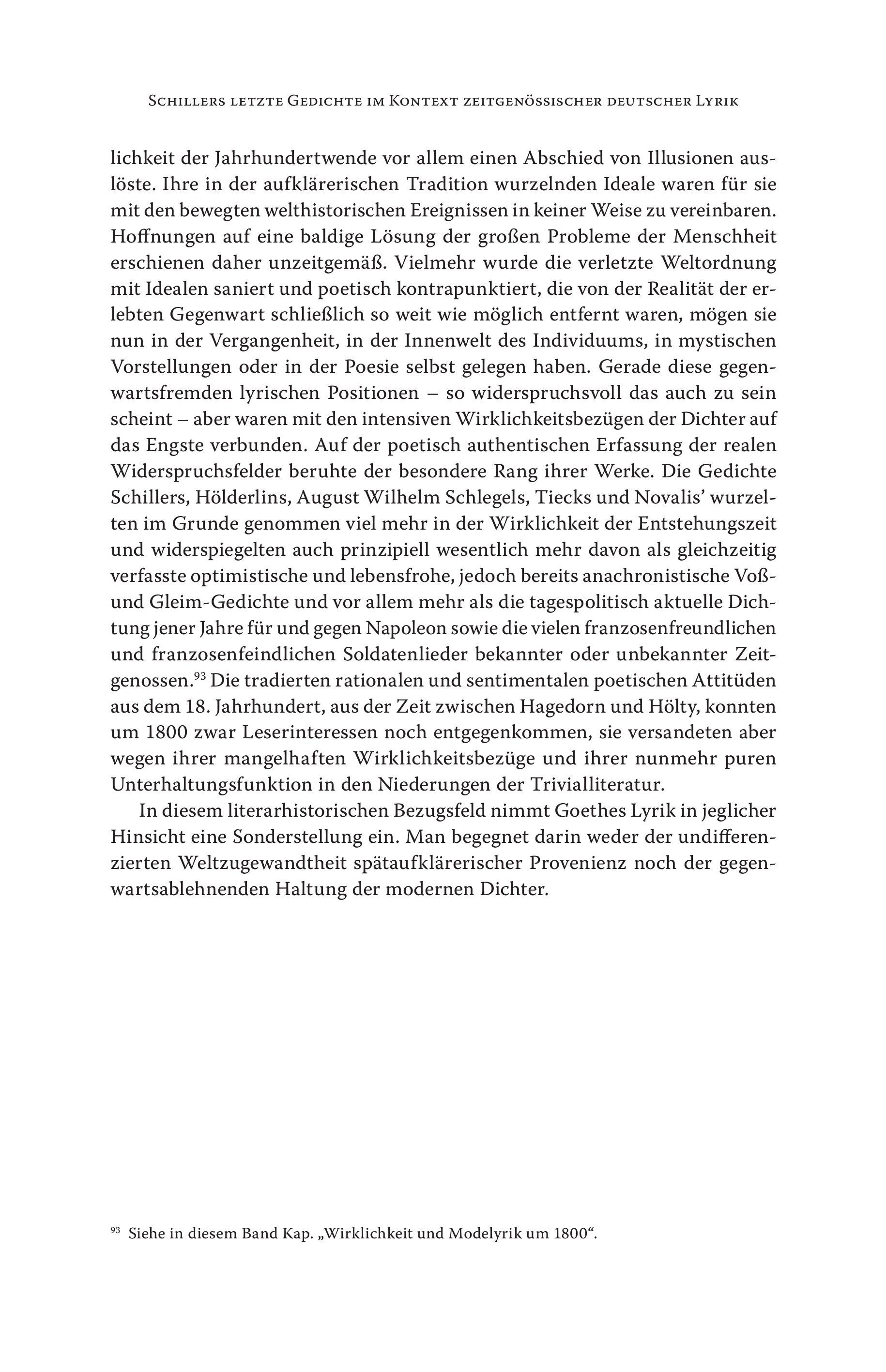 SCHILLERS LETZTE GEDICHTE IM KONTEXT ZEITGENÖSSISCHER DEUTSCHER LYRIK lichkeit der Jahrhundertwende vor allem einen Abschied von Illusionen auslöste. Ihre in der aufklärerischen Tradition wurzelnden Ideale waren für sie mit den bewegten welthistorischen Ereignissen in keiner Weise zu vereinbaren. Hoffnungen auf eine baldige Lösung der großen Probleme der Menschheit erschienen daher unzeitgemäß. Vielmehr wurde die verletzte Weltordnung mit Idealen saniert und poetisch kontrapunktiert, die von der Realität der erlebten Gegenwart schließlich so weit wie möglich entfernt waren, mögen sie nun in der Vergangenheit, in der Innenwelt des Individuums, in mystischen Vorstellungen oder in der Poesie selbst gelegen haben. Gerade diese gegenwartsfremden Iyrischen Positionen — so widerspruchsvoll das auch zu sein scheint — aber waren mit den intensiven Wirklichkeitsbezügen der Dichter auf das Engste verbunden. Auf der poetisch authentischen Erfassung der realen Widerspruchsfelder beruhte der besondere Rang ihrer Werke. Die Gedichte Schillers, Hölderlins, August Wilhelm Schlegels, Tiecks und Novalis’ wurzelten im Grunde genommen viel mehr in der Wirklichkeit der Entstehungszeit und widerspiegelten auch prinzipiell wesentlich mehr davon als gleichzeitig verfasste optimistische und lebensfrohe, jedoch bereits anachronistische Voßund Gleim-Gedichte und vor allem mehr als die tagespolitisch aktuelle Dichtung jener Jahre für und gegen Napoleon sowie die vielen franzosenfreundlichen und franzosenfeindlichen Soldatenlieder bekannter oder unbekannter Zeitgenossen.” Die tradierten rationalen und sentimentalen poetischen Attitüden aus dem 18. Jahrhundert, aus der Zeit zwischen Hagedorn und Hölty, konnten um 1800 zwar Leserinteressen noch entgegenkommen, sie versandeten aber wegen ihrer mangelhaften Wirklichkeitsbezüge und ihrer nunmehr puren Unterhaltungsfunktion in den Niederungen der Trivialliteratur. In diesem literarhistorischen Bezugsfeld nimmt Goethes Lyrik in jeglicher Hinsicht eine Sonderstellung ein. Man begegnet darin weder der undifferenzierten Weltzugewandtheit spätaufklärerischer Provenienz noch der gegenwartsablehnenden Haltung der modernen Dichter. ®® Siehe in diesem Band Kap. „Wirklichkeit und Modelyrik um 1800“.