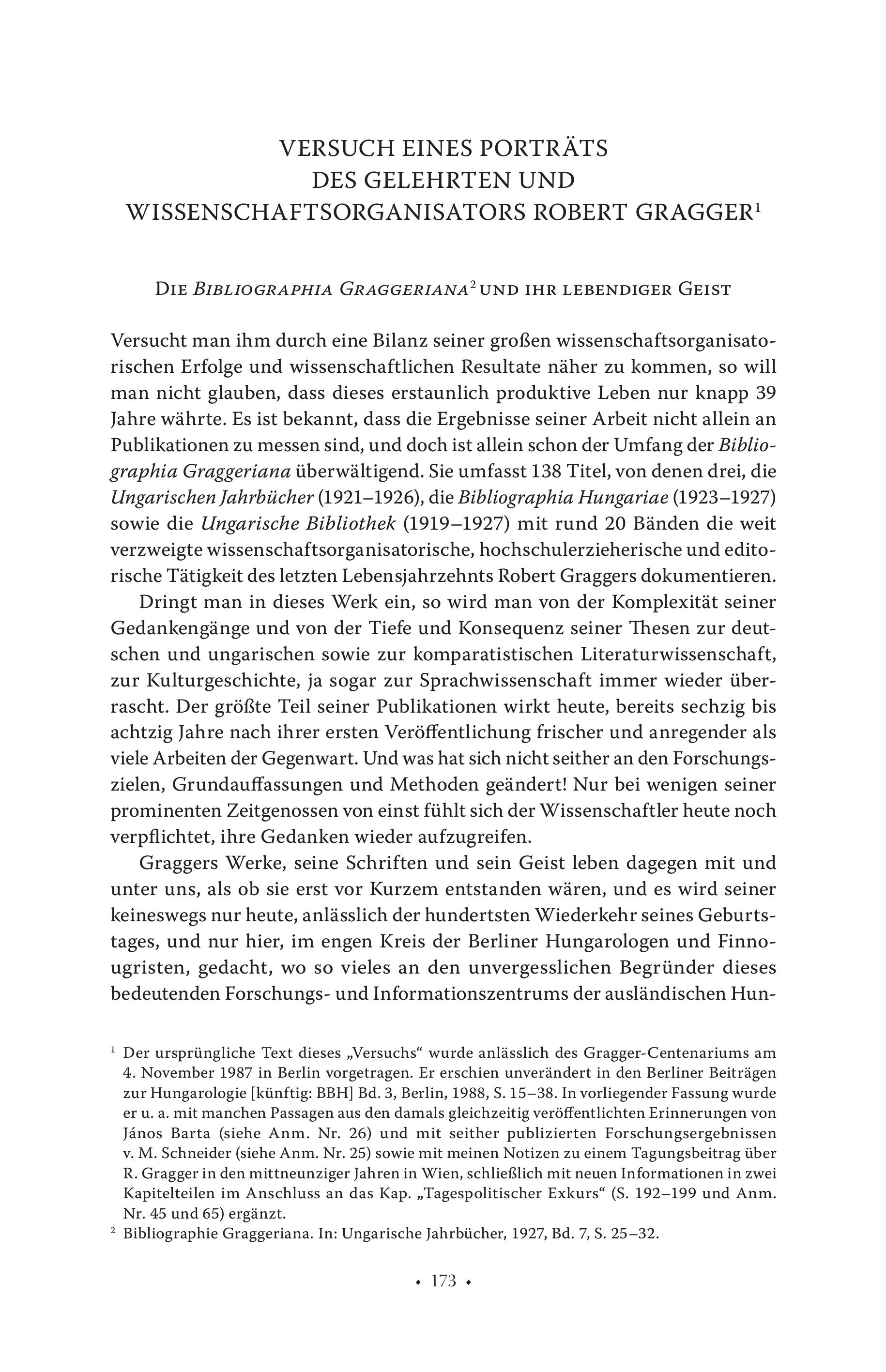 VERSUCH EINES PORTRÁTS DES GELEHRTEN UND WISSENSCHAFTSORGANISATORS ROBERT GRAGGER! DIE BIBLIOGRAPHIA GRAGGERIANA” UND IHR LEBENDIGER GEIST Versucht man ihm durch eine Bilanz seiner großen wissenschaftsorganisatorischen Erfolge und wissenschaftlichen Resultate näher zu kommen, so will man nicht glauben, dass dieses erstaunlich produktive Leben nur knapp 39 Jahre währte. Es ist bekannt, dass die Ergebnisse seiner Arbeit nicht allein an Publikationen zu messen sind, und doch ist allein schon der Umfang der Bibliographia Graggeriana überwältigend. Sie umfasst 138 Titel, von denen drei, die Ungarischen Jahrbücher (1921-1926), die Bibliographia Hungariae (1923-1927) sowie die Ungarische Bibliothek (1919-1927) mit rund 20 Bänden die weit verzweigte wissenschaftsorganisatorische, hochschulerzieherische und editorische Tätigkeit des letzten Lebensjahrzehnts Robert Graggers dokumentieren. Dringt man in dieses Werk ein, so wird man von der Komplexität seiner Gedankengänge und von der Tiefe und Konsequenz seiner Thesen zur deutschen und ungarischen sowie zur komparatistischen Literaturwissenschaft, zur Kulturgeschichte, ja sogar zur Sprachwissenschaft immer wieder überrascht. Der größte Teil seiner Publikationen wirkt heute, bereits sechzig bis achtzig Jahre nach ihrer ersten Veröffentlichung frischer und anregender als viele Arbeiten der Gegenwart. Und was hat sich nicht seither an den Forschungszielen, Grundauffassungen und Methoden geändert! Nur bei wenigen seiner prominenten Zeitgenossen von einst fühlt sich der Wissenschaftler heute noch verpflichtet, ihre Gedanken wieder aufzugreifen. Graggers Werke, seine Schriften und sein Geist leben dagegen mit und unter uns, als ob sie erst vor Kurzem entstanden wären, und es wird seiner keineswegs nur heute, anlässlich der hundertsten Wiederkehr seines Geburtstages, und nur hier, im engen Kreis der Berliner Hungarologen und Finnougristen, gedacht, wo so vieles an den unvergesslichen Begründer dieses bedeutenden Forschungs- und Informationszentrums der ausländischen Hun! Der ursprüngliche Text dieses „Versuchs“ wurde anlässlich des Gragger-Centenariums am 4. November 1987 in Berlin vorgetragen. Er erschien unverändert in den Berliner Beiträgen zur Hungarologie [künftig: BBH] Bd. 3, Berlin, 1988, S. 15-38. In vorliegender Fassung wurde er u.a. mit manchen Passagen aus den damals gleichzeitig veröffentlichten Erinnerungen von Janos Barta (siehe Anm. Nr. 26) und mit seither publizierten Forschungsergebnissen v. M. Schneider (siehe Anm. Nr. 25) sowie mit meinen Notizen zu einem Tagungsbeitrag über R. Gragger in den mittneunziger Jahren in Wien, schließlich mit neuen Informationen in zwei Kapitelteilen im Anschluss an das Kap. „Tagespolitischer Exkurs“ (S. 192-199 und Anm. Nr. 45 und 65) ergänzt. ? Bibliographie Graggeriana. In: Ungarische Jahrbücher, 1927, Bd. 7, S. 25-32. + 173 +
