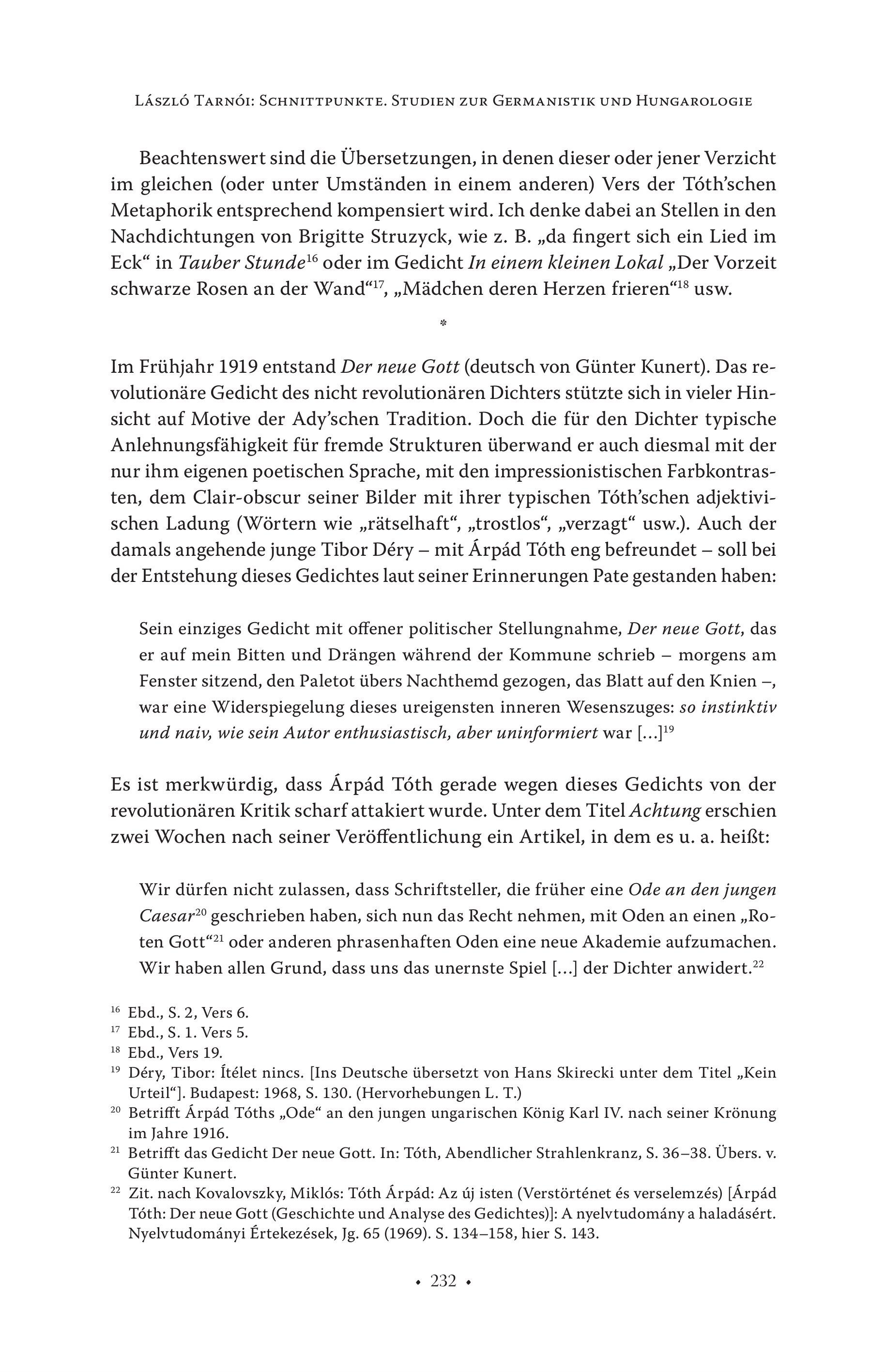LÁSZLÓ TARNÓI: SCHNITTPUNKTE. STUDIEN ZUR GERMANISTIK UND HUNGAROLOGIE Beachtenswert sind die Übersetzungen, in denen dieser oder jener Verzicht im gleichen (oder unter Umständen in einem anderen) Vers der Tóthschen Metaphorik entsprechend kompensiert wird. Ich denke dabei an Stellen in den Nachdichtungen von Brigitte Struzyck, wie z. B. „da fingert sich ein Lied im Eck“ in Tauber Stunde" oder im Gedicht In einem kleinen Lokal „Der Vorzeit schwarze Rosen an der Wand“, „Mädchen deren Herzen frieren“'° usw. * Im Frühjahr 1919 entstand Der neue Gott (deutsch von Günter Kunert). Das revolutionäre Gedicht des nicht revolutionären Dichters stützte sich in vieler Hinsicht auf Motive der Ady’schen Tradition. Doch die für den Dichter typische Anlehnungsfähigkeit für fremde Strukturen überwand er auch diesmal mit der nur ihm eigenen poetischen Sprache, mit den impressionistischen Farbkontrasten, dem Clair-obscur seiner Bilder mit ihrer typischen Töth’schen adjektivischen Ladung (Wörtern wie „rätselhaft“, „trostlos“, ,verzagt“ usw.). Auch der damals angehende junge Tibor Déry — mit Arpad Toth eng befreundet - soll bei der Entstehung dieses Gedichtes laut seiner Erinnerungen Pate gestanden haben: Sein einziges Gedicht mit offener politischer Stellungnahme, Der neue Gott, das er auf mein Bitten und Drängen während der Kommune schrieb — morgens am Fenster sitzend, den Paletot übers Nachthemd gezogen, das Blatt auf den Knien -, war eine Widerspiegelung dieses ureigensten inneren Wesenszuges: so instinktiv und naiv, wie sein Autor enthusiastisch, aber uninformiert war [...]” Es ist merkwürdig, dass Ärpäd Töth gerade wegen dieses Gedichts von der revolutionären Kritik scharf attakiert wurde. Unter dem Titel Achtung erschien zwei Wochen nach seiner Veröffentlichung ein Artikel, in dem es u. a. heißt: Wir dürfen nicht zulassen, dass Schriftsteller, die früher eine Ode an den jungen Caesar” geschrieben haben, sich nun das Recht nehmen, mit Oden an einen „Roten Gott“?! oder anderen phrasenhaften Oden eine neue Akademie aufzumachen. Wir haben allen Grund, dass uns das unernste Spiel [...] der Dichter anwidert.”” 16 Ebd., S. 2, Vers 6. 7 Ebd., S.1. Vers 5. 18 Ebd., Vers 19. 1° Dery, Tibor: Ítélet nincs. [Ins Deutsche iibersetzt von Hans Skirecki unter dem Titel ,,Kein Urteil“]. Budapest: 1968, S. 130. (Hervorhebungen L. T.) Betrifft Ärpäd Töths „Ode“ an den jungen ungarischen König Karl IV. nach seiner Krönung im Jahre 1916. Betrifft das Gedicht Der neue Gott. In: Töth, Abendlicher Strahlenkranz, S. 36-38. Übers. v. Günter Kunert. Zit. nach Kovalovszky, Miklós: Tóth Árpád: Az új isten (Verstörténet és verselemzés) [Árpád Tóth: Der neue Gott (Geschichte und Analyse des Gedichtes)]: A nyelvtudomány a haladásért. Nyelvtudományi Értekezések, Jg. 65 (1969). S. 134-158, hier S. 143. S 2 Ss 2 8 2 DS . 232°