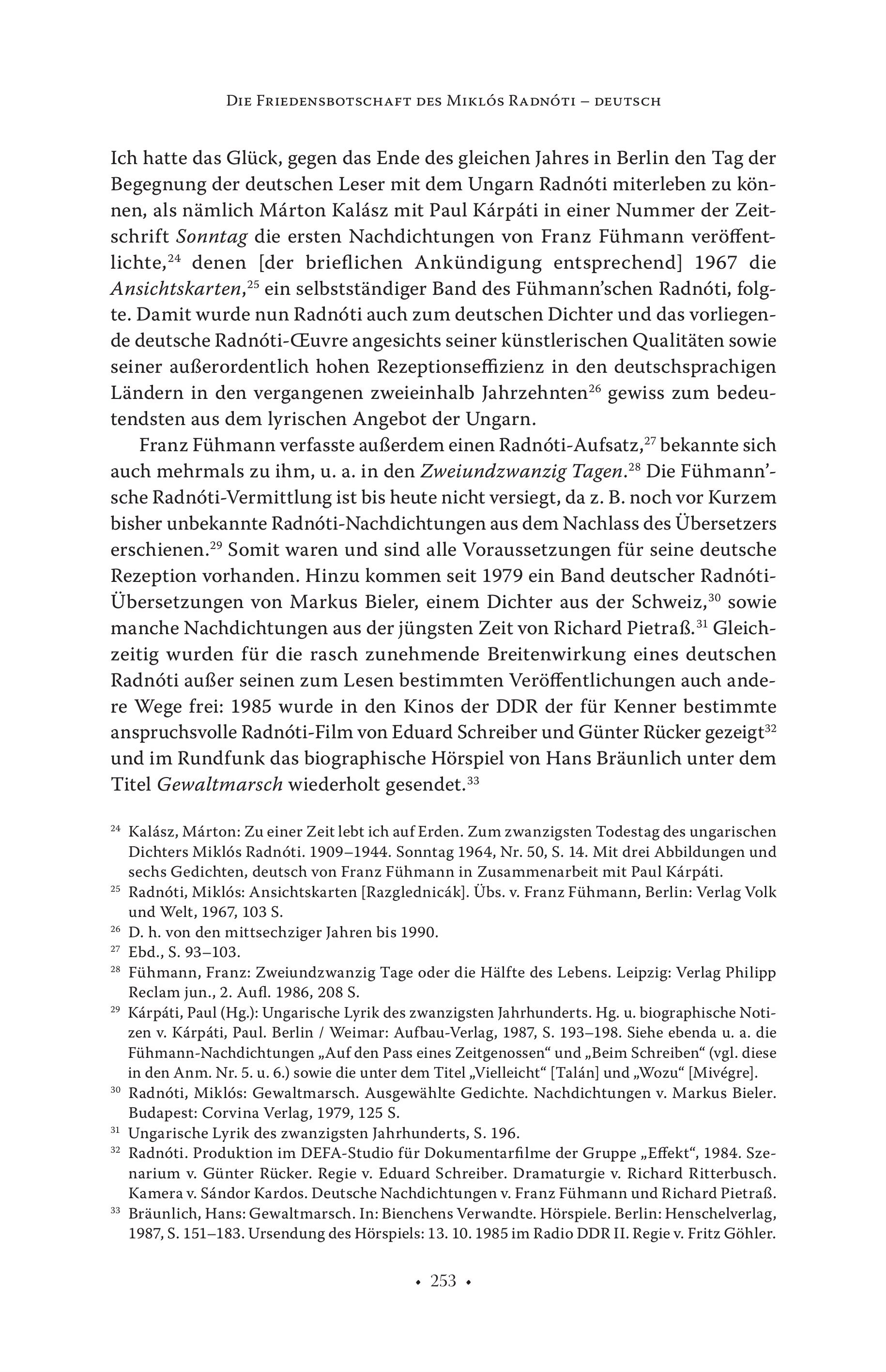 DIE FRIEDENSBOTSCHAET DES MIKLÓS RADNÓTI — DEUTSCH Ich hatte das Glück, gegen das Ende des gleichen Jahres in Berlin den Tag der Begegnung der deutschen Leser mit dem Ungarn Radnóti miterleben zu können, als námlich Márton Kalász mit Paul Kárpáti in einer Nummer der Zeitschrift Sonntag die ersten Nachdichtungen von Franz Fühmann veröffentlichte,”* denen [der brieflichen Ankündigung entsprechend] 1967 die Ansichtskarten,” ein selbstständiger Band des Fühmann’schen Radnböti, folgte. Damit wurde nun Radnöti auch zum deutschen Dichter und das vorliegende deutsche Radnöti-CEuvre angesichts seiner künstlerischen Qualitäten sowie seiner außerordentlich hohen Rezeptionseffizienz in den deutschsprachigen Ländern in den vergangenen zweieinhalb Jahrzehnten” gewiss zum bedeutendsten aus dem lyrischen Angebot der Ungarn. Franz Fühmann verfasste außerdem einen Radnöti-Aufsatz,”” bekannte sich auch mehrmals zu ihm, u. a. in den Zweiundzwanzig Tagen.” Die Fühmann’sche Radnöti-Vermittlung ist bis heute nicht versiegt, da z. B. noch vor Kurzem bisher unbekannte Radnöti-Nachdichtungen aus dem Nachlass des Übersetzers erschienen.” Somit waren und sind alle Voraussetzungen für seine deutsche Rezeption vorhanden. Hinzu kommen seit 1979 ein Band deutscher RadnötiÜbersetzungen von Markus Bieler, einem Dichter aus der Schweiz,?° sowie manche Nachdichtungen aus der jüngsten Zeit von Richard Pietraß.°' Gleichzeitig wurden für die rasch zunehmende Breitenwirkung eines deutschen Radnöti außer seinen zum Lesen bestimmten Veröffentlichungen auch andere Wege frei: 1985 wurde in den Kinos der DDR der für Kenner bestimmte anspruchsvolle Radnöti-Film von Eduard Schreiber und Günter Rücker gezeigt” und im Rundfunk das biographische Hörspiel von Hans Bräunlich unter dem Titel Gewaltmarsch wiederholt gesendet.°® 24 Kaldsz, Märton: Zu einer Zeit lebt ich auf Erden. Zum zwanzigsten Todestag des ungarischen Dichters Miklös Radnöti. 1909-1944. Sonntag 1964, Nr. 50, S. 14. Mit drei Abbildungen und sechs Gedichten, deutsch von Franz Fühmann in Zusammenarbeit mit Paul Kärpäti. Radnöti, Miklös: Ansichtskarten [Razglednicäk]. Übs. v. Franz Fühmann, Berlin: Verlag Volk und Welt, 1967, 103 S. D. h. von den mittsechziger Jahren bis 1990. Ebd., S. 93-103. Fühmann, Franz: Zweiundzwanzig Tage oder die Hälfte des Lebens. Leipzig: Verlag Philipp Reclam jun., 2. Aufl. 1986, 208 S. Kärpäti, Paul (Hg.): Ungarische Lyrik des zwanzigsten Jahrhunderts. Hg. u. biographische Notizen v. Kärpäti, Paul. Berlin / Weimar: Aufbau-Verlag, 1987, S. 193-198. Siehe ebenda u. a. die Fühmann-Nachdichtungen „Auf den Pass eines Zeitgenossen“ und „Beim Schreiben“ (vgl. diese in den Anm. Nr. 5. u. 6.) sowie die unter dem Titel „Vielleicht“ [Talän] und „Wozu“ [Mivegre]. Radnöti, Miklös: Gewaltmarsch. Ausgewählte Gedichte. Nachdichtungen v. Markus Bieler. Budapest: Corvina Verlag, 1979, 125 S. Ungarische Lyrik des zwanzigsten Jahrhunderts, S. 196. Radnöti. Produktion im DEFA-Studio für Dokumentarfilme der Gruppe „Effekt“, 1984. Szenarium v. Günter Rücker. Regie v. Eduard Schreiber. Dramaturgie v. Richard Ritterbusch. Kamera v. Sándor Kardos. Deutsche Nachdichtungen v. Franz Fühmann und Richard Pietraß. Bräunlich, Hans: Gewaltmarsch. In: Bienchens Verwandte. Hörspiele. Berlin: Henschelverlag, 1987, S. 151-183. Ursendung des Hörspiels: 13. 10.1985 im Radio DDR II. Regie v. Fritz Göhler. 2 a 26 2 N 2 ® 2 © 3 Ss 3 3 Ss 3 0
