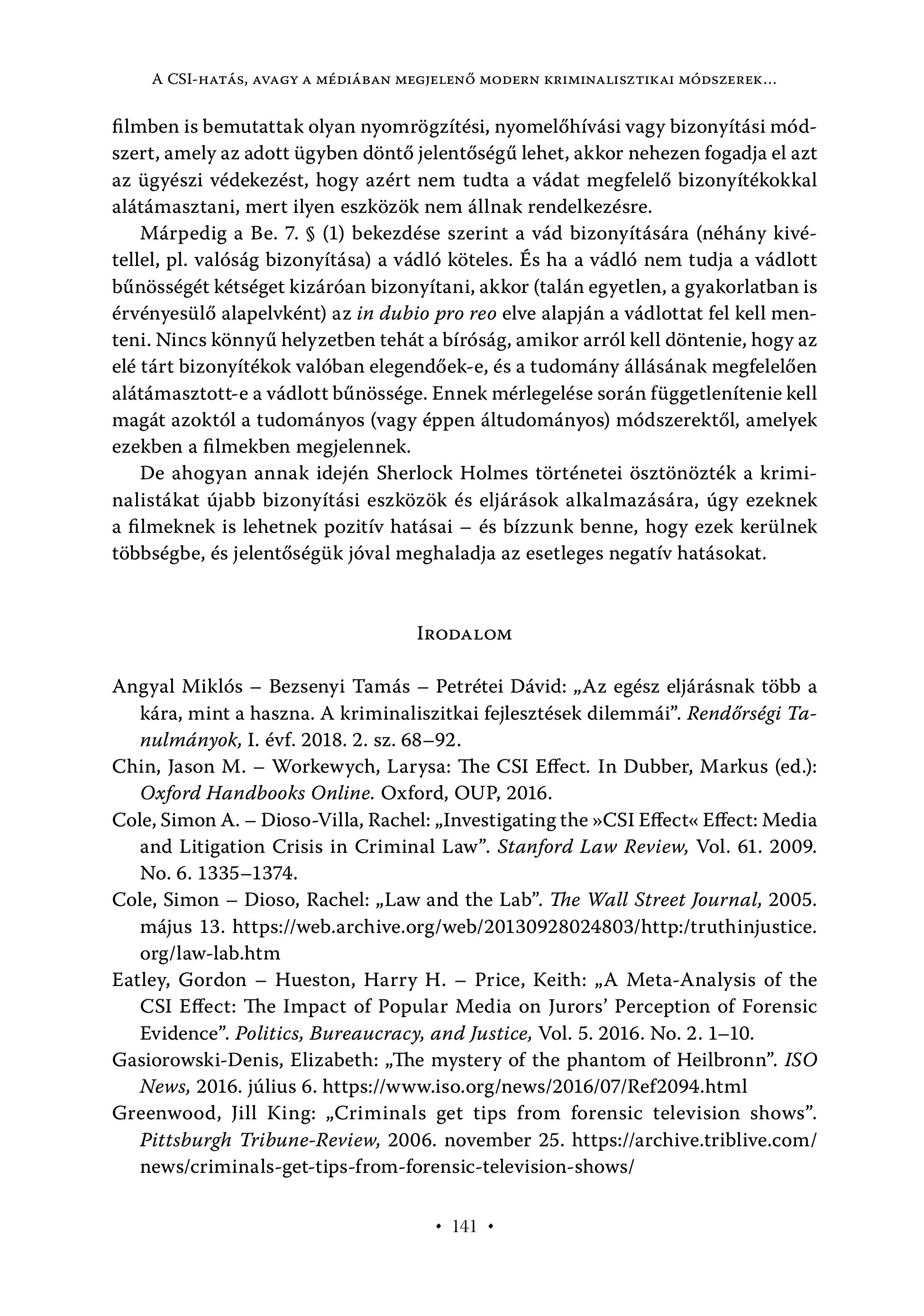 A CSI-HATÁS, AVAGY A MÉDIÁBAN MEGJELENŐ MODERN KRIMINALISZTIKAI MÓDSZEREK... filmben is bemutattak olyan nyomrögzítési, nyomelőhívási vagy bizonyítási módszert, amely az adott ügyben döntő jelentőségű lehet, akkor nehezen fogadja el azt az ügyészi védekezést, hogy azért nem tudta a vádat megfelelő bizonyítékokkal alátámasztani, mert ilyen eszközök nem állnak rendelkezésre. Márpedig a Be. 7. § (1) bekezdése szerint a vád bizonyítására (néhány kivétellel, pl. valóság bizonyítása) a vádló köteles. És ha a vádló nem tudja a vádlott bűnösségét kétséget kizáróan bizonyítani, akkor (talán egyetlen, a gyakorlatban is érvényesülő alapelvként) az in dubio pro reo elve alapján a vádlottat fel kell menteni. Nincs könnyű helyzetben tehát a bíróság, amikor arról kell döntenie, hogy az elé tárt bizonyítékok valóban elegendőek-e, és a tudomány állásának megfelelően alátámasztott-e a vádlott bűnössége. Ennek mérlegelése során függetlenítenie kell magát azoktól a tudományos (vagy éppen áltudományos) módszerektől, amelyek ezekben a filmekben megjelennek. De ahogyan annak idején Sherlock Holmes történetei ösztönözték a kriminalistákat újabb bizonyítási eszközök és eljárások alkalmazására, úgy ezeknek a filmeknek is lehetnek pozitív hatásai — és bízzunk benne, hogy ezek kerülnek többségbe, és jelentőségük jóval meghaladja az esetleges negatív hatásokat. IRODALOM Angyal Miklós — Bezsenyi Tamas — Petrétei Dávid: , Az egész eljárásnak több a kára, mint a haszna. A kriminaliszitkai fejlesztések dilemmái". Rendőrségi Tanulmányok, I. évf. 2018. 2. sz. 68—92. Chin, Jason M. — Workewych, Larysa: The CSI Effect. In Dubber, Markus (ed.): Oxford Handbooks Online. Oxford, OUP, 2016. Cole, Simon A. — Dioso-Villa, Rachel: ,, Investigating the »CSI Effect« Effect: Media and Litigation Crisis in Criminal Law”. Stanford Law Review, Vol. 61. 2009. No. 6. 1335-1374. Cole, Simon — Dioso, Rachel: „Law and the Lab”. The Wall Street Journal, 2005. mäjus 13. https://web.archive.org/web/20130928024803/http:/truthinjustice. org/law-lab.htm Eatley, Gordon — Hueston, Harry H. — Price, Keith: ,A Meta-Analysis of the CSI Effect: The Impact of Popular Media on Jurors’ Perception of Forensic Evidence”. Politics, Bureaucracy, and Justice, Vol. 5. 2016. No. 2. 1-10. Gasiorowski-Denis, Elizabeth: „Ihe mystery of the phantom of Heilbronn”. ISO News, 2016. jülius 6. https://www.iso.org/news/2016/07/Ref2094.html Greenwood, Jill King: „Criminals get tips from forensic television shows”. Pittsburgh Tribune-Review, 2006. november 25. https://archive.triblive.com/ news/criminals-get-tips-from-forensic-television-shows/ + 141 +