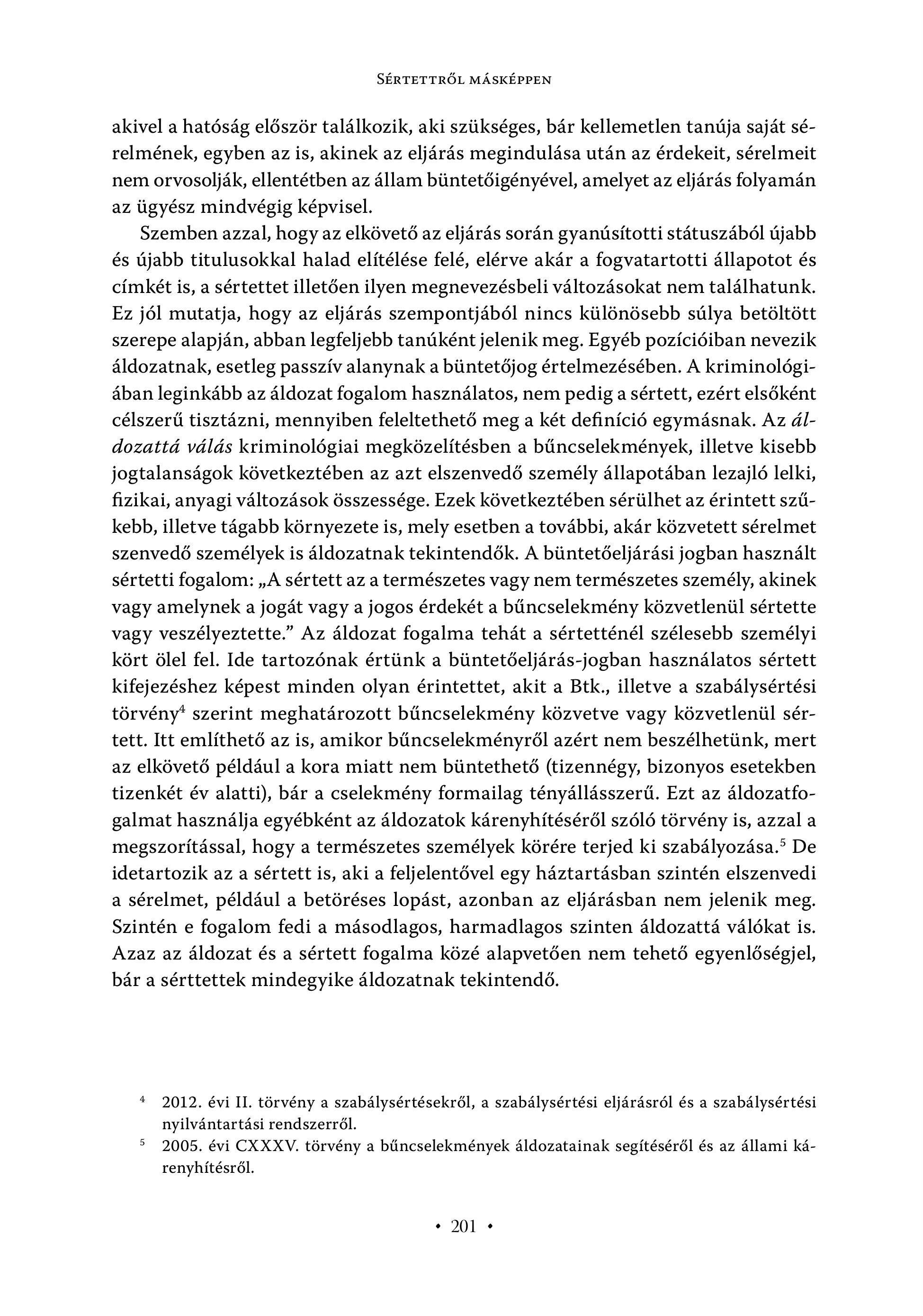 SÉRTETTRŐL MÁSKÉPPEN akivel a hatóság először találkozik, aki szükséges, bár kellemetlen tanúja saját sérelmének, egyben az is, akinek az eljárás megindulása után az érdekeit, sérelmeit nem orvosolják, ellentétben az állam büntetőigényével, amelyet az eljárás folyamán az ügyész mindvégig képvisel. Szemben azzal, hogy az elkövető az eljárás során gyanúsítotti státuszából újabb és újabb titulusokkal halad elítélése felé, elérve akár a fogvatartotti állapotot és címkét is, a sértettet illetően ilyen megnevezésbeli változásokat nem találhatunk. Ez jól mutatja, hogy az eljárás szempontjából nincs különösebb súlya betöltött szerepe alapján, abban legfeljebb tanúként jelenik meg. Egyéb pozícióiban nevezik áldozatnak, esetleg passzív alanynak a büntetőjog értelmezésében. A kriminológiában leginkább az áldozat fogalom használatos, nem pedig a sértett, ezért elsőként célszerű tisztázni, mennyiben feleltethető meg a két definíció egymásnak. Az áldozattá válás kriminológiai megközelítésben a bűncselekmények, illetve kisebb jogtalanságok következtében az azt elszenvedő személy állapotában lezajló lelki, fizikai, anyagi változások összessége. Ezek következtében sérülhet az érintett szűkebb, illetve tágabb környezete is, mely esetben a további, akár közvetett sérelmet szenvedő személyek is áldozatnak tekintendők. A büntetőeljárási jogban használt sértetti fogalom: , A sértett az a természetes vagy nem természetes személy, akinek vagy amelynek a jogát vagy a jogos érdekét a bűncselekmény közvetlenül sértette vagy veszélyeztette." Az áldozat fogalma tehát a sértetténél szélesebb személyi kört ölel fel. Ide tartozónak értünk a büntetőeljárás-jogban használatos sértett kifejezéshez képest minden olyan érintettet, akit a Btk., illetve a szabálysértési törvény" szerint meghatározott bűncselekmény közvetve vagy közvetlenül sértett. Itt említhető az is, amikor bűncselekményről azért nem beszélhetünk, mert az elkövető például a kora miatt nem büntethető (tizennégy, bizonyos esetekben tizenkét év alatti), bár a cselekmény formailag tényállásszerű. Ezt az áldozatfogalmat használja egyébként az áldozatok kárenyhítéséről szóló törvény is, azzal a megszorítással, hogy a természetes személyek körére terjed ki szabályozása." De idetartozik az a sértett is, aki a feljelentővel egy háztartásban szintén elszenvedi a sérelmet, például a betöréses lopást, azonban az eljárásban nem jelenik meg. Szintén e fogalom fedi a másodlagos, harmadlagos szinten áldozattá válókat is. Azaz az áldozat és a sértett fogalma közé alapvetően nem tehető egyenlőségjel, bár a sérttettek mindegyike áldozatnak tekintendő. * 2012. évi II. törvény a szabálysértésekről, a szabálysértési eljárásról és a szabálysértési nyilvántartási rendszerről. 2005. évi CXXXV. törvény a bűncselekmények áldozatainak segítéséről és az állami kárenyhítésről. + 201 +