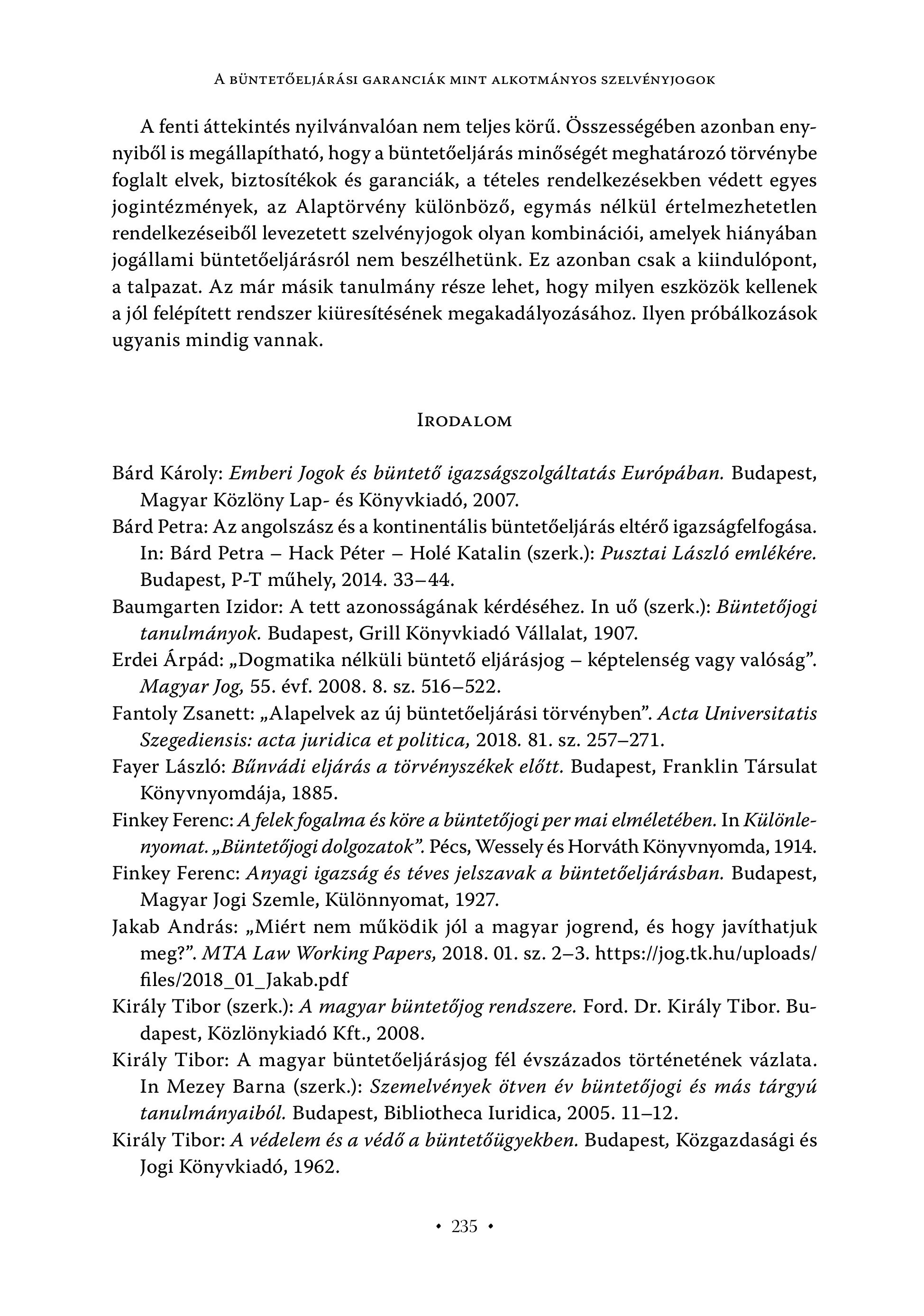 A BÜNTETŐELJÁRÁSI GARANCIÁK MINT ALKOTMÁNYOS SZELVÉNYJOGOK A fenti áttekintés nyilvánvalóan nem teljes körű. Összességében azonban enynyiből is megállapítható, hogy a büntetőeljárás minőségét meghatározó törvénybe foglalt elvek, biztosítékok és garanciák, a tételes rendelkezésekben védett egyes jogintézmények, az Alaptörvény különböző, egymás nélkül értelmezhetetlen rendelkezéseiből levezetett szelvényjogok olyan kombinációi, amelyek hiányában jogállami büntetőeljárásról nem beszélhetünk. Ez azonban csak a kiindulópont, a talpazat. Az mar másik tanulmány része lehet, hogy milyen eszközök kellenek a jól felépített rendszer kiüresítésének megakadályozásához. Ilyen próbálkozások ugyanis mindig vannak. IRODALOM Bárd Károly: Emberi Jogok és büntető igazságszolgáltatás Európában. Budapest, Magyar Közlöny Lap- és Könyvkiadó, 2007. Bárd Petra: Az angolszász és a kontinentális büntetőeljárás eltérő igazságfelfogása. In: Bárd Petra — Hack Péter — Holé Katalin (szerk.): Pusztai László emlékére. Budapest, P-T műhely, 2014. 33—44. Baumgarten Izidor: A tett azonosságának kérdéséhez. In uő (szerk.): Büntetőjogi tanulmányok. Budapest, Grill Könyvkiadó Vállalat, 1907. Erdei Árpád: , Dogmatika nélküli büntető eljárásjog — képtelenség vagy valóság". Magyar Jog, 55. évf. 2008. 8. sz. 516—522. Fantoly Zsanett: , Alapelvek az új büntetőeljárási törvényben". Acta Universitatis Szegediensis: acta juridica et politica, 2018. 81. sz. 257-271. Fayer Läszlö: Bünvadi eljaras a törvenyszekek elött. Budapest, Franklin Tärsulat Könyvnyomdäja, 1885. Finkey Ferenc: A felek fogalma es köre a büntetöjogi per mai elméletében. In Külônlenyomat. „Büntetöjogi dolgozatok". Pécs, Wessely és Horváth Könyvnyomda, 1914. Finkey Ferenc: Anyagi igazság és téves jelszavak a büntetőeljárásban. Budapest, Magyar Jogi Szemle, Különnyomat, 1927. Jakab András: , Miért nem működik jól a magyar jogrend, és hogy javíthatjuk meg?". MTA Law Working Papers, 2018. 01. sz. 2—3. https://jog.tk.hu/uploads/ files/2018 01 Jakab.pdf Király Tibor (szerk.): A magyar büntetőjog rendszere. Ford. Dr. Király Tibor. Budapest, Közlönykiadó Kft., 2008. Király Tibor: A magyar büntetőeljárásjog fél évszázados történetének vázlata. In Mezey Barna (szerk.): Szemelvények ötven év büntetőjogi és más tárgyú tanulmanyaiböl. Budapest, Bibliotheca Iuridica, 2005. 11-12. Király Tibor: A védelem és a védő a büntetőügyekben. Budapest, Közgazdasági és Jogi Könyvkiadó, 1962. * 235 +