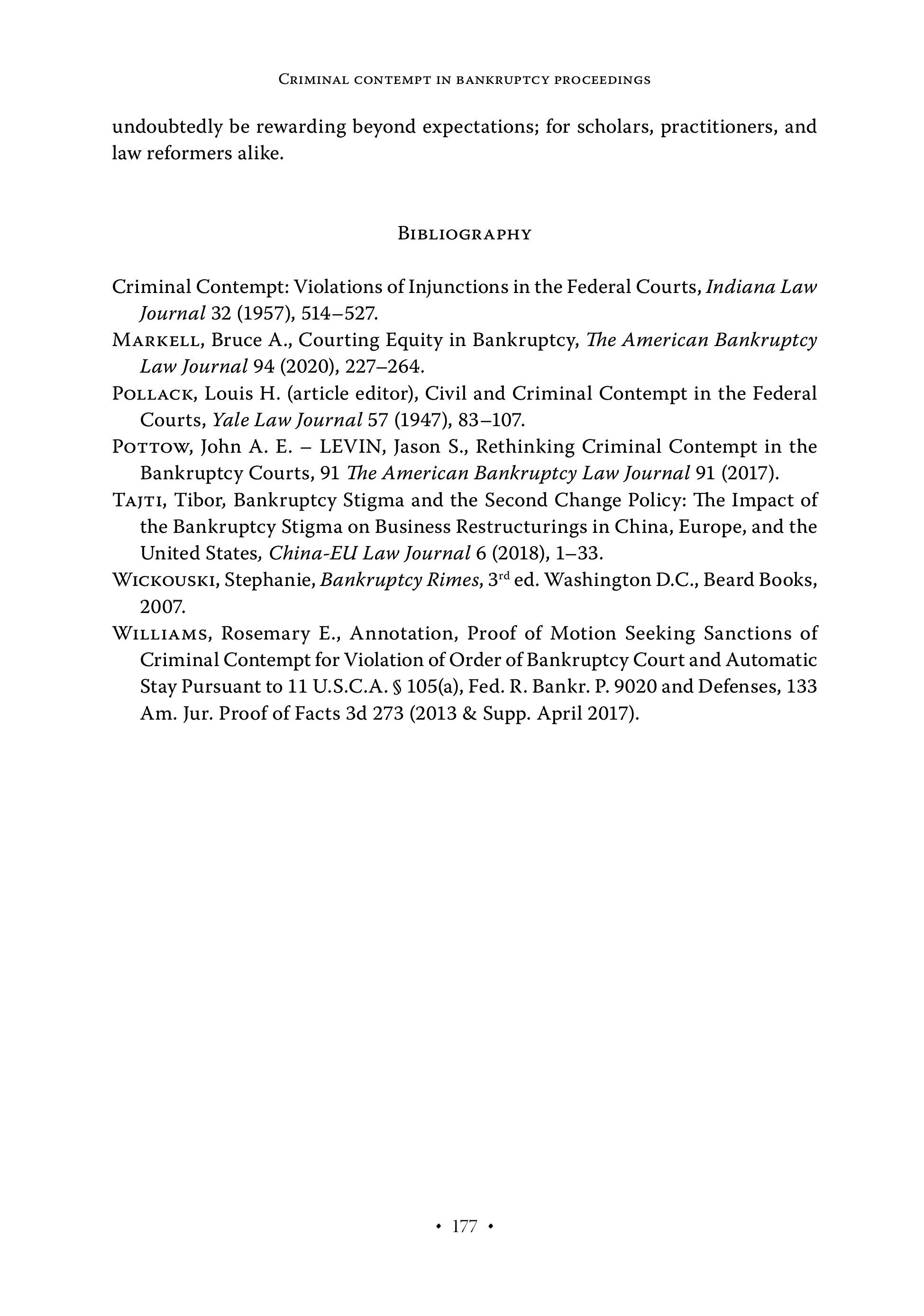 CRIMINAL CONTEMPT IN BANKRUPTCY PROCEEDINGS undoubtedly be rewarding beyond expectations; for scholars, practitioners, and law reformers alike. BIBLIOGRAPHY Criminal Contempt: Violations of Injunctions in the Federal Courts, Indiana Law Journal 32 (1957), 514—527. MARKELL, Bruce A., Courting Equity in Bankruptcy, The American Bankruptcy Law Journal 94 (2020), 227-264. POLLACK, Louis H. (article editor), Civil and Criminal Contempt in the Federal Courts, Yale Law Journal 57 (1947), 83-107. Pottow, John A. E. — LEVIN, Jason S., Rethinking Criminal Contempt in the Bankruptcy Courts, 91 The American Bankruptcy Law Journal 91 (2017). TAJT1, Tibor, Bankruptcy Stigma and the Second Change Policy: The Impact of the Bankruptcy Stigma on Business Restructurings in China, Europe, and the United States, China-EU Law Journal 6 (2018), 1-33. WICKOUSKI, Stephanie, Bankruptcy Rimes, 3" ed. Washington D.C., Beard Books, 2007. WILLIAMS, Rosemary E., Annotation, Proof of Motion Seeking Sanctions of Criminal Contempt for Violation of Order of Bankruptcy Court and Automatic Stay Pursuant to 11 U.S.C.A. § 105(a), Fed. R. Bankr. P. 9020 and Defenses, 133 Am. Jur. Proof of Facts 3d 273 (2013 & Supp. April 2017). + 177 +
