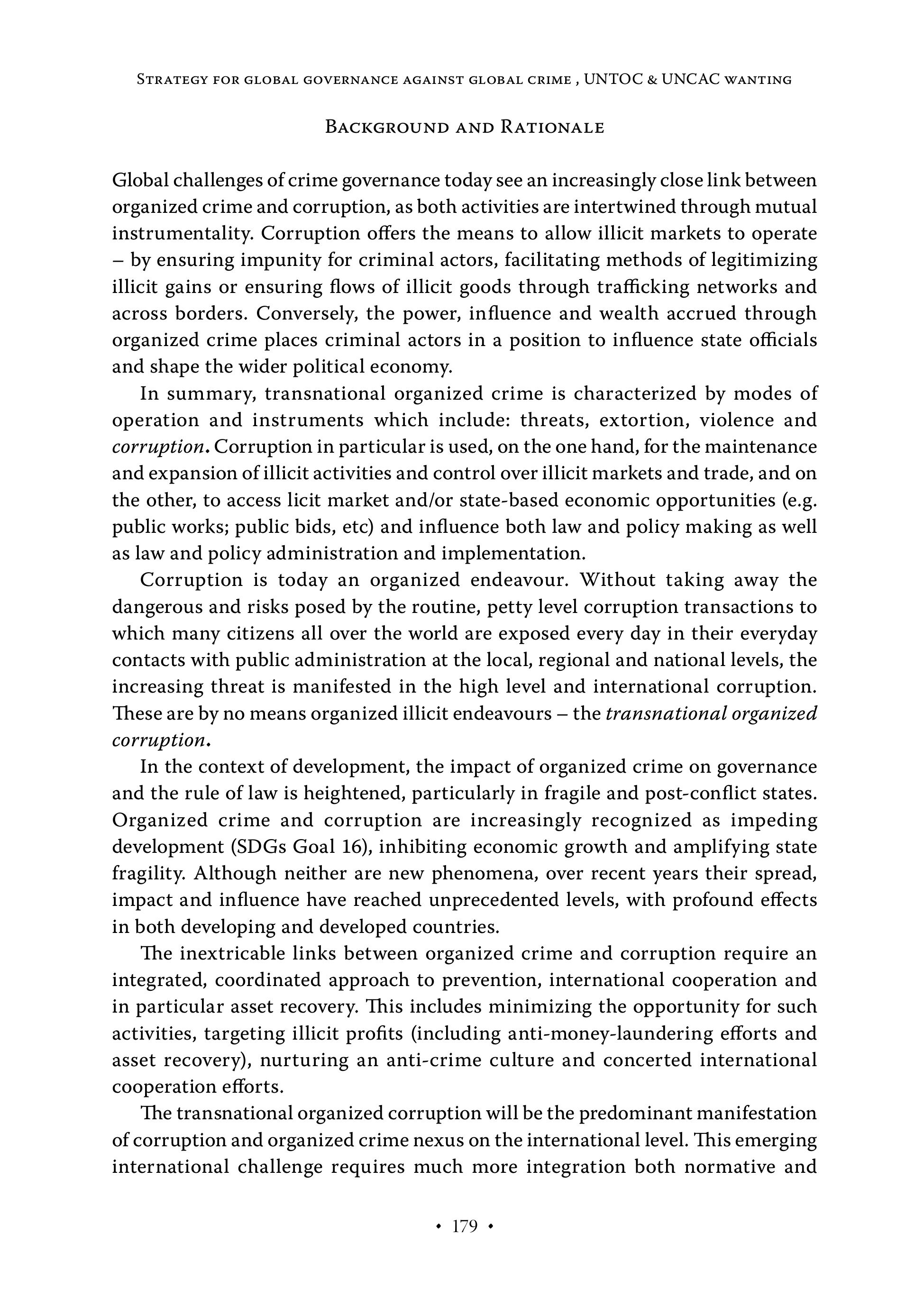 STRATEGY FOR GLOBAL GOVERNANCE AGAINST GLOBAL CRIME , UNTOC & UNCAC WANTING BACKGROUND AND RATIONALE Global challenges of crime governance today see an increasingly close link between organized crime and corruption, as both activities are intertwined through mutual instrumentality. Corruption offers the means to allow illicit markets to operate — by ensuring impunity for criminal actors, facilitating methods of legitimizing illicit gains or ensuring flows of illicit goods through trafficking networks and across borders. Conversely, the power, influence and wealth accrued through organized crime places criminal actors in a position to influence state officials and shape the wider political economy. In summary, transnational organized crime is characterized by modes of operation and instruments which include: threats, extortion, violence and corruption. Corruption in particular is used, on the one hand, for the maintenance and expansion of illicit activities and control over illicit markets and trade, and on the other, to access licit market and/or state-based economic opportunities (e.g. public works; public bids, etc) and influence both law and policy making as well as law and policy administration and implementation. Corruption is today an organized endeavour. Without taking away the dangerous and risks posed by the routine, petty level corruption transactions to which many citizens all over the world are exposed every day in their everyday contacts with public administration at the local, regional and national levels, the increasing threat is manifested in the high level and international corruption. These are by no means organized illicit endeavours — the transnational organized corruption. In the context of development, the impact of organized crime on governance and the rule of law is heightened, particularly in fragile and post-conflict states. Organized crime and corruption are increasingly recognized as impeding development (SDGs Goal 16), inhibiting economic growth and amplifying state fragility. Although neither are new phenomena, over recent years their spread, impact and influence have reached unprecedented levels, with profound effects in both developing and developed countries. The inextricable links between organized crime and corruption require an integrated, coordinated approach to prevention, international cooperation and in particular asset recovery. This includes minimizing the opportunity for such activities, targeting illicit profits (including anti-money-laundering efforts and asset recovery), nurturing an anti-crime culture and concerted international cooperation efforts. The transnational organized corruption will be the predominant manifestation of corruption and organized crime nexus on the international level. This emerging international challenge requires much more integration both normative and * 179 «