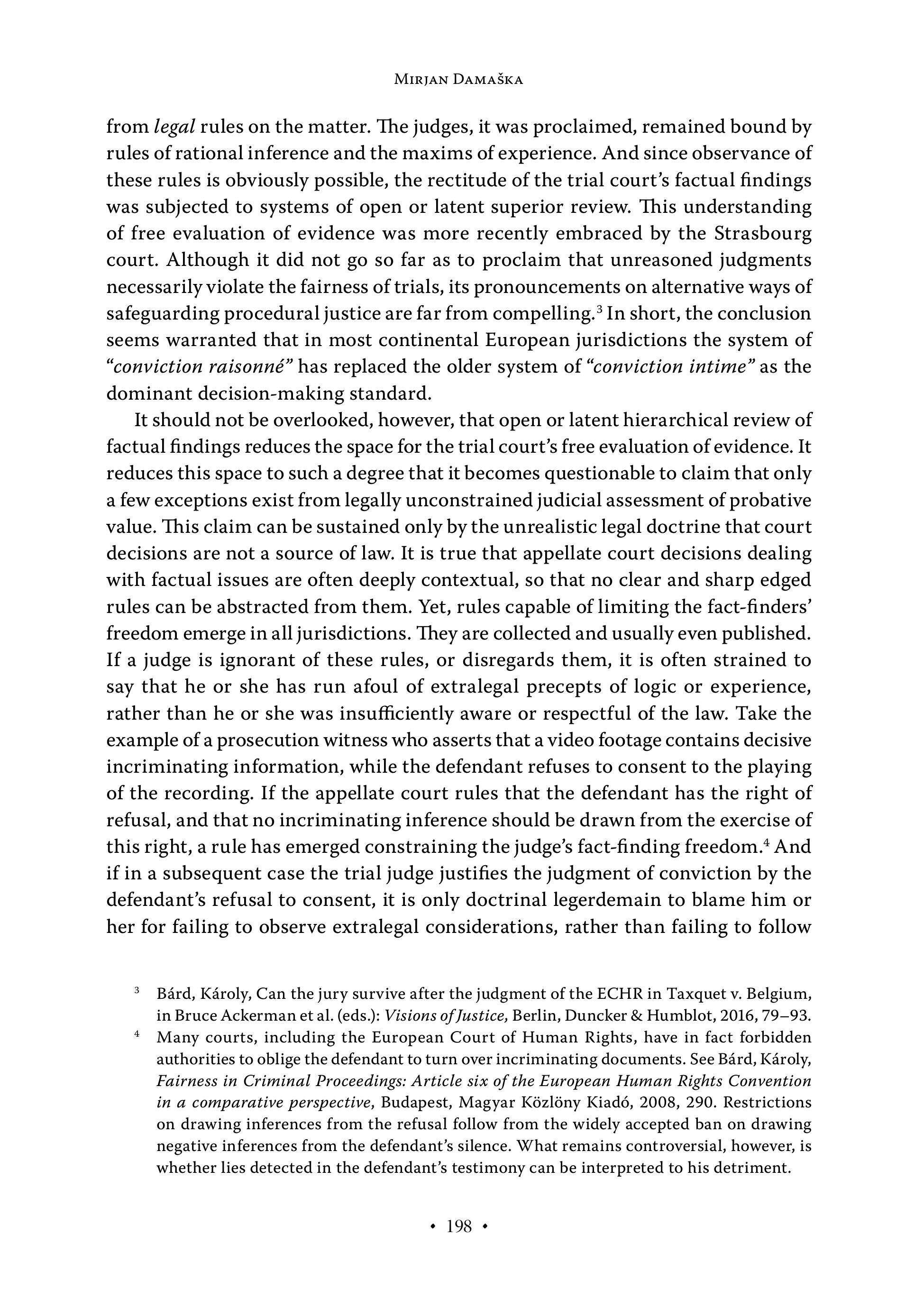 MIRJAN DAMASKA from legal rules on the matter. The judges, it was proclaimed, remained bound by rules of rational inference and the maxims of experience. And since observance of these rules is obviously possible, the rectitude of the trial court’s factual findings was subjected to systems of open or latent superior review. This understanding of free evaluation of evidence was more recently embraced by the Strasbourg court. Although it did not go so far as to proclaim that unreasoned judgments necessarily violate the fairness of trials, its pronouncements on alternative ways of safeguarding procedural justice are far from compelling.’ In short, the conclusion seems warranted that in most continental European jurisdictions the system of “conviction raisonné” has replaced the older system of “conviction intime” as the dominant decision-making standard. It should not be overlooked, however, that open or latent hierarchical review of factual findings reduces the space for the trial court’s free evaluation of evidence. It reduces this space to such a degree that it becomes questionable to claim that only a few exceptions exist from legally unconstrained judicial assessment of probative value. This claim can be sustained only by the unrealistic legal doctrine that court decisions are not a source of law. It is true that appellate court decisions dealing with factual issues are often deeply contextual, so that no clear and sharp edged rules can be abstracted from them. Yet, rules capable of limiting the fact-finders’ freedom emerge in all jurisdictions. They are collected and usually even published. If a judge is ignorant of these rules, or disregards them, it is often strained to say that he or she has run afoul of extralegal precepts of logic or experience, rather than he or she was insufficiently aware or respectful of the law. Take the example of a prosecution witness who asserts that a video footage contains decisive incriminating information, while the defendant refuses to consent to the playing of the recording. If the appellate court rules that the defendant has the right of refusal, and that no incriminating inference should be drawn from the exercise of this right, a rule has emerged constraining the judge’s fact-finding freedom.* And if in a subsequent case the trial judge justifies the judgment of conviction by the defendant’s refusal to consent, it is only doctrinal legerdemain to blame him or her for failing to observe extralegal considerations, rather than failing to follow Bard, Karoly, Can the jury survive after the judgment of the ECHR in Taxquet v. Belgium, in Bruce Ackerman et al. (eds.): Visions of Justice, Berlin, Duncker & Humblot, 2016, 79-93. Many courts, including the European Court of Human Rights, have in fact forbidden authorities to oblige the defendant to turn over incriminating documents. See Bard, Karoly, Fairness in Criminal Proceedings: Article six of the European Human Rights Convention in a comparative perspective, Budapest, Magyar Közlöny Kiadö, 2008, 290. Restrictions on drawing inferences from the refusal follow from the widely accepted ban on drawing negative inferences from the defendant’s silence. What remains controversial, however, is whether lies detected in the defendant’s testimony can be interpreted to his detriment. + 198 «