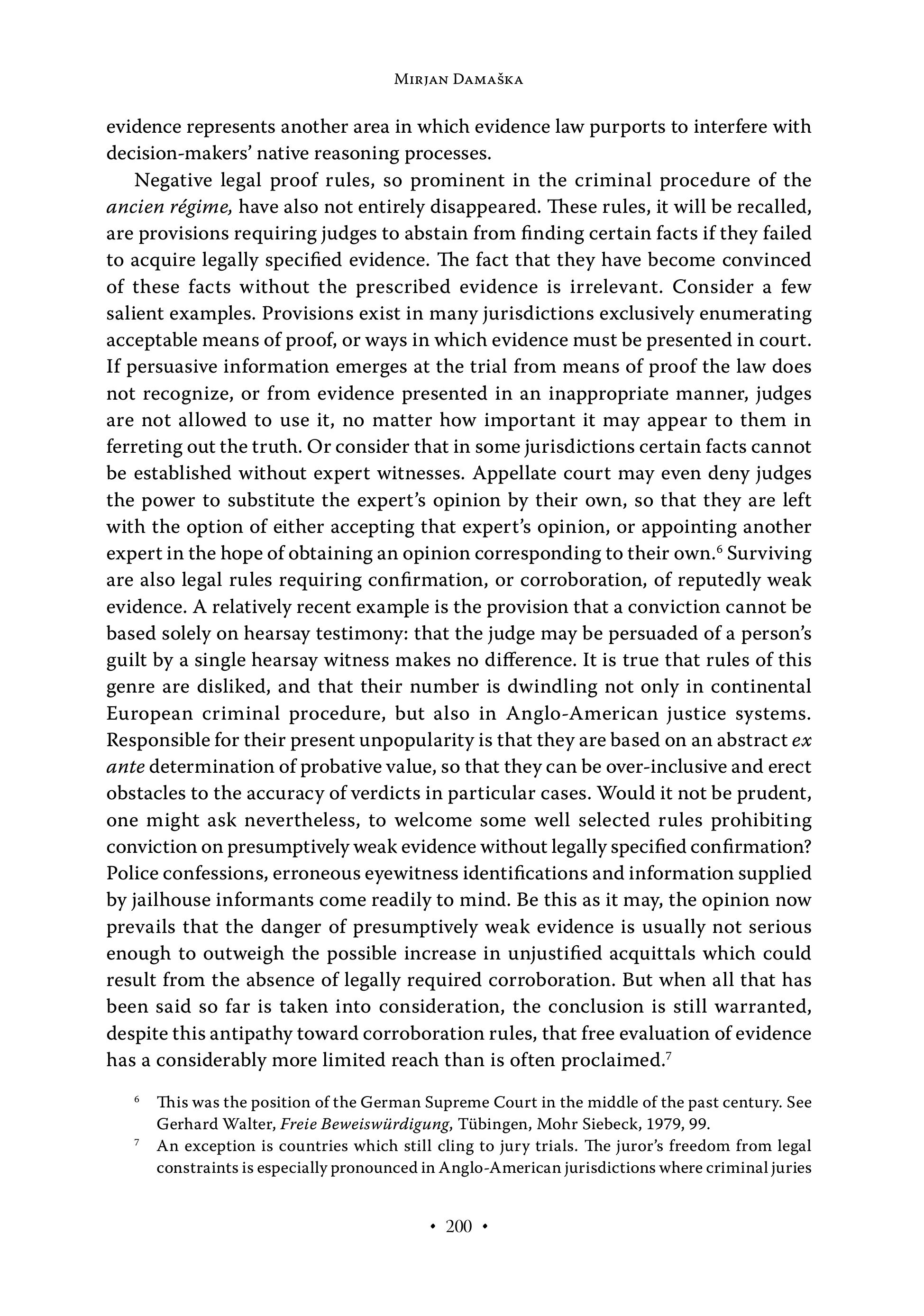 MIRJAN DAMASKA evidence represents another area in which evidence law purports to interfere with decision-makers’ native reasoning processes. Negative legal proof rules, so prominent in the criminal procedure of the ancien régime, have also not entirely disappeared. These rules, it will be recalled, are provisions requiring judges to abstain from finding certain facts if they failed to acquire legally specified evidence. The fact that they have become convinced of these facts without the prescribed evidence is irrelevant. Consider a few salient examples. Provisions exist in many jurisdictions exclusively enumerating acceptable means of proof, or ways in which evidence must be presented in court. If persuasive information emerges at the trial from means of proof the law does not recognize, or from evidence presented in an inappropriate manner, judges are not allowed to use it, no matter how important it may appear to them in ferreting out the truth. Or consider that in some jurisdictions certain facts cannot be established without expert witnesses. Appellate court may even deny judges the power to substitute the expert’s opinion by their own, so that they are left with the option of either accepting that expert’s opinion, or appointing another expert in the hope of obtaining an opinion corresponding to their own.° Surviving are also legal rules requiring confirmation, or corroboration, of reputedly weak evidence. A relatively recent example is the provision that a conviction cannot be based solely on hearsay testimony: that the judge may be persuaded of a person’s guilt by a single hearsay witness makes no difference. It is true that rules of this genre are disliked, and that their number is dwindling not only in continental European criminal procedure, but also in Anglo-American justice systems. Responsible for their present unpopularity is that they are based on an abstract ex ante determination of probative value, so that they can be over-inclusive and erect obstacles to the accuracy of verdicts in particular cases. Would it not be prudent, one might ask nevertheless, to welcome some well selected rules prohibiting conviction on presumptively weak evidence without legally specified confirmation? Police confessions, erroneous eyewitness identifications and information supplied by jailhouse informants come readily to mind. Be this as it may, the opinion now prevails that the danger of presumptively weak evidence is usually not serious enough to outweigh the possible increase in unjustified acquittals which could result from the absence of legally required corroboration. But when all that has been said so far is taken into consideration, the conclusion is still warranted, despite this antipathy toward corroboration rules, that free evaluation of evidence has a considerably more limited reach than is often proclaimed.’ 6 This was the position of the German Supreme Court in the middle of the past century. See Gerhard Walter, Freie Beweiswürdigung, Tübingen, Mohr Siebeck, 1979, 99. An exception is countries which still cling to jury trials. The juror’s freedom from legal constraints is especially pronounced in Anglo-American jurisdictions where criminal juries + 200 +