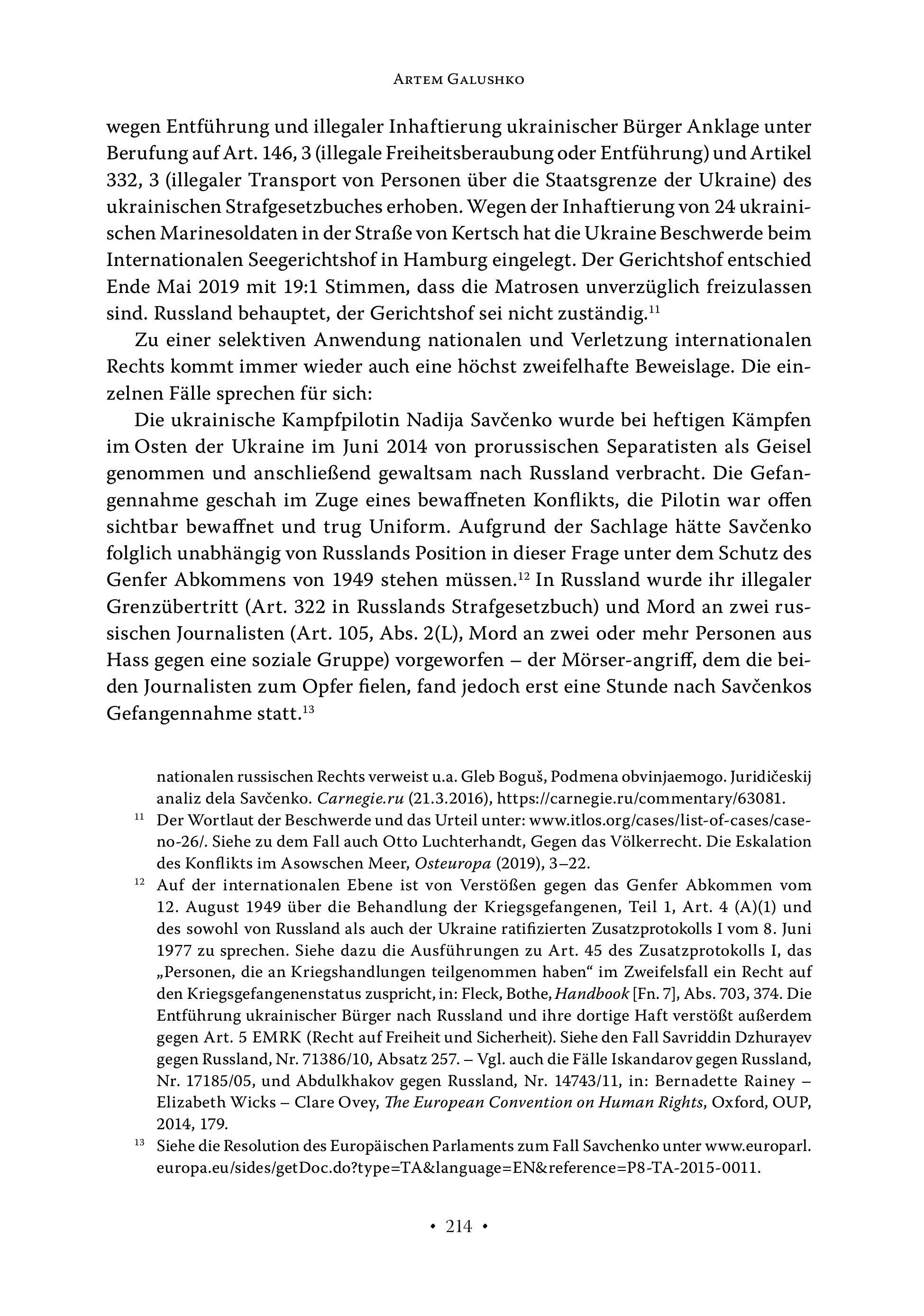 ARTEM GALUSHKO wegen Entführung und illegaler Inhaftierung ukrainischer Bürger Anklage unter Berufung auf Art. 146, 3 (illegale Freiheitsberaubung oder Entführung) und Artikel 332, 3 (illegaler Transport von Personen über die Staatsgrenze der Ukraine) des ukrainischen Strafgesetzbuches erhoben. Wegen der Inhaftierung von 24 ukrainischen Marinesoldaten in der Straße von Kertsch hat die Ukraine Beschwerde beim Internationalen Seegerichtshof in Hamburg eingelegt. Der Gerichtshof entschied Ende Mai 2019 mit 19:1 Stimmen, dass die Matrosen unverzüglich freizulassen sind. Russland behauptet, der Gerichtshof sei nicht zuständig." Zu einer selektiven Anwendung nationalen und Verletzung internationalen Rechts kommt immer wieder auch eine höchst zweifelhafte Beweislage. Die einzelnen Fälle sprechen für sich: Die ukrainische Kampfpilotin Nadija Savcenko wurde bei heftigen Kämpfen im Osten der Ukraine im Juni 2014 von prorussischen Separatisten als Geisel genommen und anschließend gewaltsam nach Russland verbracht. Die Gefangennahme geschah im Zuge eines bewaffneten Konflikts, die Pilotin war offen sichtbar bewaffnet und trug Uniform. Aufgrund der Sachlage hätte Savcenko folglich unabhängig von Russlands Position in dieser Frage unter dem Schutz des Genfer Abkommens von 1949 stehen müssen.!? In Russland wurde ihr illegaler Grenzübertritt (Art. 322 in Russlands Strafgesetzbuch) und Mord an zwei russischen Journalisten (Art. 105, Abs. 2(L), Mord an zwei oder mehr Personen aus Hass gegen eine soziale Gruppe) vorgeworfen — der Mörser-angriff, dem die beiden Journalisten zum Opfer fielen, fand jedoch erst eine Stunde nach Savcenkos Gefangennahme statt." nationalen russischen Rechts verweist u.a. Gleb Bogus, Podmena obvinjaemogo. Juridiceskij analiz dela Savcenko. Carnegie.ru (21.3.2016), https://carnegie.ru/commentary/63081. 1! Der Wortlaut der Beschwerde und das Urteil unter: www.itlos.org/cases/list-of-cases/caseno-26/. Siehe zu dem Fall auch Otto Luchterhandt, Gegen das Völkerrecht. Die Eskalation des Konflikts im Asowschen Meer, Osteuropa (2019), 3-22. 2 Auf der internationalen Ebene ist von Verstößen gegen das Genfer Abkommen vom 12. August 1949 über die Behandlung der Kriegsgefangenen, Teil 1, Art. 4 (A)(1) und des sowohl von Russland als auch der Ukraine ratifizierten Zusatzprotokolls I vom 8. Juni 1977 zu sprechen. Siehe dazu die Ausführungen zu Art. 45 des Zusatzprotokolls I, das „Personen, die an Kriegshandlungen teilgenommen haben“ im Zweifelsfall ein Recht auf den Kriegsgefangenenstatus zuspricht, in: Fleck, Bothe, Handbook [Fn. 7], Abs. 703, 374. Die Entführung ukrainischer Bürger nach Russland und ihre dortige Haft verstößt außerdem gegen Art. 5 EMRK (Recht auf Freiheit und Sicherheit). Siehe den Fall Savriddin Dzhurayev gegen Russland, Nr. 71386/10, Absatz 257. — Vgl. auch die Fälle Iskandarov gegen Russland, Nr. 17185/05, und Abdulkhakov gegen Russland, Nr. 14743/11, in: Bernadette Rainey — Elizabeth Wicks — Clare Ovey, The European Convention on Human Rights, Oxford, OUP, 2014, 179. 3 Siehe die Resolution des Europäischen Parlaments zum Fall Savchenko unter www.europarl. europa.eu/sides/getDoc.do?type=TA&language=EN&reference=P8-TA-2015-0011. + 214 +
