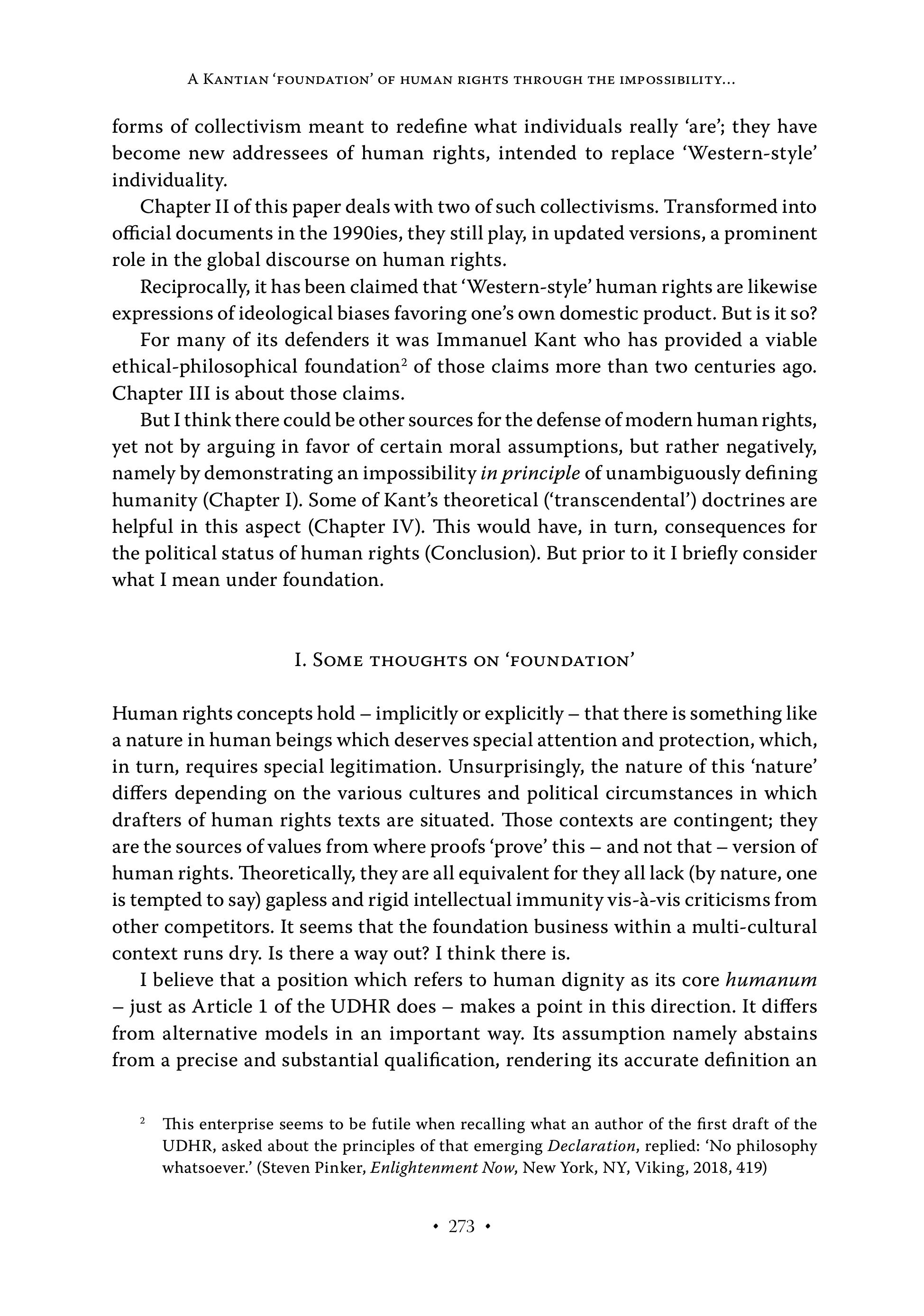 A KANTIAN ‘FOUNDATION’ OF HUMAN RIGHTS THROUGH THE IMPOSSIBILITY... forms of collectivism meant to redefine what individuals really ‘are’; they have become new addressees of human rights, intended to replace ‘Western-style’ individuality. Chapter II of this paper deals with two of such collectivisms. Transformed into official documents in the 1990ies, they still play, in updated versions, a prominent role in the global discourse on human rights. Reciprocally, it has been claimed that ‘Western-style’ human rights are likewise expressions of ideological biases favoring one’s own domestic product. But is it so? For many of its defenders it was Immanuel Kant who has provided a viable ethical-philosophical foundation? of those claims more than two centuries ago. Chapter III is about those claims. But I think there could be other sources for the defense of modern human rights, yet not by arguing in favor of certain moral assumptions, but rather negatively, namely by demonstrating an impossibility in principle of unambiguously defining humanity (Chapter I). Some of Kant’s theoretical (‘transcendental’) doctrines are helpful in this aspect (Chapter IV). This would have, in turn, consequences for the political status of human rights (Conclusion). But prior to it I briefly consider what I mean under foundation. I. SOME THOUGHTS ON ‘FOUNDATION’ Human rights concepts hold — implicitly or explicitly — that there is something like a nature in human beings which deserves special attention and protection, which, in turn, requires special legitimation. Unsurprisingly, the nature of this ‘nature’ differs depending on the various cultures and political circumstances in which drafters of human rights texts are situated. Those contexts are contingent; they are the sources of values from where proofs ‘prove’ this — and not that - version of human rights. Theoretically, they are all equivalent for they all lack (by nature, one is tempted to say) gapless and rigid intellectual immunity vis-a-vis criticisms from other competitors. It seems that the foundation business within a multi-cultural context runs dry. Is there a way out? I think there is. I believe that a position which refers to human dignity as its core humanum — just as Article 1 of the UDHR does — makes a point in this direction. It differs from alternative models in an important way. Its assumption namely abstains from a precise and substantial qualification, rendering its accurate definition an 2 This enterprise seems to be futile when recalling what an author of the first draft of the UDHR, asked about the principles of that emerging Declaration, replied: ‘No philosophy whatsoever.’ (Steven Pinker, Enlightenment Now, New York, NY, Viking, 2018, 419) + 273 +