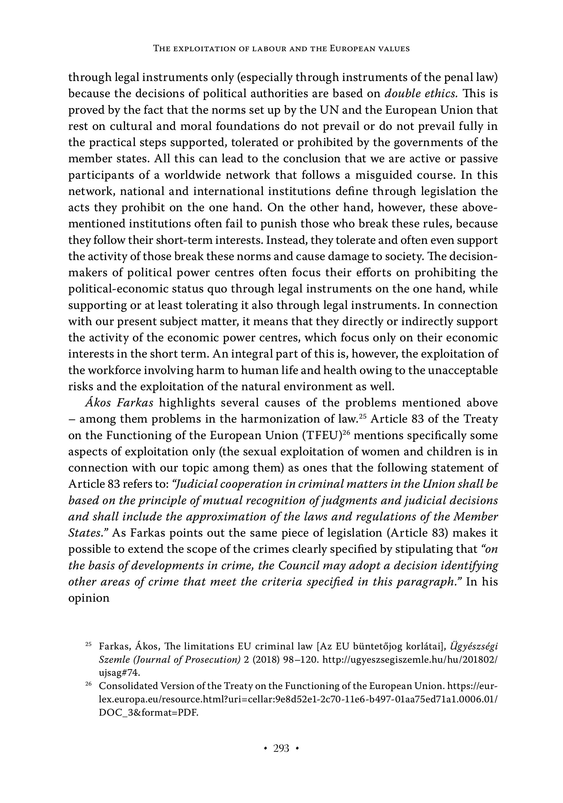 THE EXPLOITATION OF LABOUR AND THE EUROPEAN VALUES through legal instruments only (especially through instruments of the penal law) because the decisions of political authorities are based on double ethics. This is proved by the fact that the norms set up by the UN and the European Union that rest on cultural and moral foundations do not prevail or do not prevail fully in the practical steps supported, tolerated or prohibited by the governments of the member states. All this can lead to the conclusion that we are active or passive participants of a worldwide network that follows a misguided course. In this network, national and international institutions define through legislation the acts they prohibit on the one hand. On the other hand, however, these abovementioned institutions often fail to punish those who break these rules, because they follow their short-term interests. Instead, they tolerate and often even support the activity of those break these norms and cause damage to society. The decisionmakers of political power centres often focus their efforts on prohibiting the political-economic status quo through legal instruments on the one hand, while supporting or at least tolerating it also through legal instruments. In connection with our present subject matter, it means that they directly or indirectly support the activity of the economic power centres, which focus only on their economic interests in the short term. An integral part of this is, however, the exploitation of the workforce involving harm to human life and health owing to the unacceptable risks and the exploitation of the natural environment as well. Akos Farkas highlights several causes of the problems mentioned above — among them problems in the harmonization of law.” Article 83 of the Treaty on the Functioning of the European Union (TFEU)”* mentions specifically some aspects of exploitation only (the sexual exploitation of women and children is in connection with our topic among them) as ones that the following statement of Article 83 refers to: “Judicial cooperation in criminal matters in the Union shall be based on the principle of mutual recognition of judgments and judicial decisions and shall include the approximation of the laws and regulations of the Member States.” As Farkas points out the same piece of legislation (Article 83) makes it possible to extend the scope of the crimes clearly specified by stipulating that “on the basis of developments in crime, the Council may adopt a decision identifying other areas of crime that meet the criteria specified in this paragraph.” In his opinion 25 Farkas, Akos, The limitations EU criminal law [Az EU büntetőjog korlátai], Ügyészségi Szemle (Journal of Prosecution) 2 (2018) 98-120. http://ugyeszsegiszemle.hu/hu/201802/ ujsag#74. ?° Consolidated Version of the Treaty on the Functioning of the European Union. https://eurlex.europa.eu/resource.html?uri=cellar:9e8d52e1-2c70-11e6-b497-01aa75ed71a1.0006.01/ DOC_3&format=PDF. + 293 +