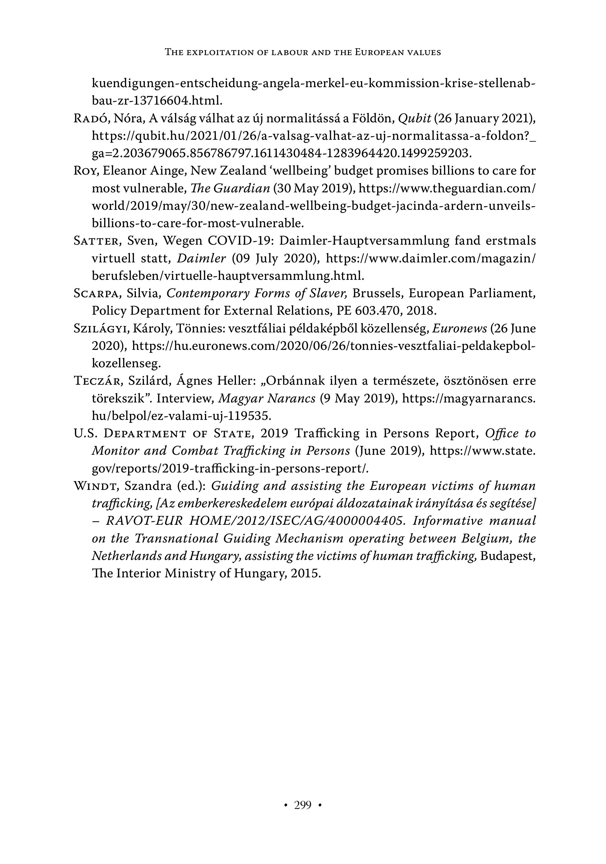 THE EXPLOITATION OF LABOUR AND THE EUROPEAN VALUES kuendigungen-entscheidung-angela-merkel-eu-kommission-krise-stellenabbau-zr-13716604.html. RADö, Nöra, A välsäg välhat az üj normalitässä a Földön, Qubit (26 January 2021), https://qubit.hu/2021/01/26/a-valsag-valhat-az-uj-normalitassa-a-foldon?_ ga=2.203679065.856786797.1611430484-1283964420.1499259203. Roy, Eleanor Ainge, New Zealand ‘wellbeing’ budget promises billions to care for most vulnerable, The Guardian (30 May 2019), https://www.theguardian.com/ world/2019/may/30/new-zealand-wellbeing-budget-jacinda-ardern-unveilsbillions-to-care-for-most-vulnerable. SATTER, Sven, Wegen COVID-19: Daimler-Hauptversammlung fand erstmals virtuell statt, Daimler (09 July 2020), https://www.daimler.com/magazin/ berufsleben/virtuelle-hauptversammlung.html. SCARPA, Silvia, Contemporary Forms of Slaver, Brussels, European Parliament, Policy Department for External Relations, PE 603.470, 2018. SZILÁGYI, Károly, Tönnies: vesztfáliai példaképből közellenség, Euronews (26 June 2020), https://hu.euronews.com/2020/06/26/tonnies-vesztfaliai-peldakepbolkozellenseg. TECzÁR, Szilárd, Ágnes Heller: , Orbánnak ilyen a természete, ösztönösen erre törekszik". Interview, Magyar Narancs (9 May 2019), https://magyarnarancs. hu/belpol/ez-valami-uj-119535. U.S. DEPARTMENT OF STATE, 2019 Trafficking in Persons Report, Office to Monitor and Combat Trafficking in Persons (June 2019), https://www.state. gov/reports/2019-trafficking-in-persons-report/. WINDT, Szandra (ed.): Guiding and assisting the European victims of human trafficking, [Az emberkereskedelem eurépai dldozatainak irdnyitasa és segitése] — RAVOT-EUR HOME/2012/ISEC/AG/4000004405. Informative manual on the Transnational Guiding Mechanism operating between Belgium, the Netherlands and Hungary, assisting the victims of human trafficking, Budapest, The Interior Ministry of Hungary, 2015. + 299 «
