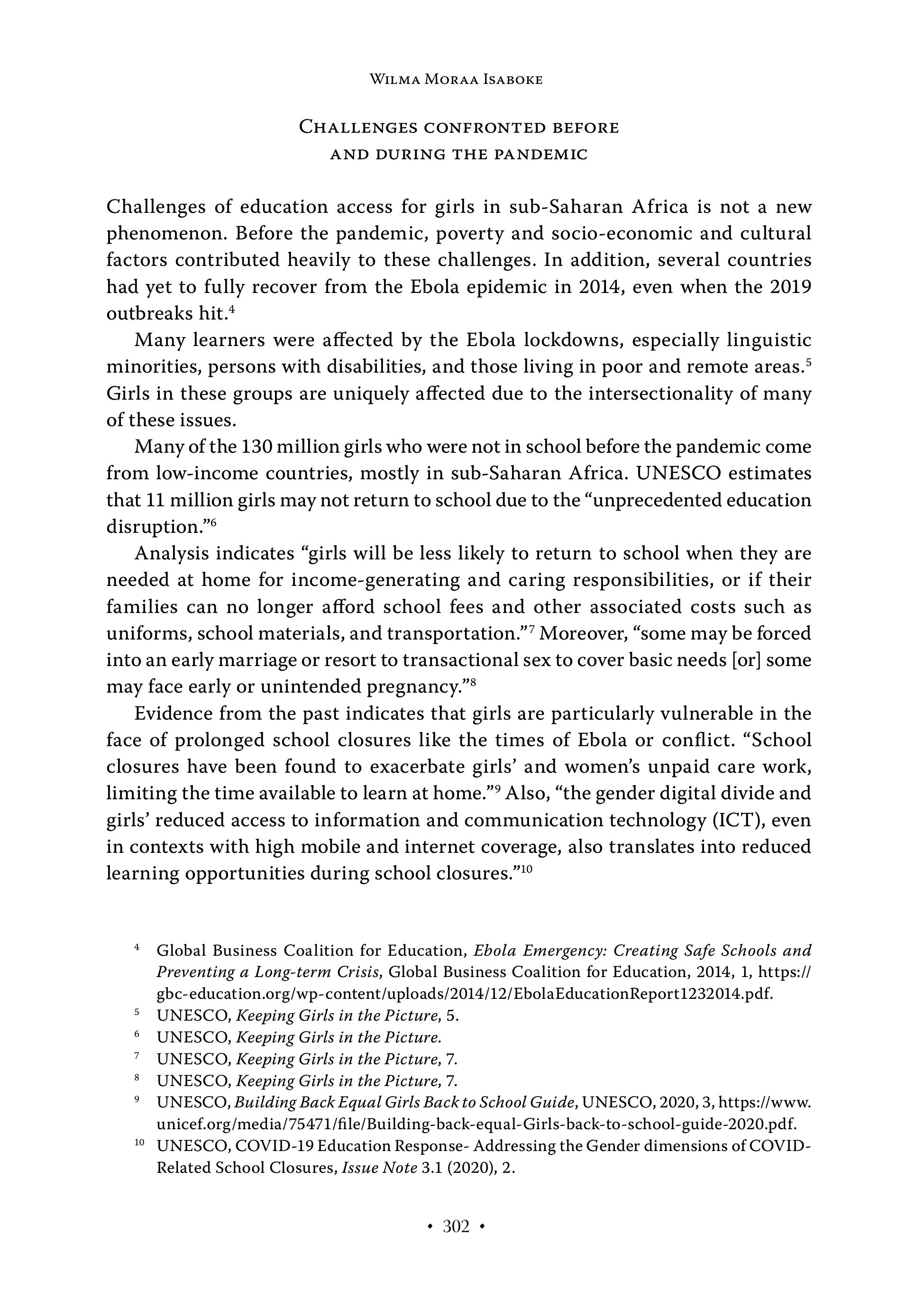WILMA MORAA ISABOKE CHALLENGES CONFRONTED BEFORE AND DURING THE PANDEMIC Challenges of education access for girls in sub-Saharan Africa is not a new phenomenon. Before the pandemic, poverty and socio-economic and cultural factors contributed heavily to these challenges. In addition, several countries had yet to fully recover from the Ebola epidemic in 2014, even when the 2019 outbreaks hit.* Many learners were affected by the Ebola lockdowns, especially linguistic minorities, persons with disabilities, and those living in poor and remote areas.’ Girls in these groups are uniquely affected due to the intersectionality of many of these issues. Many of the 130 million girls who were not in school before the pandemic come from low-income countries, mostly in sub-Saharan Africa. UNESCO estimates that 11 million girls may not return to school due to the “unprecedented education disruption.” Analysis indicates “girls will be less likely to return to school when they are needed at home for income-generating and caring responsibilities, or if their families can no longer afford school fees and other associated costs such as uniforms, school materials, and transportation.”’ Moreover, “some may be forced into an early marriage or resort to transactional sex to cover basic needs [or] some may face early or unintended pregnancy.”® Evidence from the past indicates that girls are particularly vulnerable in the face of prolonged school closures like the times of Ebola or conflict. “School closures have been found to exacerbate girls’ and women’s unpaid care work, limiting the time available to learn at home.”? Also, “the gender digital divide and girls’ reduced access to information and communication technology (ICT), even in contexts with high mobile and internet coverage, also translates into reduced learning opportunities during school closures.” * Global Business Coalition for Education, Ebola Emergency: Creating Safe Schools and Preventing a Long-term Crisis, Global Business Coalition for Education, 2014, 1, https:// gbc-education.org/wp-content/uploads/2014/12/EbolaEducationReport1232014.pdf. 5; UNESCO, Keeping Girls in the Picture, 5. ® UNESCO, Keeping Girls in the Picture. 7 UNESCO, Keeping Girls in the Picture, 7. 8 UNESCO, Keeping Girls in the Picture, 7. ° UNESCO, Building Back Equal Girls Back to School Guide, UNESCO, 2020, 3, https://www. unicef.org/media/75471/file/Building-back-equal-Girls-back-to-school-guide-2020.pdf. 10 UNESCO, COVID-19 Education Response- Addressing the Gender dimensions of COVIDRelated School Closures, Issue Note 3.1 (2020), 2. s 302 "