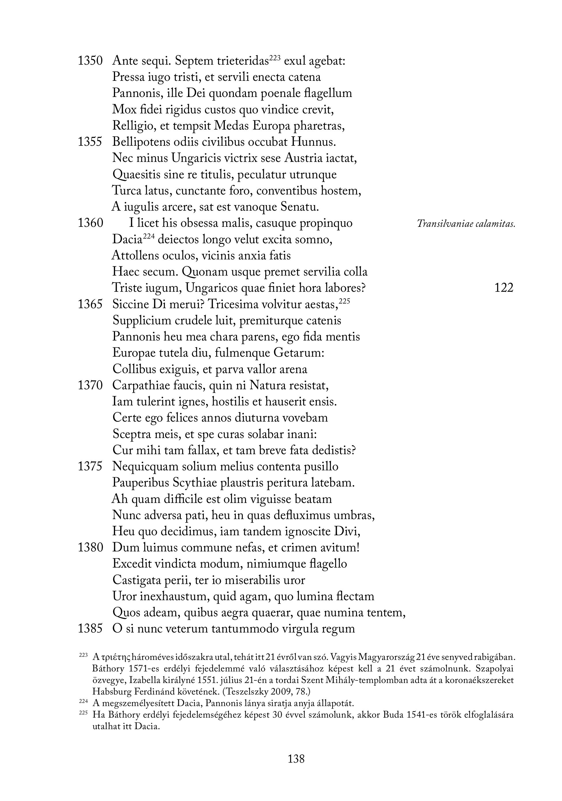 1350 1355 1360 1365 1370 1375 1380 1385 Ante segui. Septem trieteridas? exul agebat: Pressa iugo tristi, et servili enecta catena Pannonis, ille Dei quondam poenale flagellum Mox fidei rigidus custos quo vindice crevit, Relligio, et tempsit Medas Europa pharetras, Bellipotens odiis civilibus occubat Hunnus. Nec minus Ungaricis victrix sese Austria iactat, Quaesitis sine re titulis, peculatur utrunque Turca latus, cunctante foro, conventibus hostem, A iugulis arcere, sat est vanoque Senatu. I licet his obsessa malis, casuque propinquo Transilvaniae calamitas. Dacia? deiectos longo velut excita somno, Attollens oculos, vicinis anxia fatis Haec secum. Quonam usque premet servilia colla Triste iugum, Ungaricos quae finiet hora labores? 122 Siccine Di merui? Tricesima volvitur aestas,?”° Supplicium crudele luit, premiturque catenis Pannonis heu mea chara parens, ego fida mentis Europae tutela diu, fulmenque Getarum: Collibus exiguis, et parva vallor arena Carpathiae faucis, quin ni Natura resistat, Iam tulerint ignes, hostilis et hauserit ensis. Certe ego felices annos diuturna vovebam Sceptra meis, et spe curas solabar inani: Cur mihi tam fallax, et tam breve fata dedistis? Nequicquam solium melius contenta pusillo Pauperibus Scythiae plaustris peritura latebam. Ah quam difficile est olim viguisse beatam Nunc adversa pati, heu in quas defluximus umbras, Heu quo decidimus, iam tandem ignoscite Divi, Dum luimus commune nefas, et crimen avitum! Excedit vindicta modum, nimiumque flagello Castigata perii, ter io miserabilis uror Uror inexhaustum, quid agam, quo lumina flectam Quos adeam, quibus aegra quaerar, quae numina tentem, O si nunc veterum tantummodo virgula regum 138