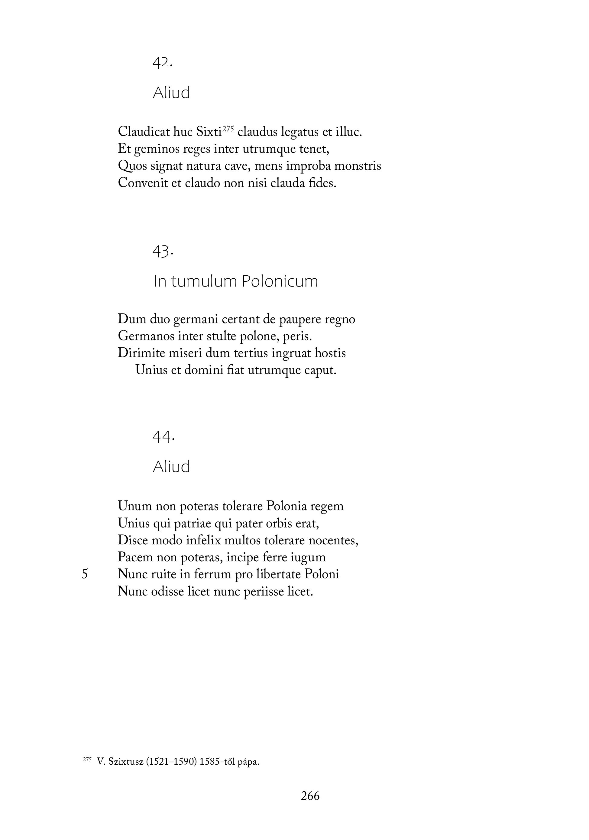 42. Aliud Claudicat huc Sixti?" claudus legatus et illuc. Et geminos reges inter utrumque tenet, Quos signat natura cave, mens improba monstris Convenit et claudo non nisi clauda fides. 43. In tumulum Polonicum Dum duo germani certant de paupere regno Germanos inter stulte polone, peris. Dirimite miseri dum tertius ingruat hostis Unius et domini fiat utrumque caput. 44. Aliud Unum non poteras tolerare Polonia regem Unius qui patriae qui pater orbis erat, Disce modo infelix multos tolerare nocentes, Pacem non poteras, incipe ferre iugum 5 Nunc ruite in ferrum pro libertate Poloni Nunc odisse licet nunc periisse licet. 25 V7. Szixtusz (1521-1590) 1585-tél papa. 266